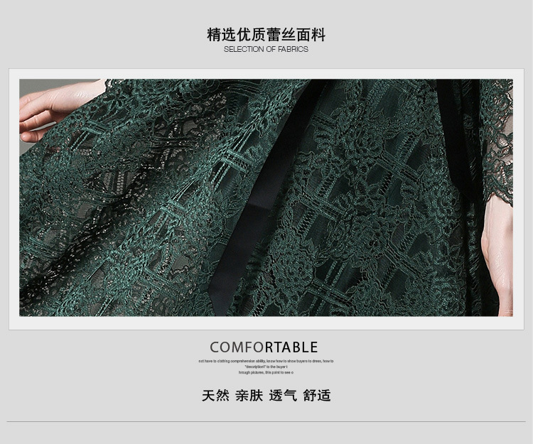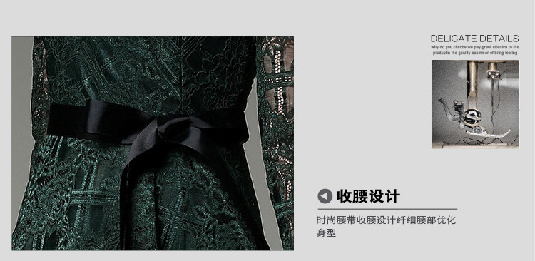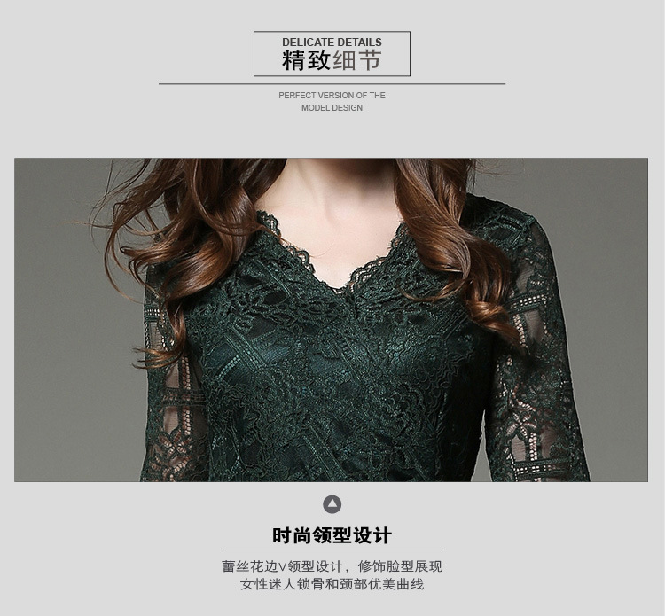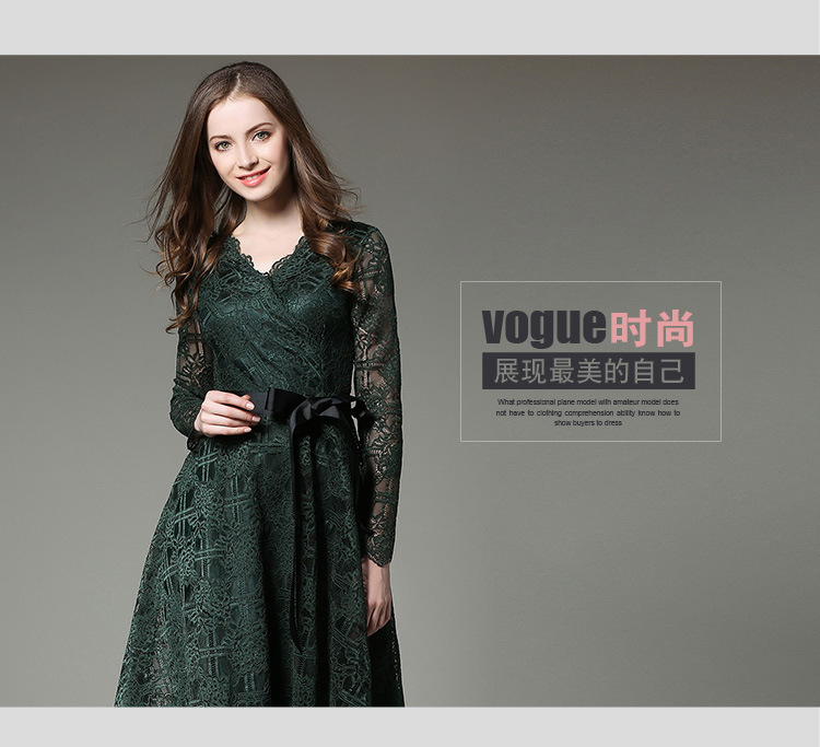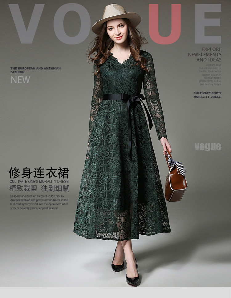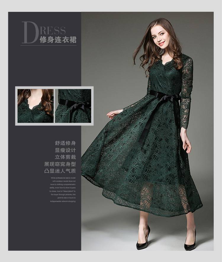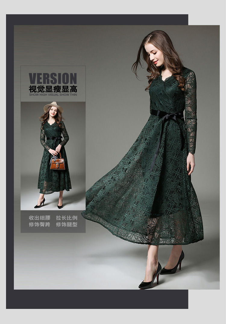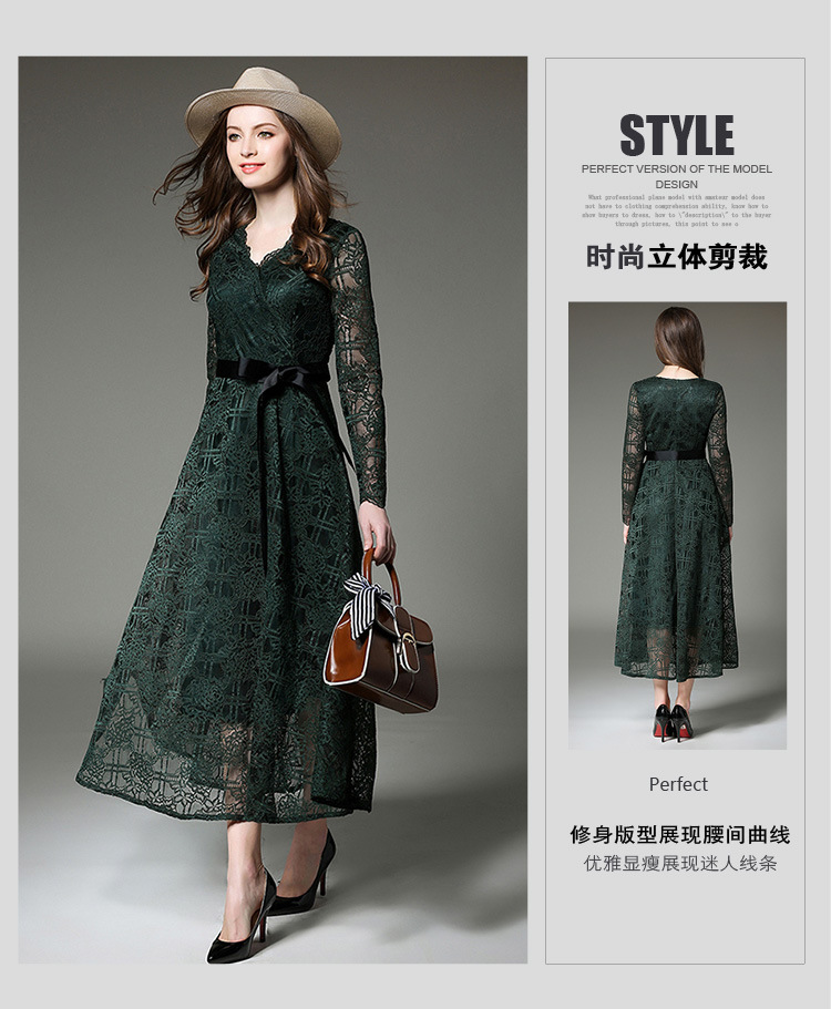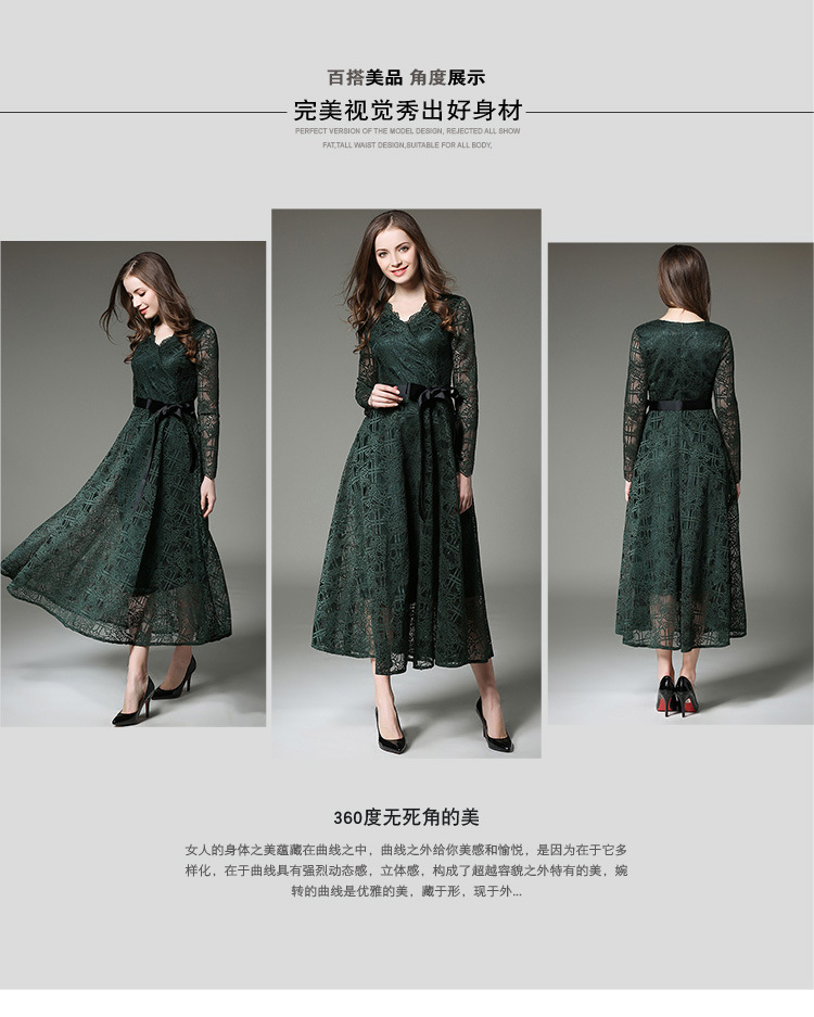 【服饰鞋包】春季新款女装欧美时尚长裙修身显瘦长袖V领蕾丝连衣裙外贸