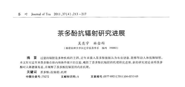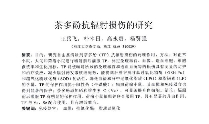 2023年日本大量排放 导致水中含有铀、铯等放射性物质, 其衰变释放的α、β等射线可引发基因突变, 长期接触将导致辐射危害在生态链中持续累积 多个专家曾发表茶多酚抗辐射损伤的研究 浙大实验室证实:龙井茶多酚抗辐射能力超绿茶均值37%