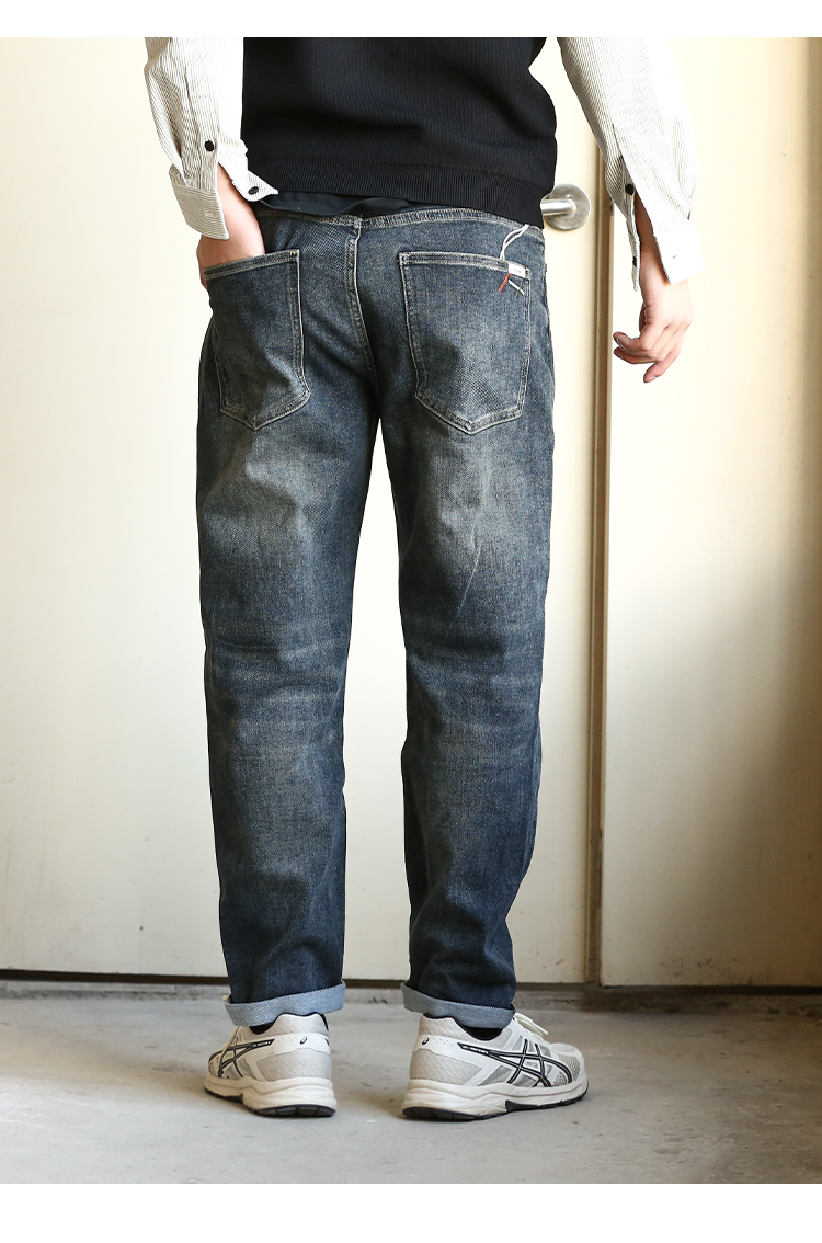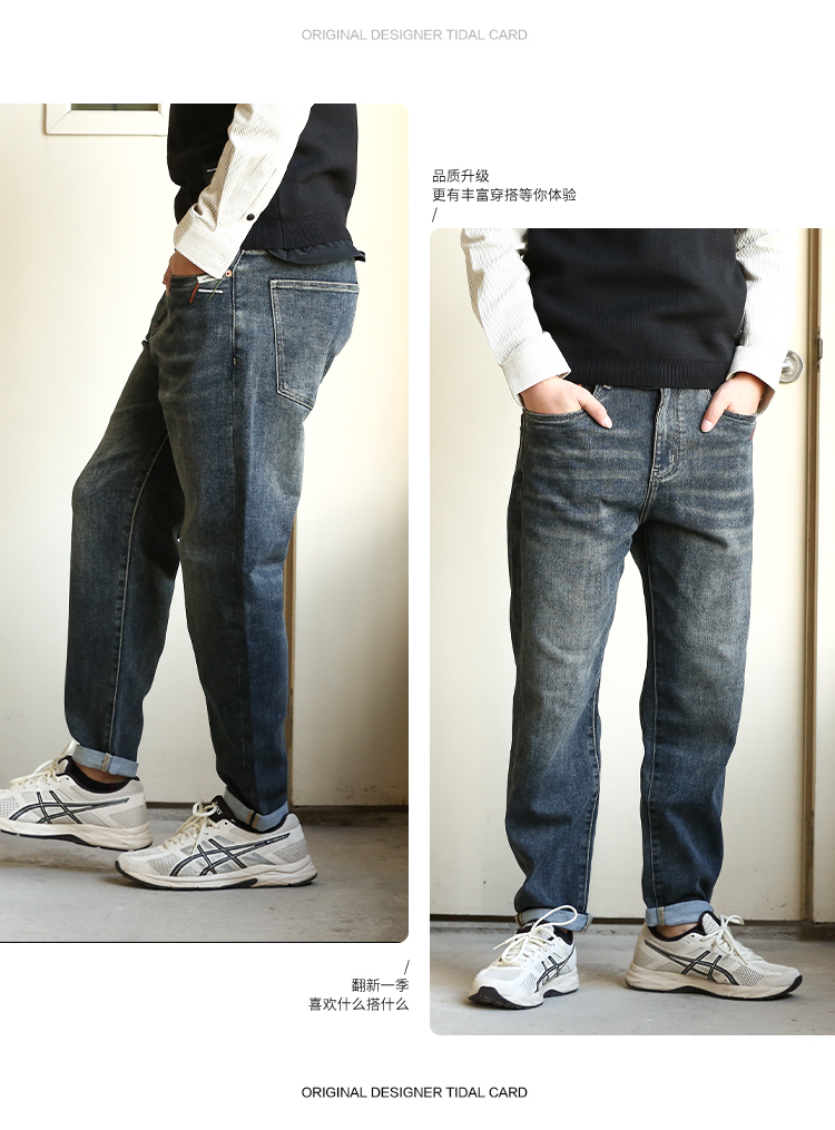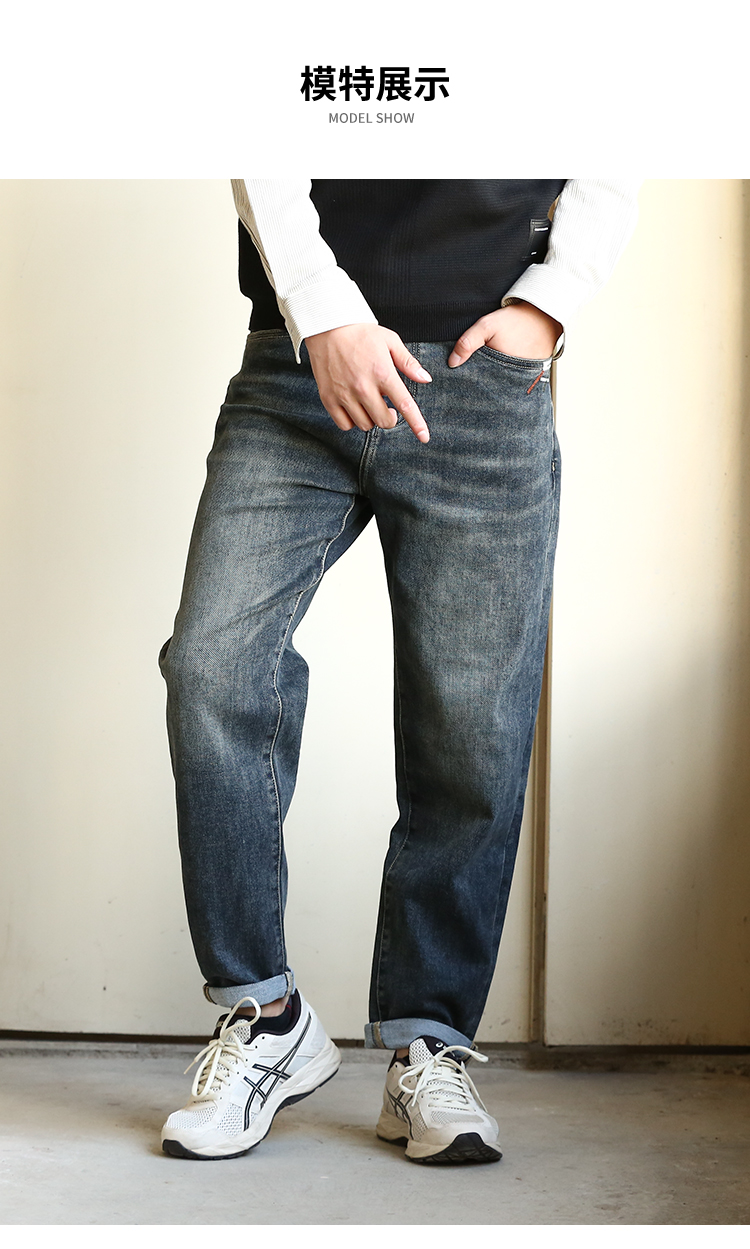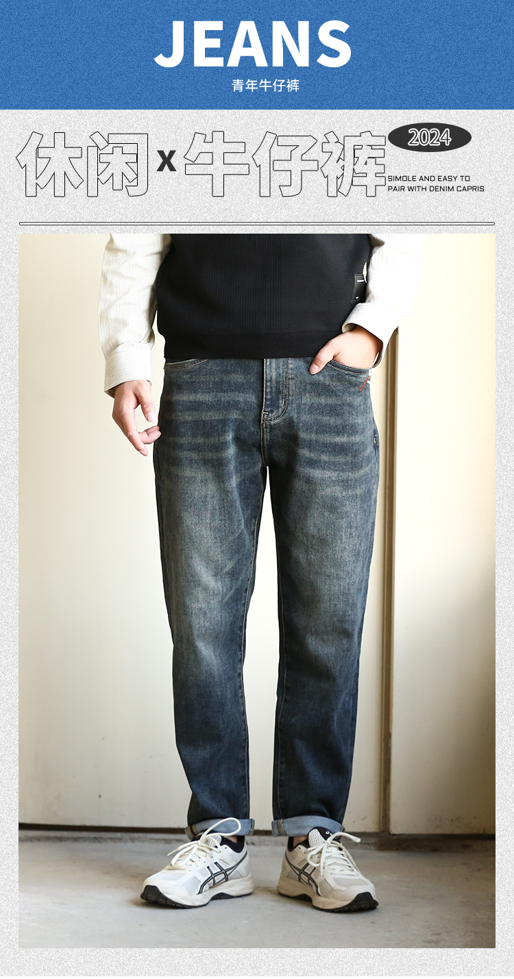 DRONKOO 2024 正常腰前左袋红绿白折线刺绣中厚牛仔长裤