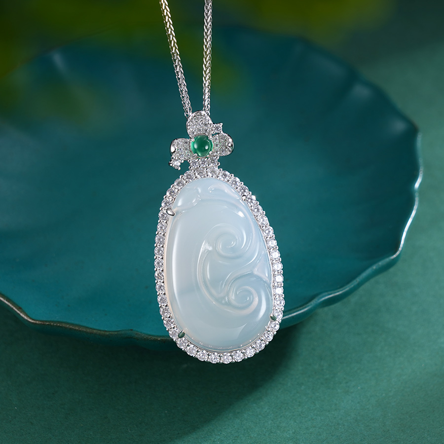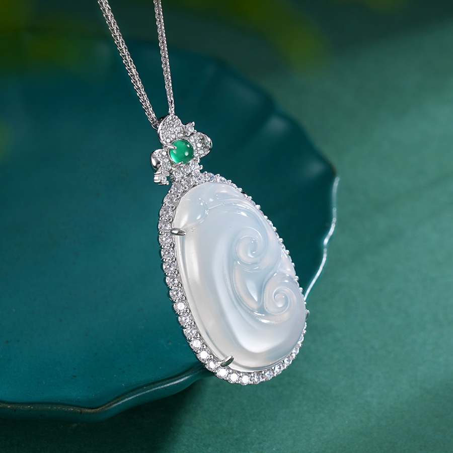 【寓意】:吊坠之上錾刻着细腻的水波纹,玉髓材质的独特性,使之呈现出澄澈透明的质感。佩戴者的每一次移动,水浪仿佛都随之波动、翻转,兼具动态之美,更寓意着遇水则生财,好运连连。
