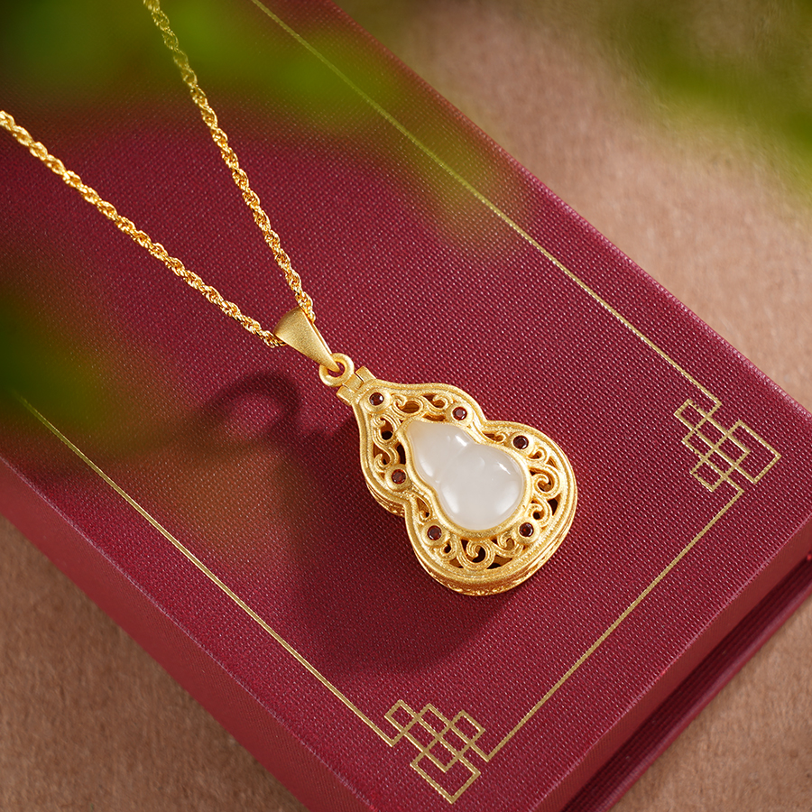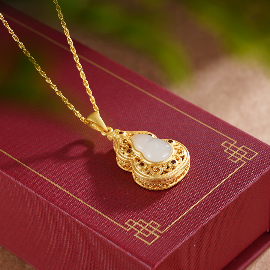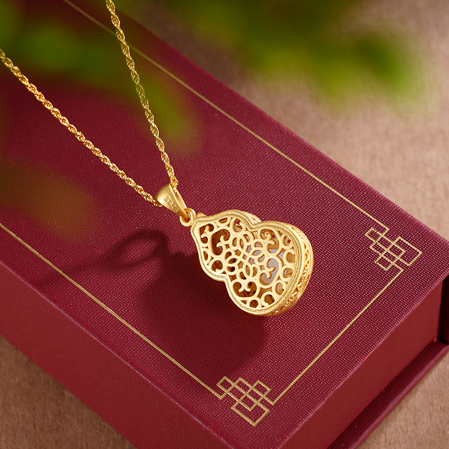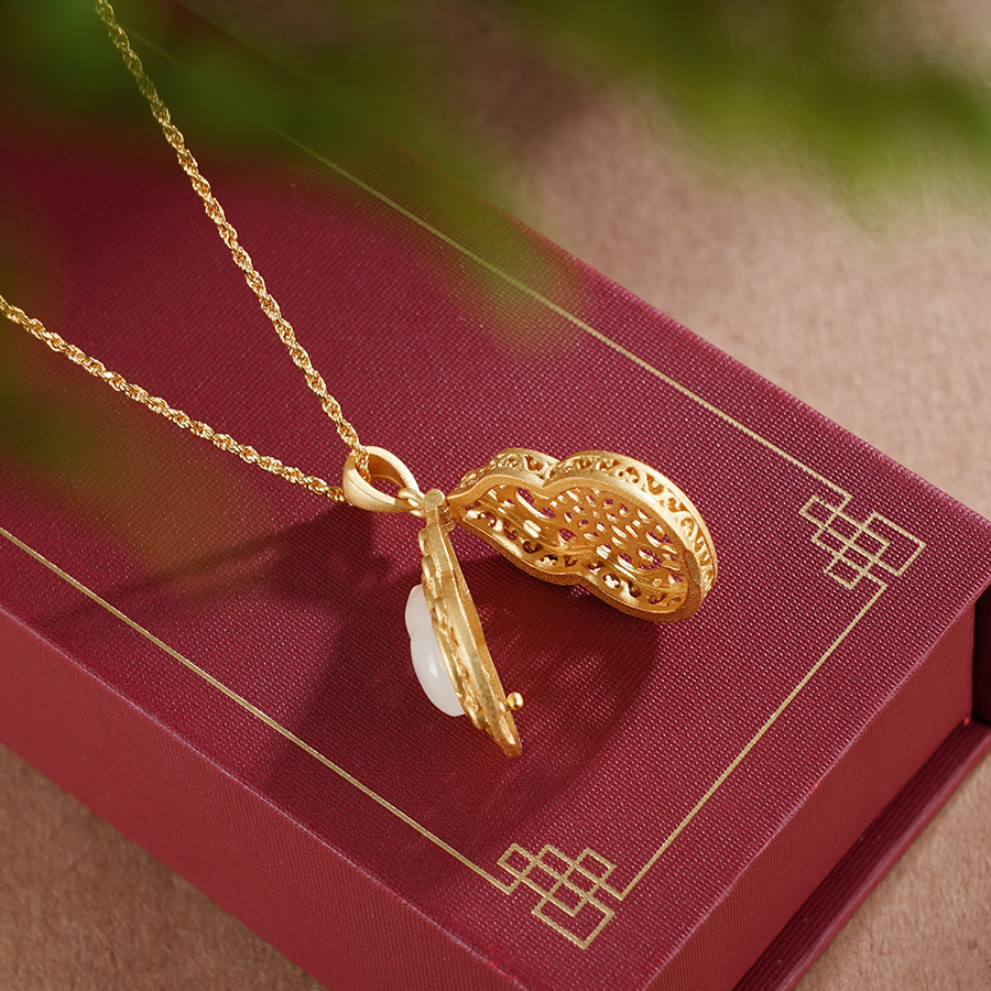 【寓意】:吊坠采用大小葫芦套嵌工艺。镀金工艺所呈现的华丽光芒,与和田的所散发的温润气质交织交融,宛如为肌肤镀上了一层柔光滤镜。