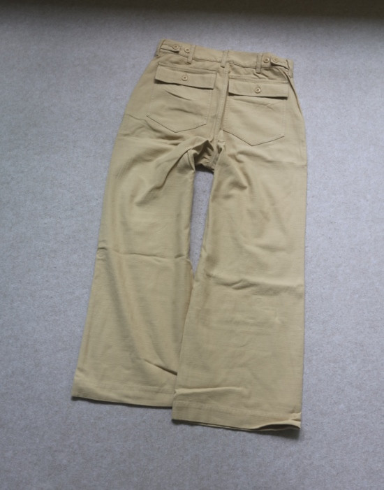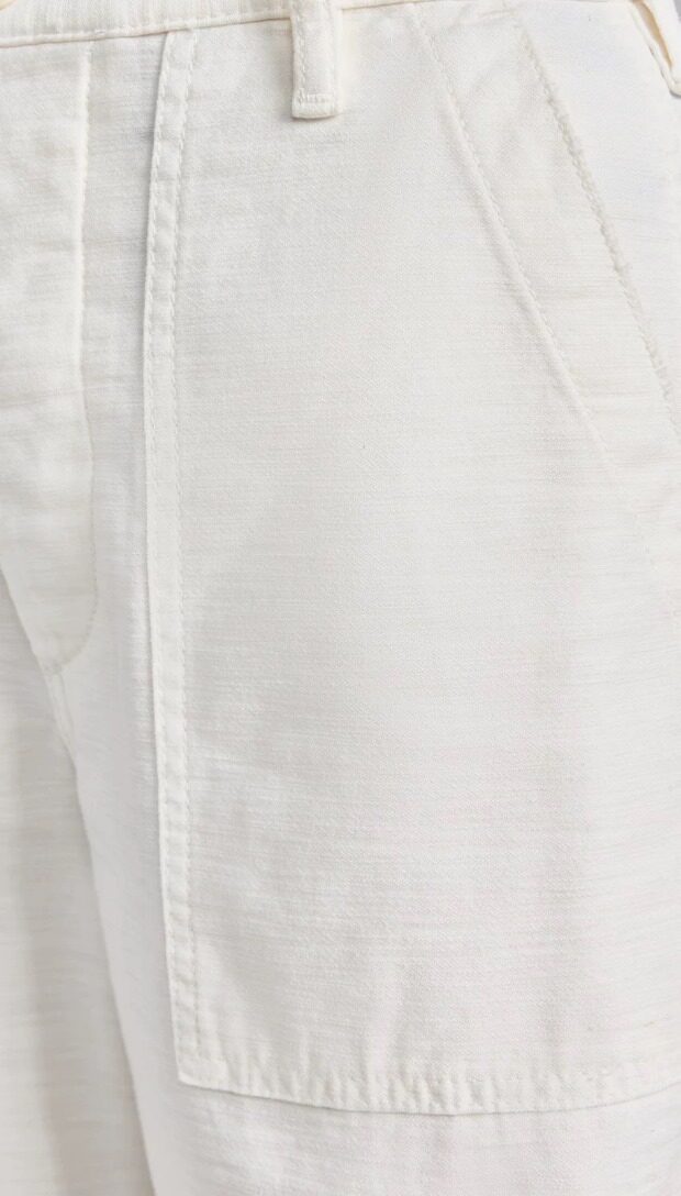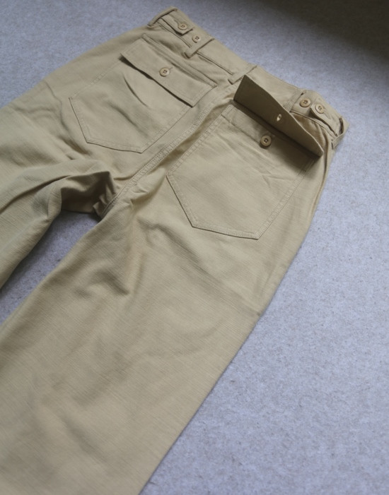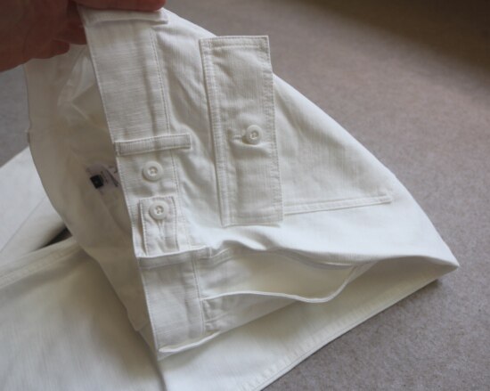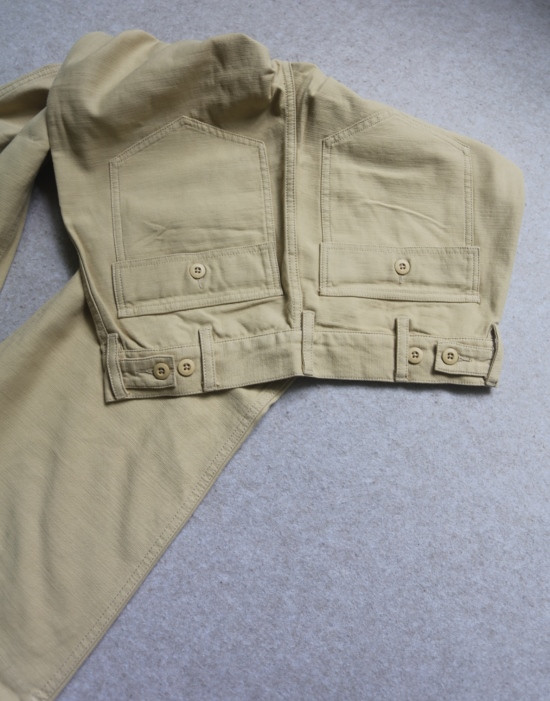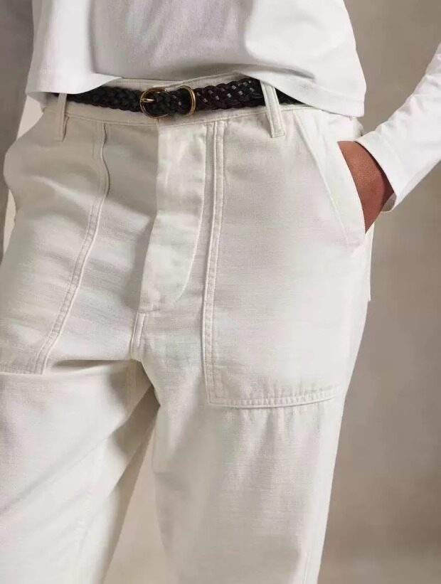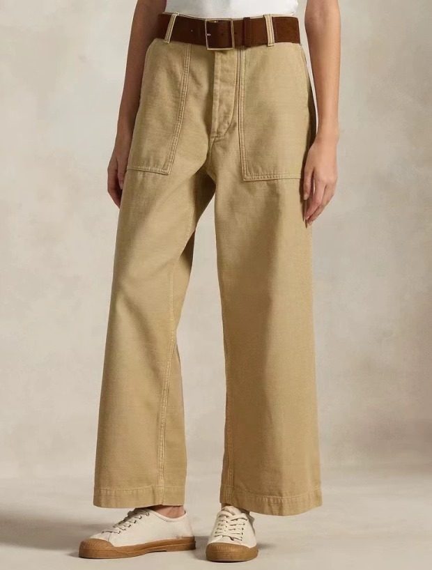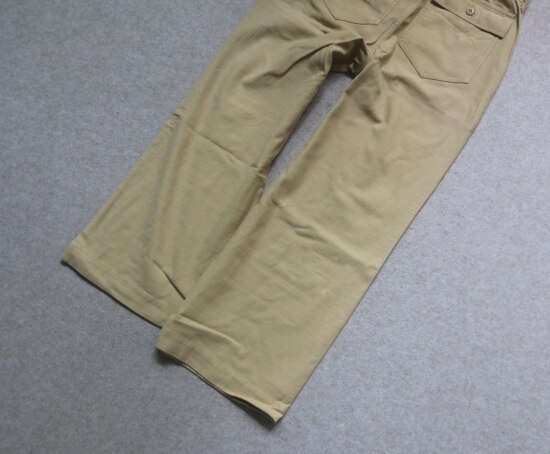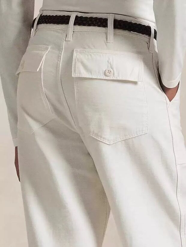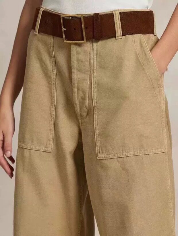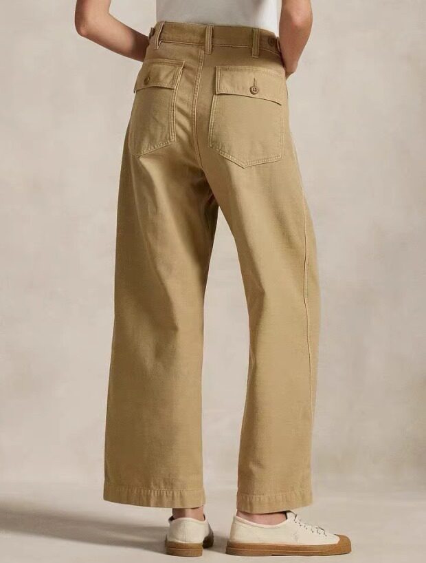 腰间可提到肚脐 裤襟是隐藏式的纽扣 两侧斜插式口袋 后面两个翻盖屁兜