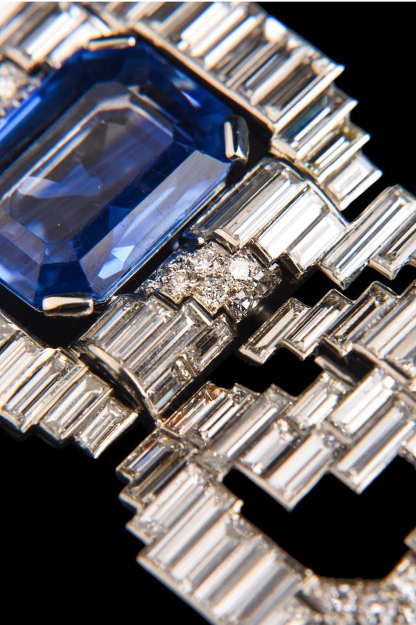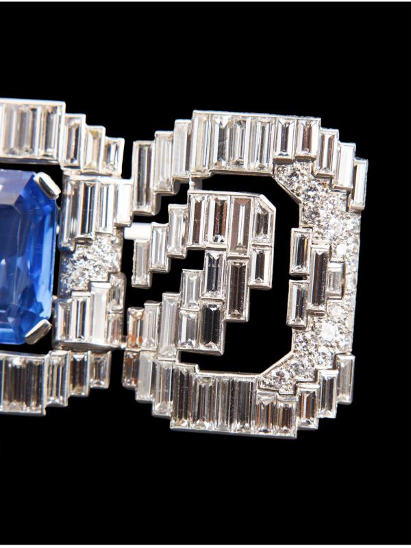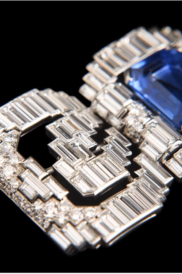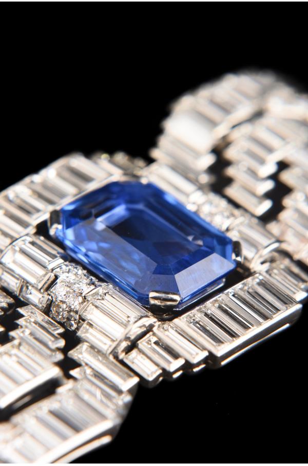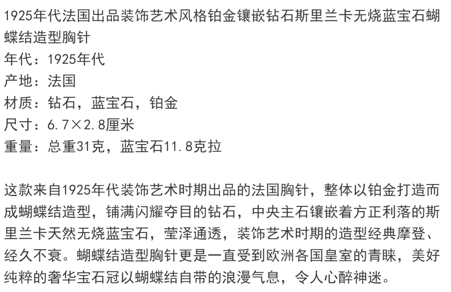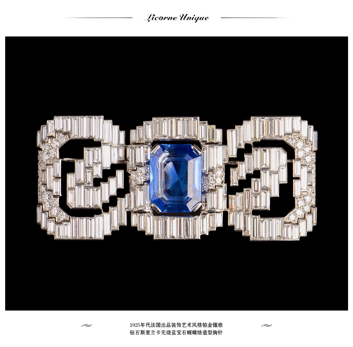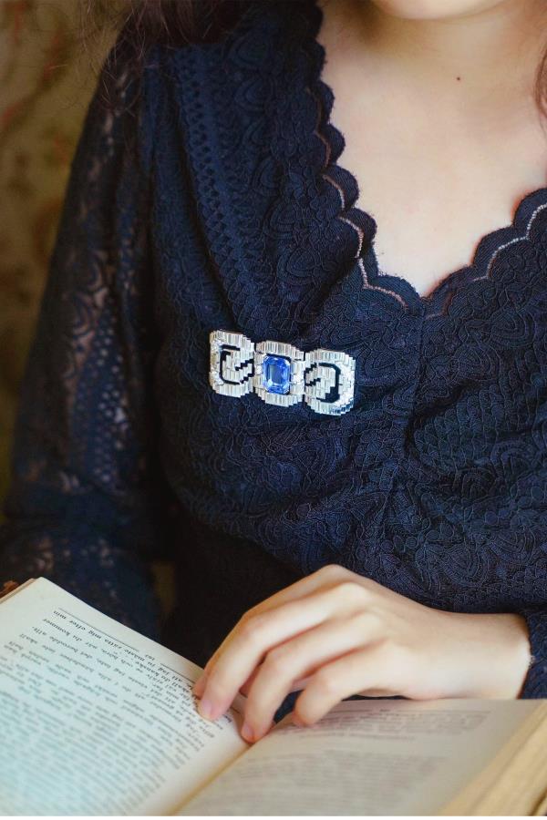 独角鹿西洋古董珠宝法国铂金镶钻石斯里兰卡无烧蓝宝石蝴蝶结胸针
