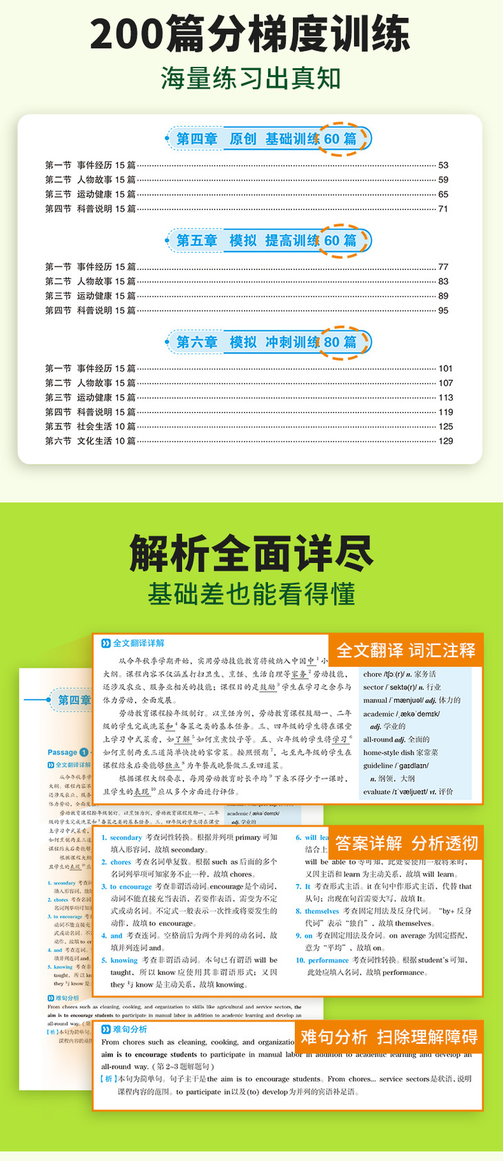 2.解析详细,包括全文翻译、词汇注释、难句分析,免查词典,基础差也看得懂;