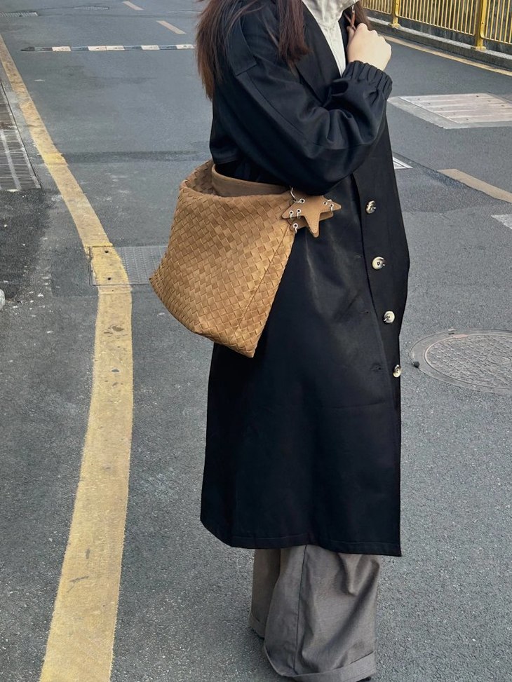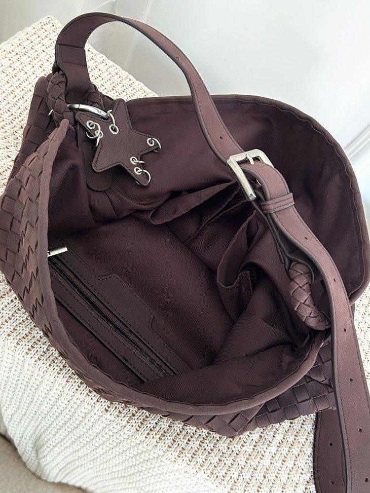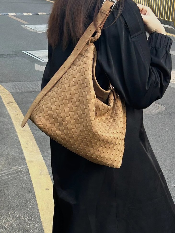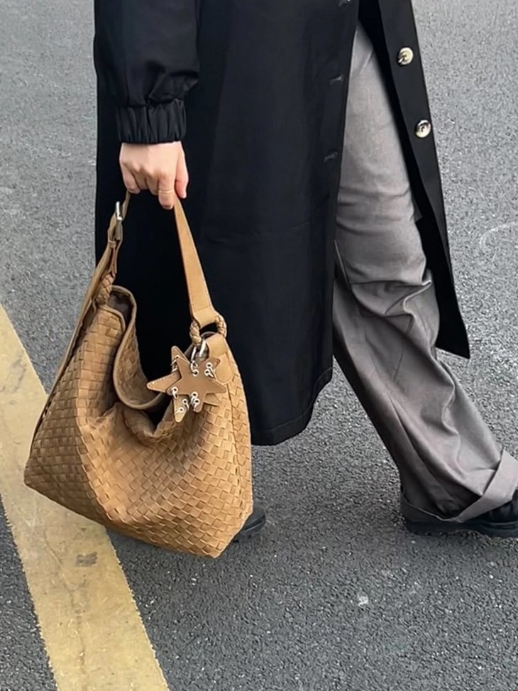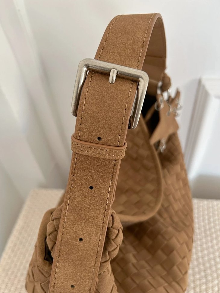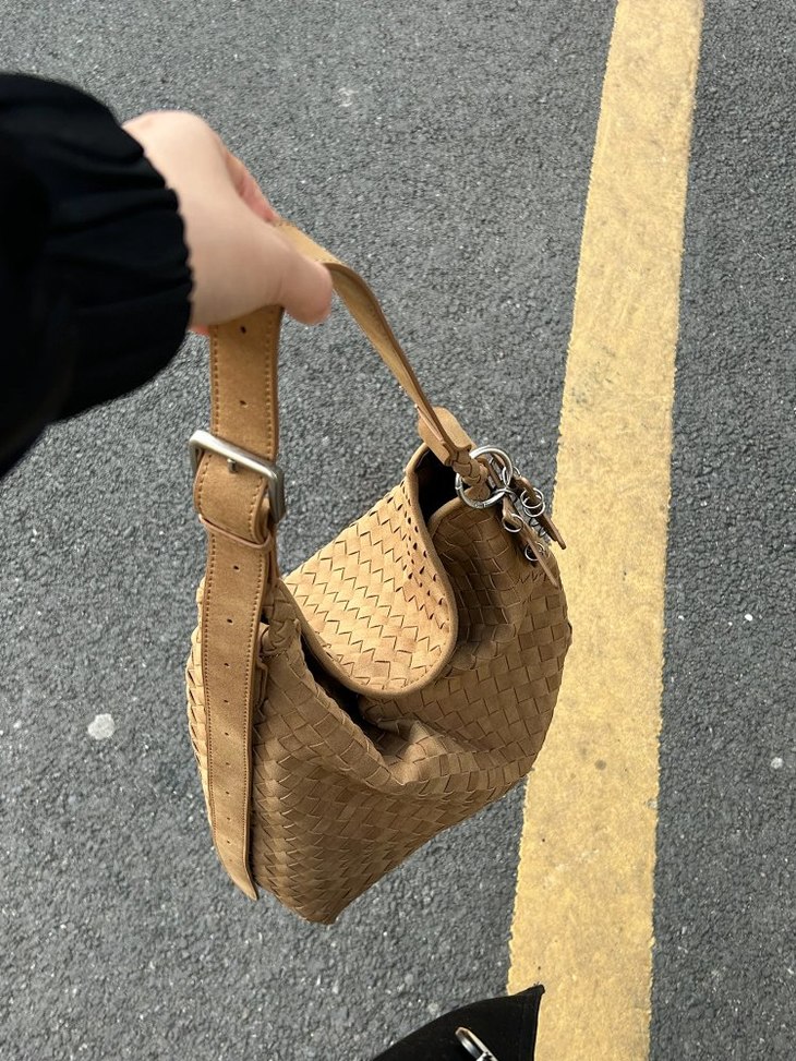 能根据穿搭需求调整长度(适配单肩 / 斜跨),肩带与包身衔接处做了编织收边处理,既加固了受力点,也让细节更精致