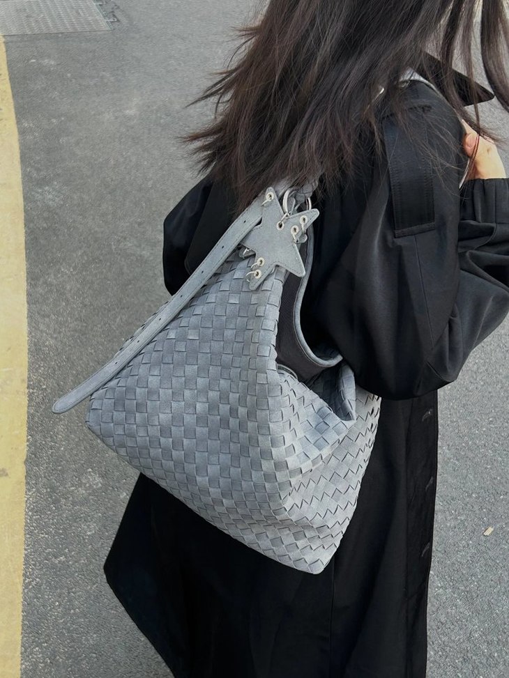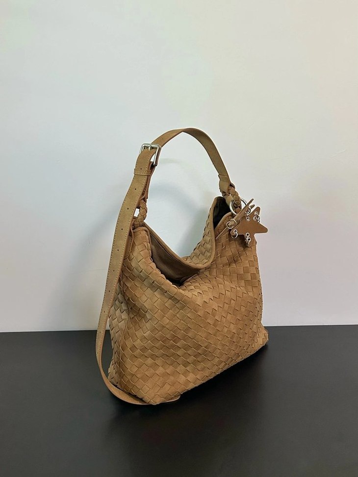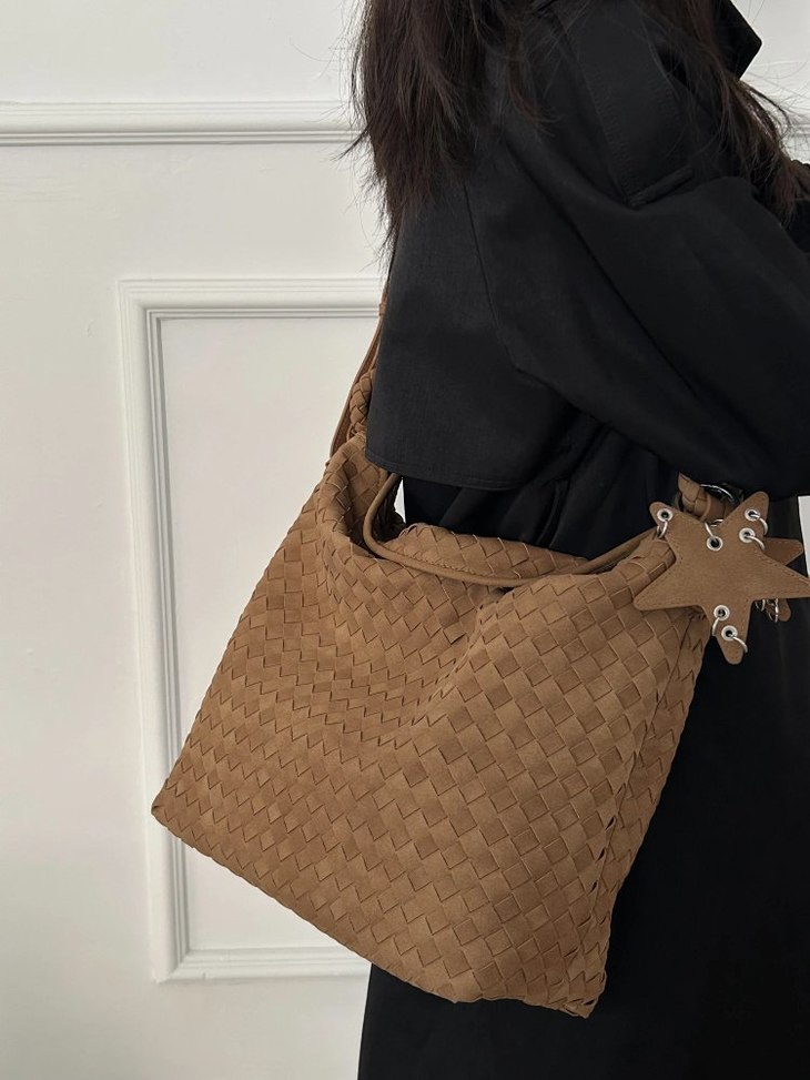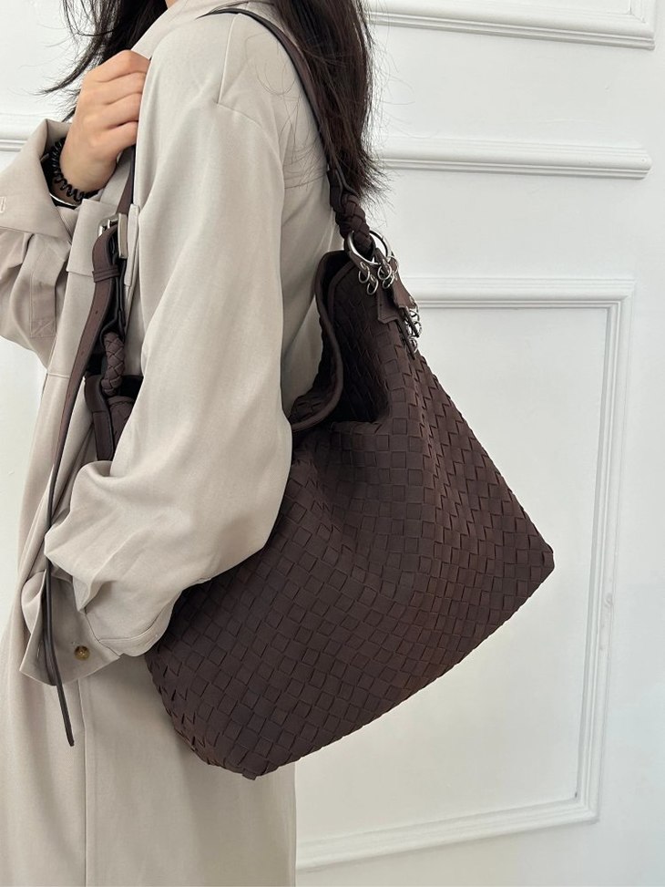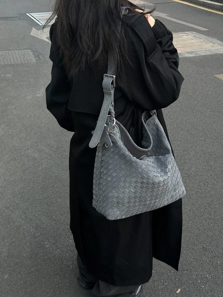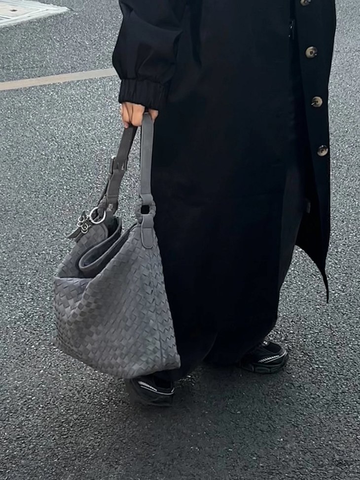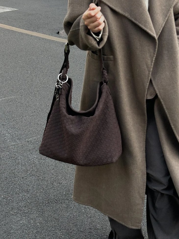 编织纹理覆盖包身、包边甚至肩带衔接处,让整体风格更统一,摸起来有凹凸的层次触感,比光滑皮质多了几分复古腔调