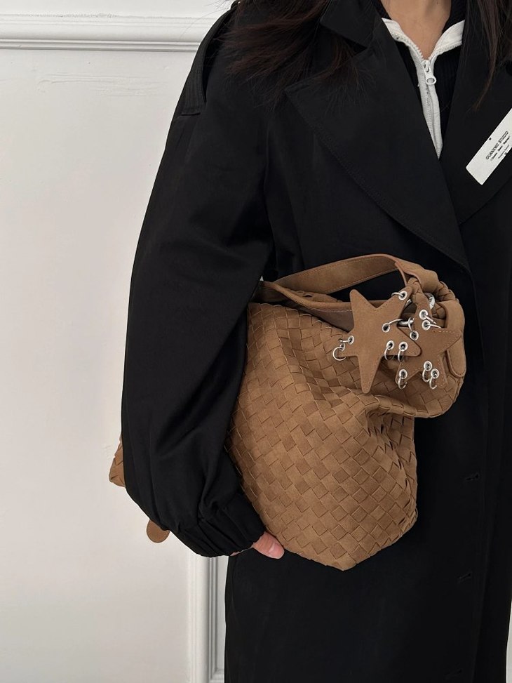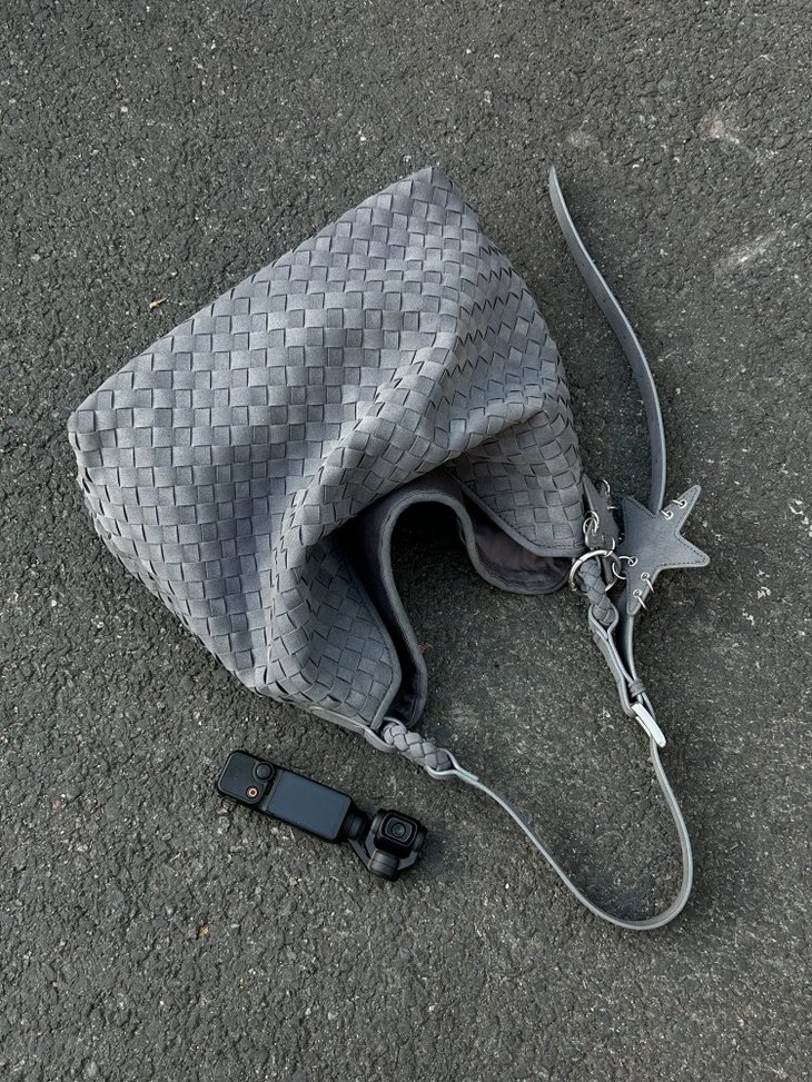 PU 磨砂皮裁成细条,通过交叉交织的方式织出规整的格纹肌理😍保留了手工编织的松弛感,又不会显得杂乱