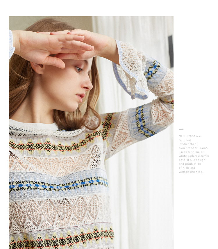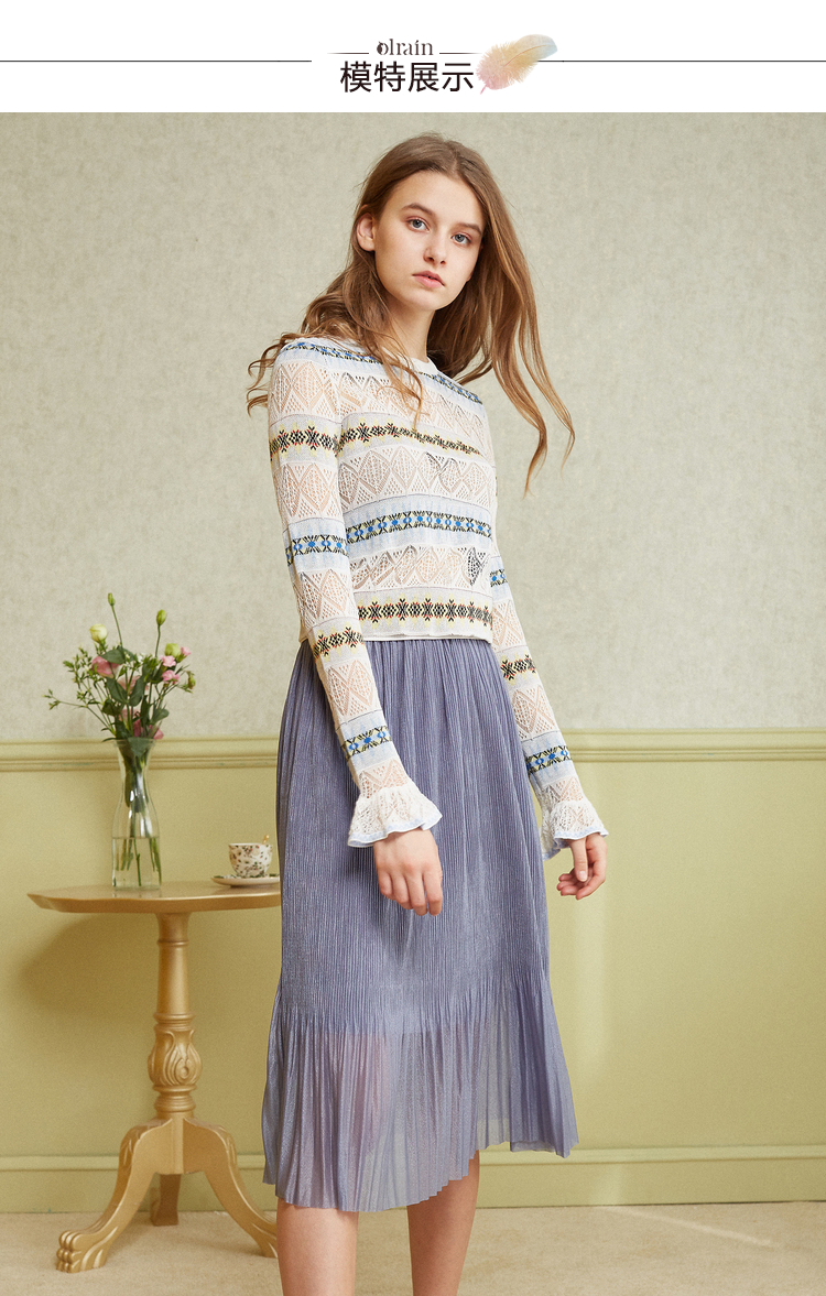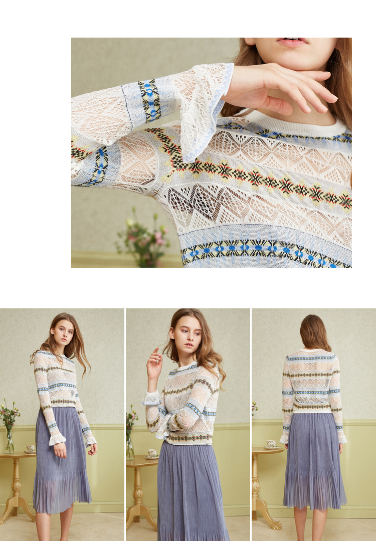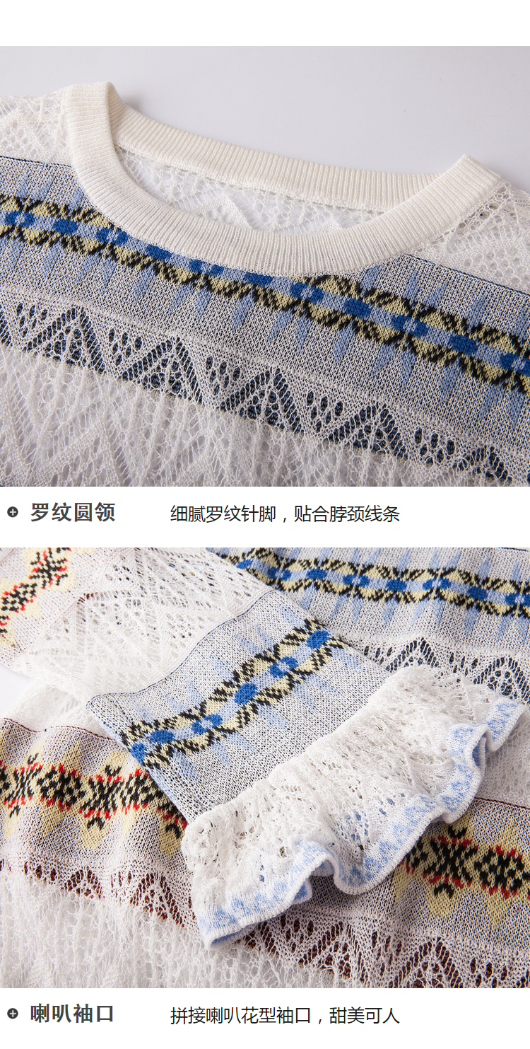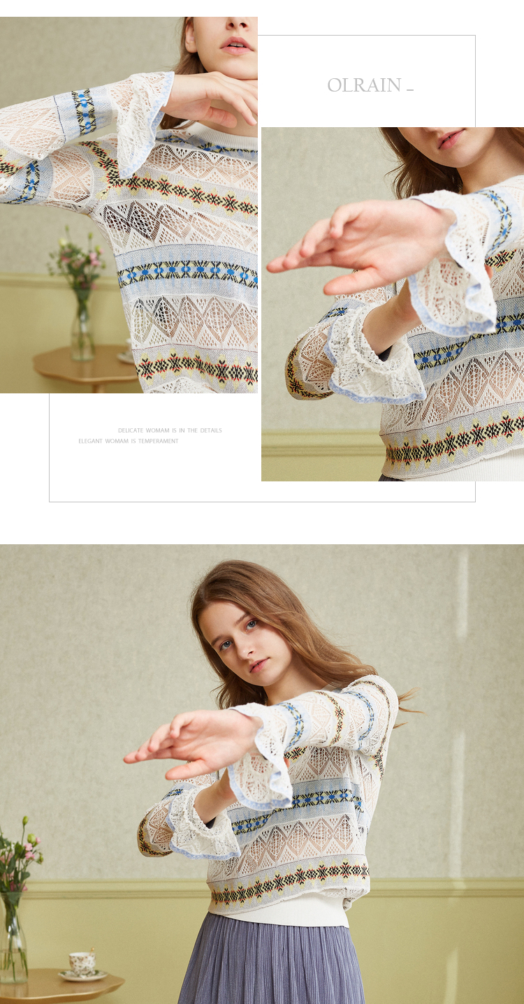 欧芮儿提花喇叭袖针织衫女套头镂空长袖打底衫2019秋