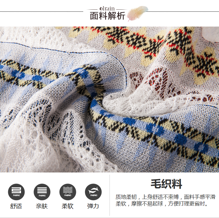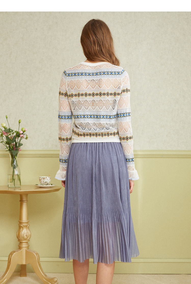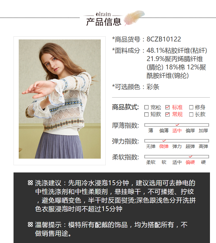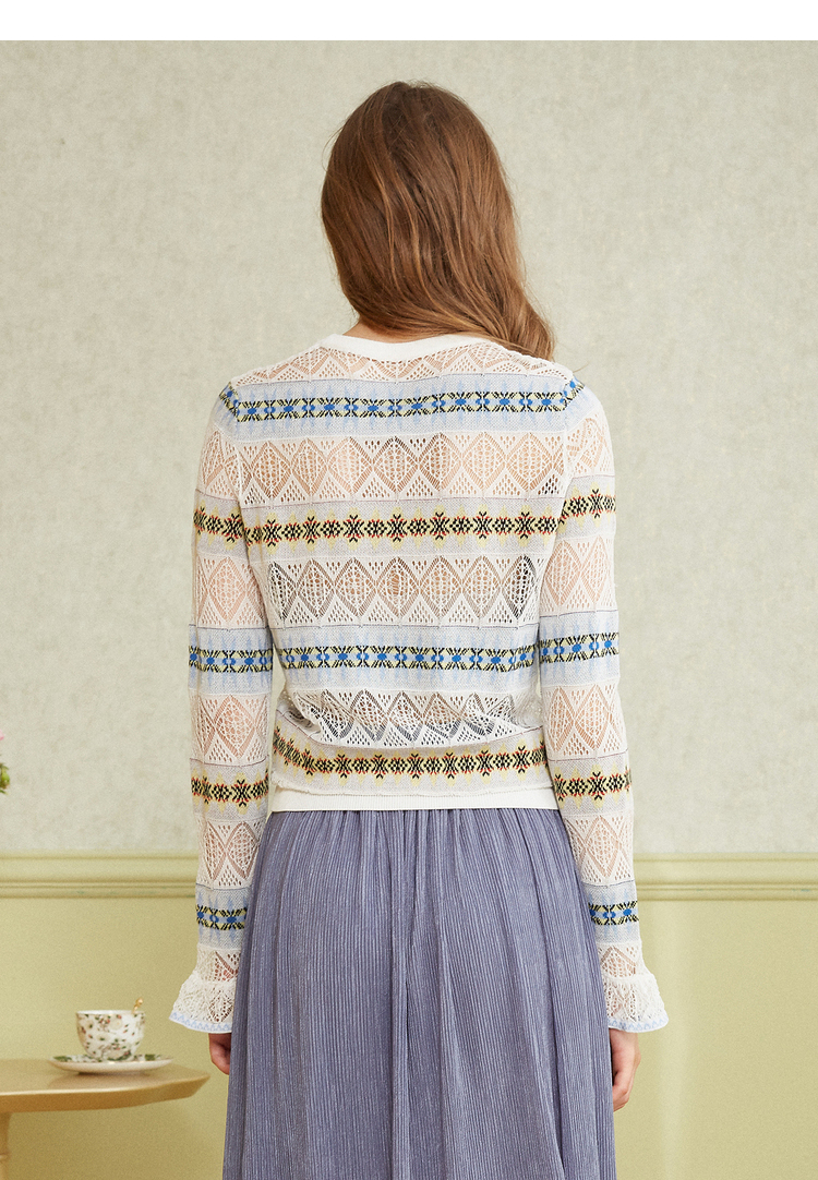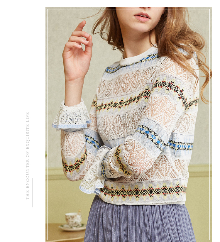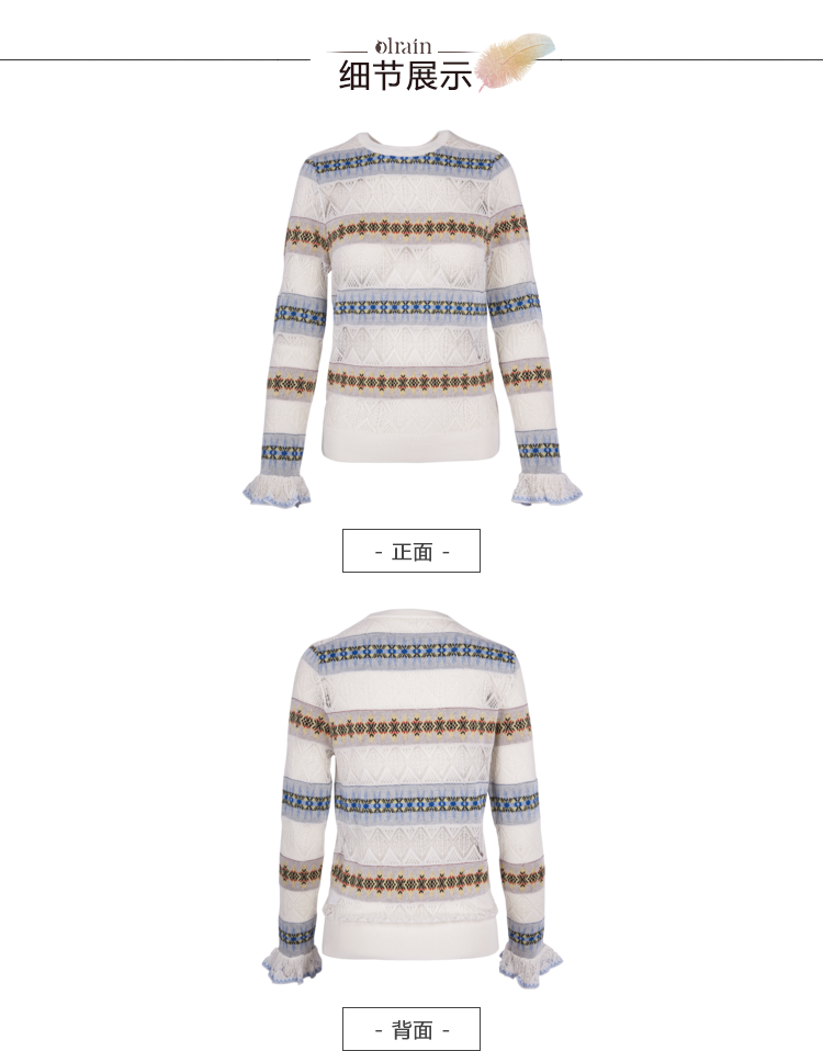 欧芮儿提花喇叭袖针织衫女套头镂空长袖打底衫2019秋