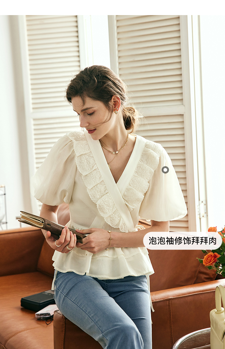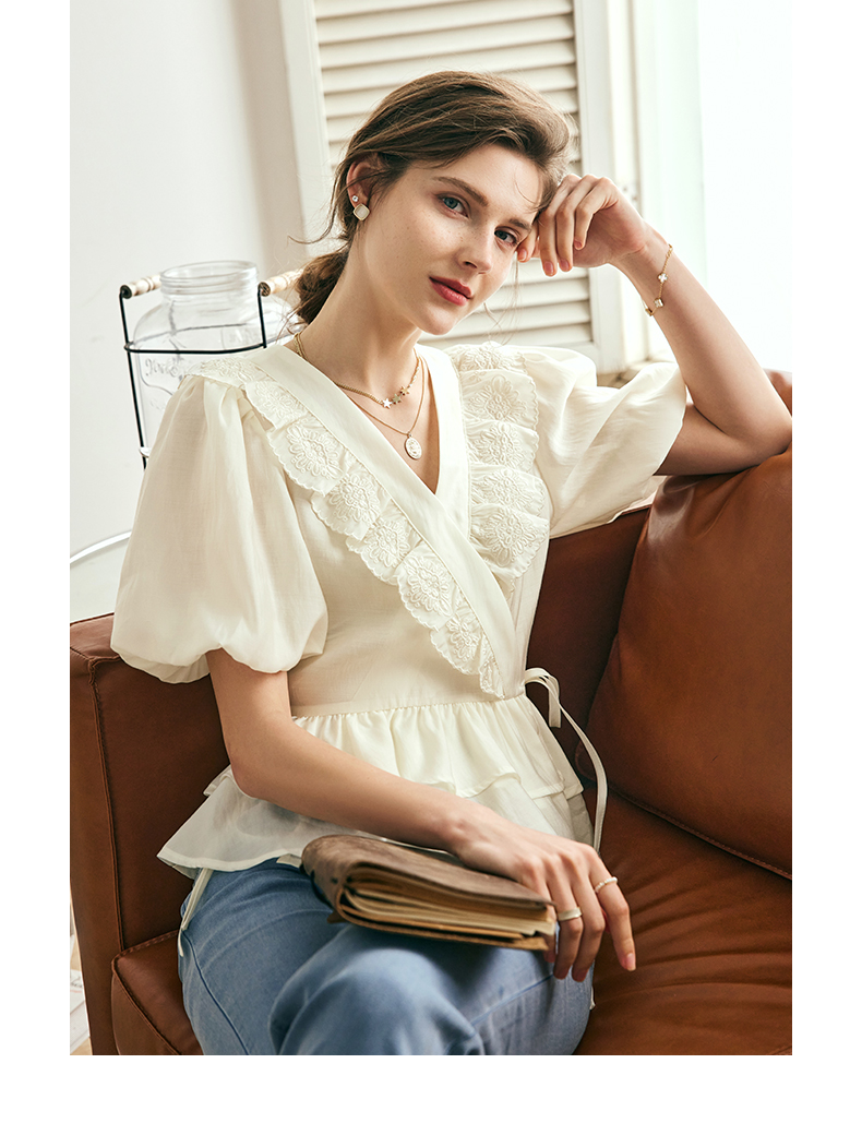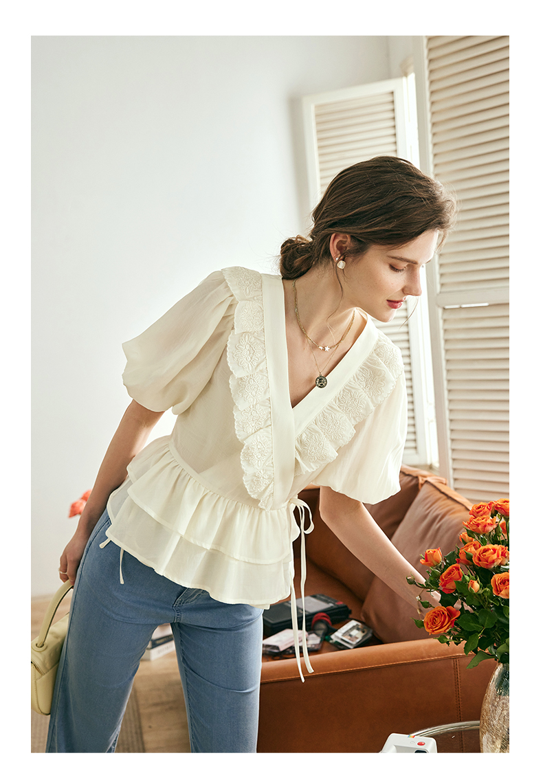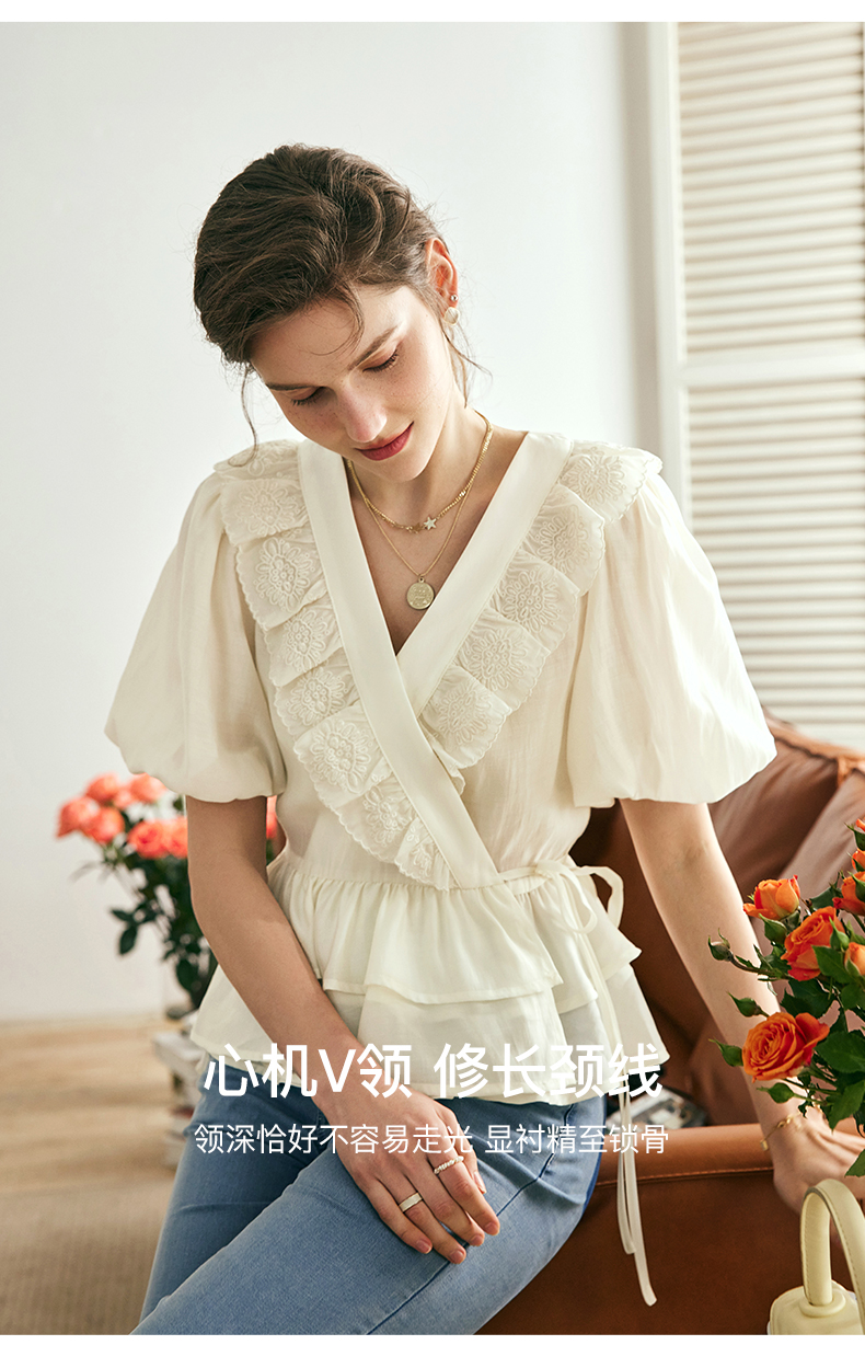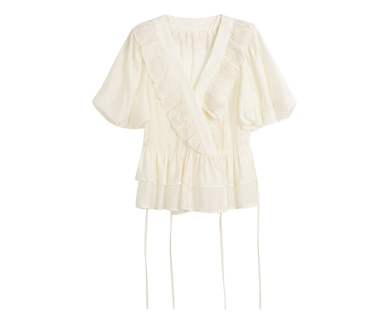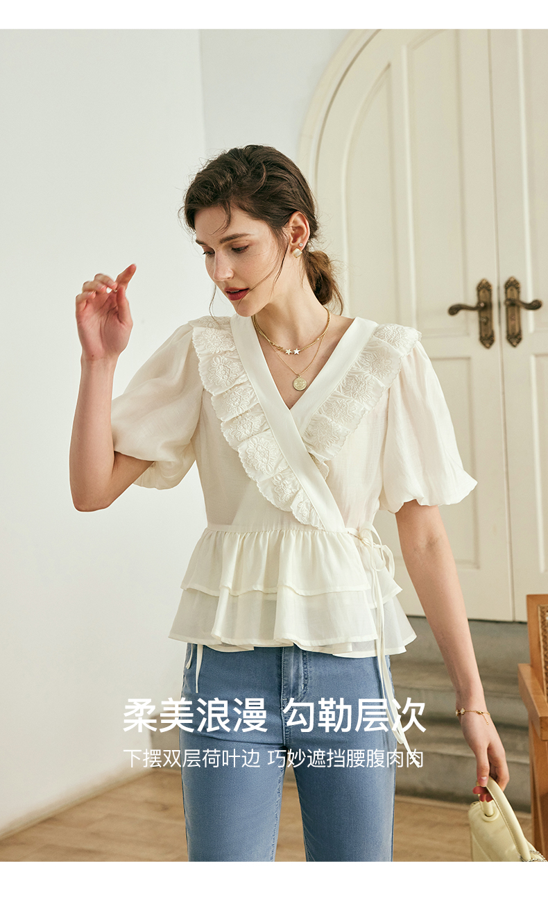 OLrain欧芮儿法式V领蕾丝雪纺衫女夏季2023年新款荷叶边甜美小衫