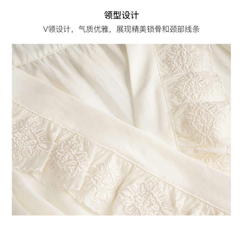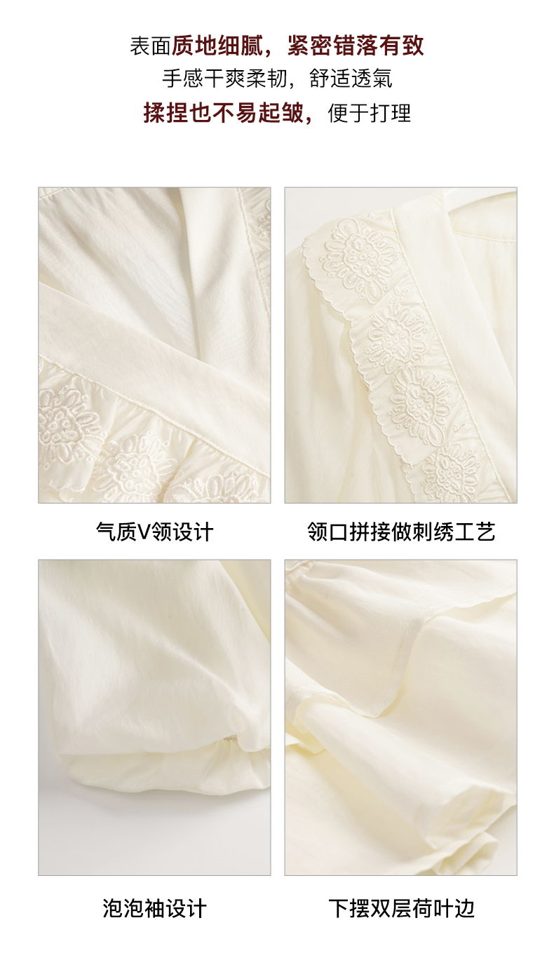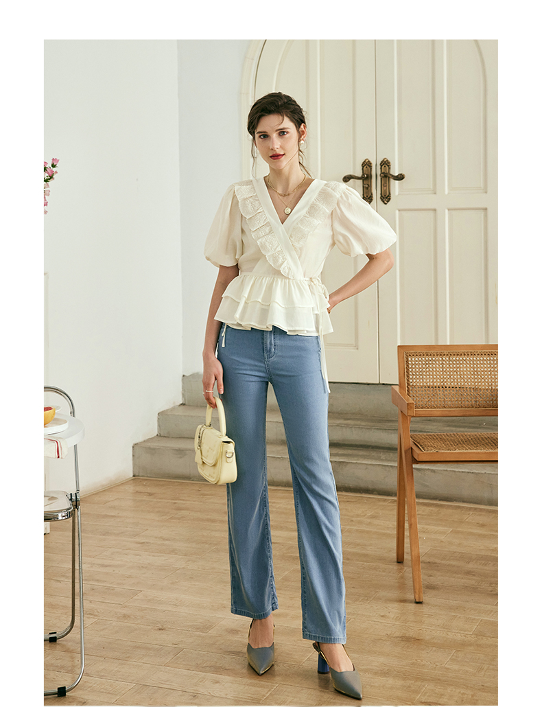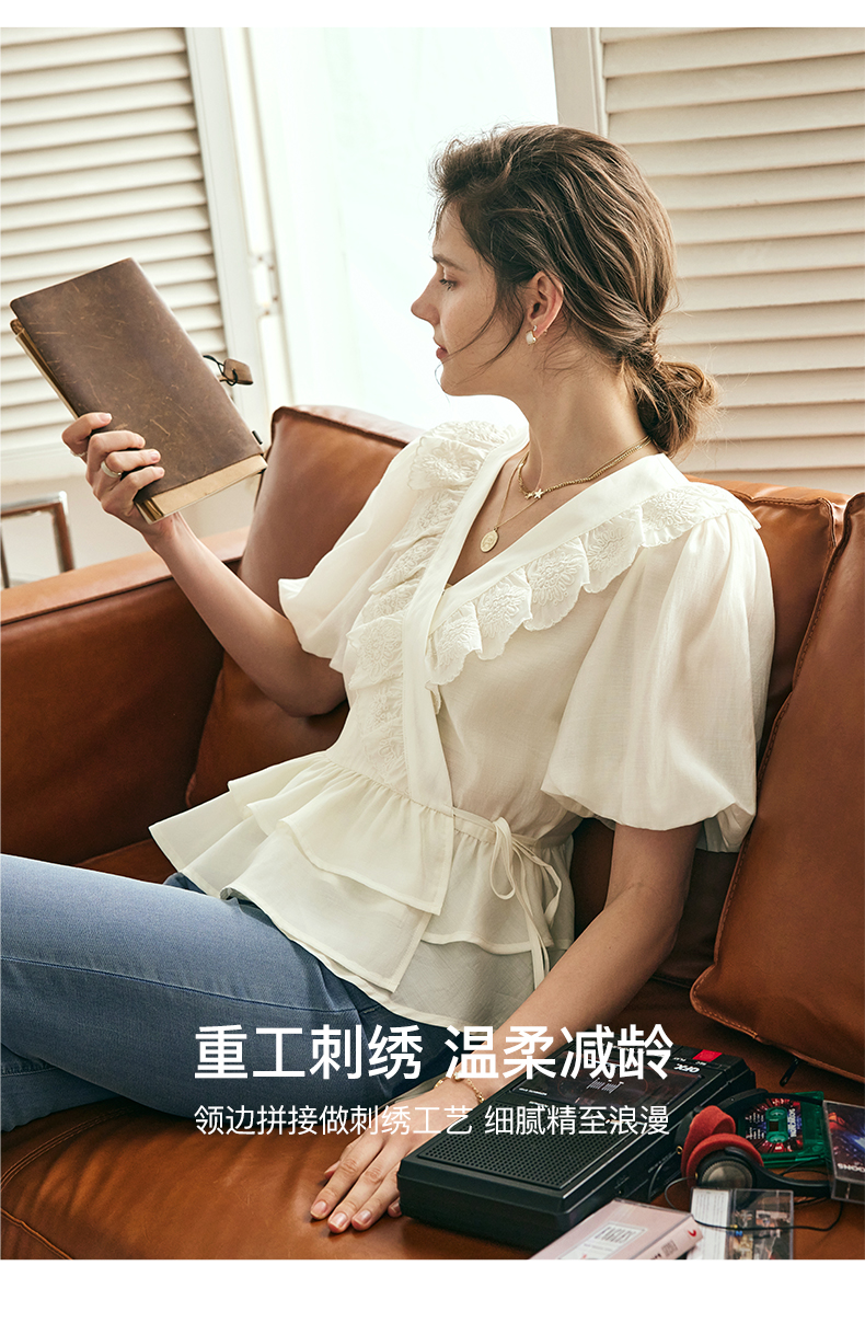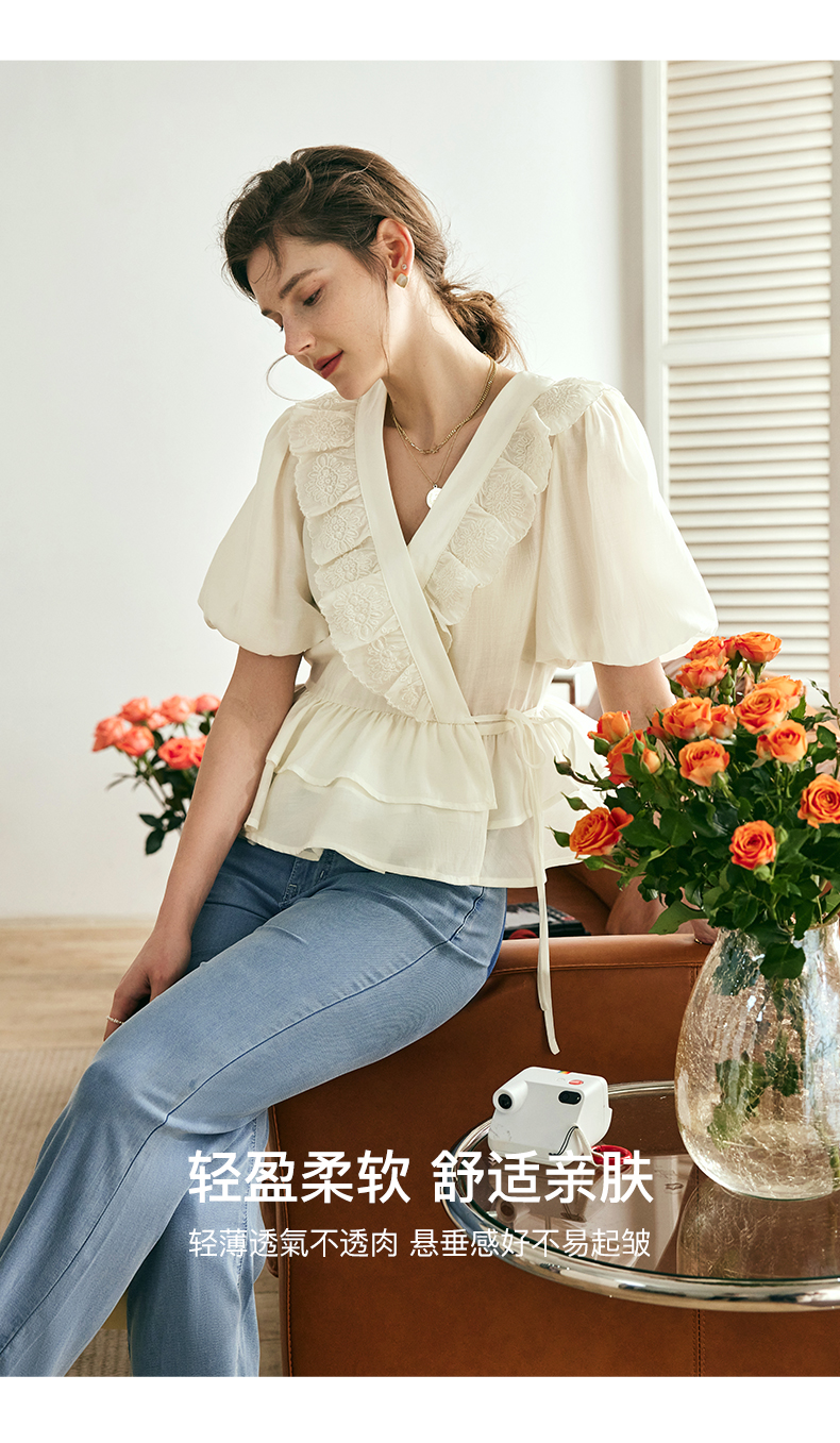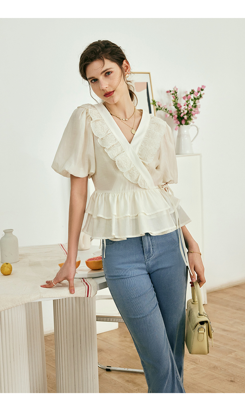 OLrain欧芮儿法式V领蕾丝雪纺衫女夏季2023年新款荷叶边甜美小衫