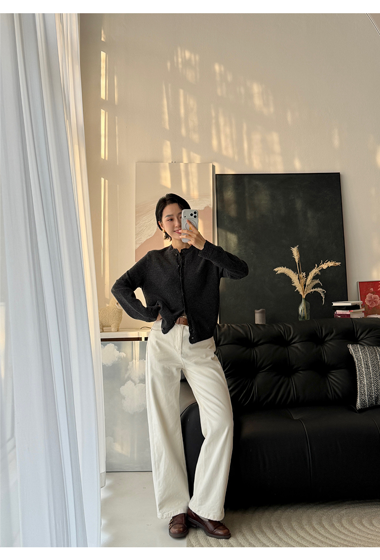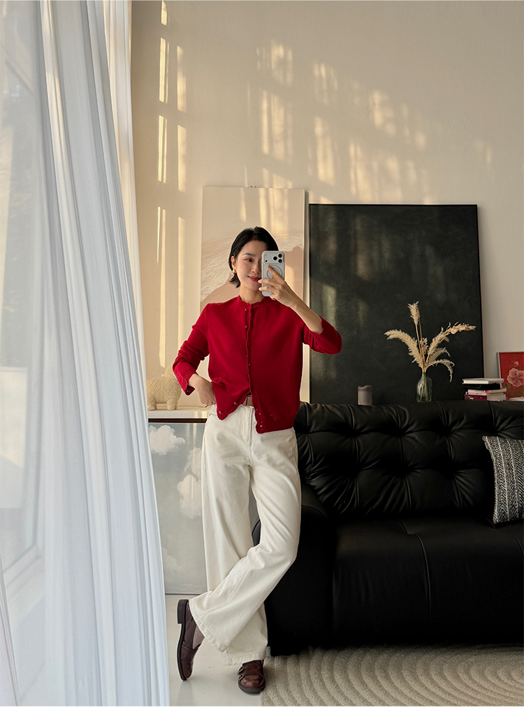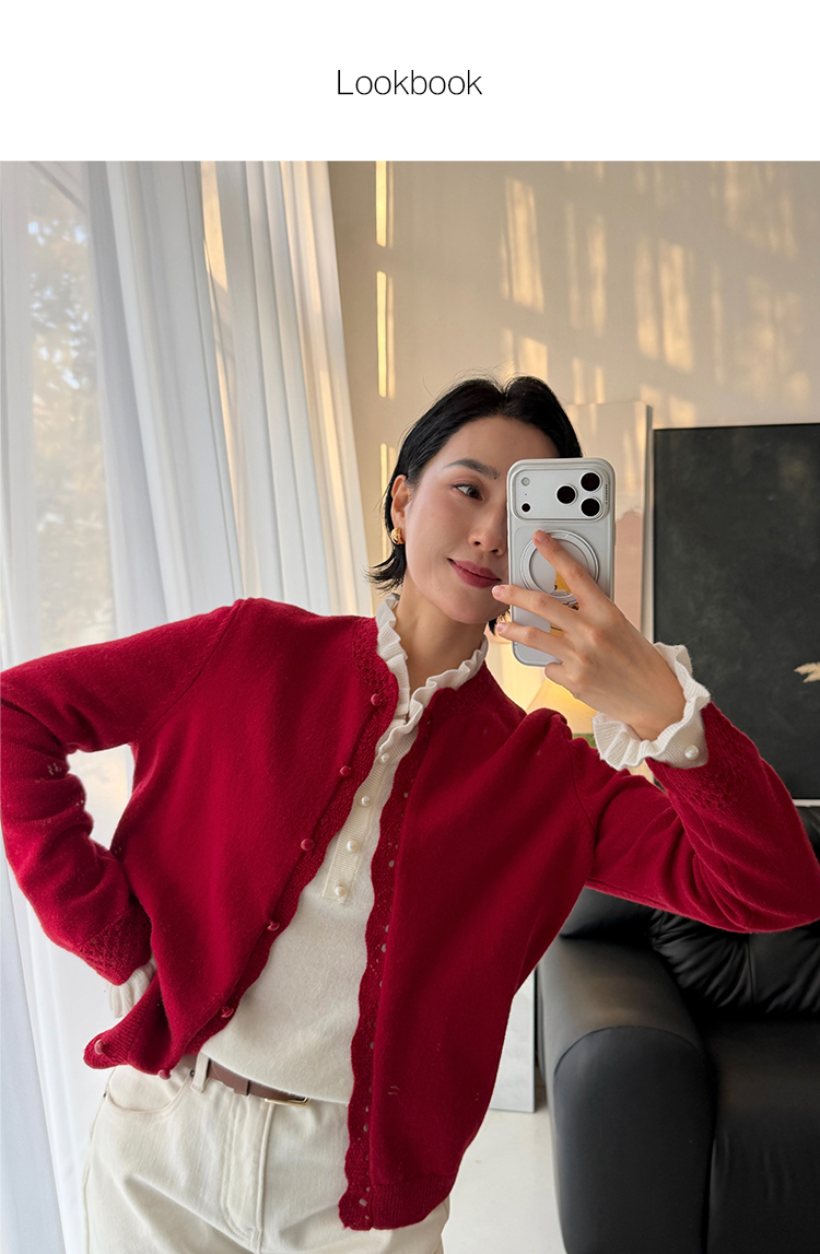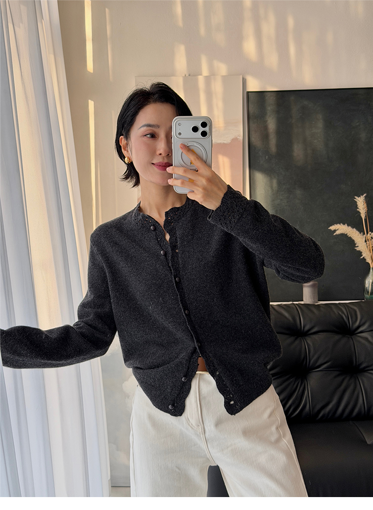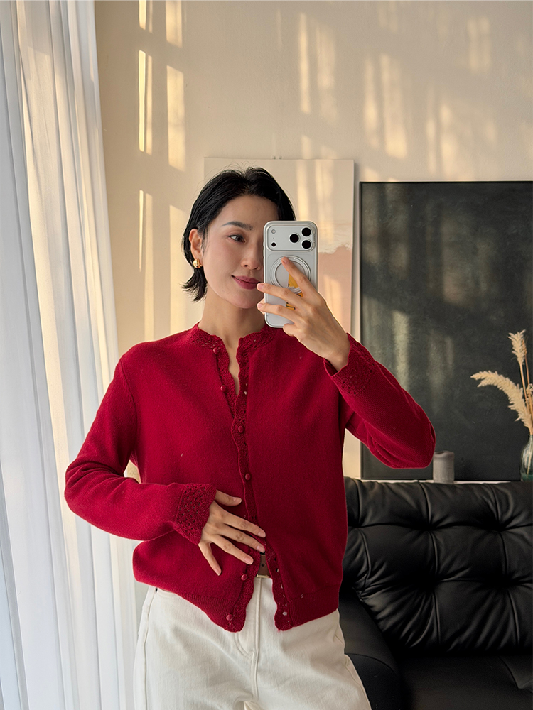 100%羊毛 新年氛围感花边小圆领针织开衫