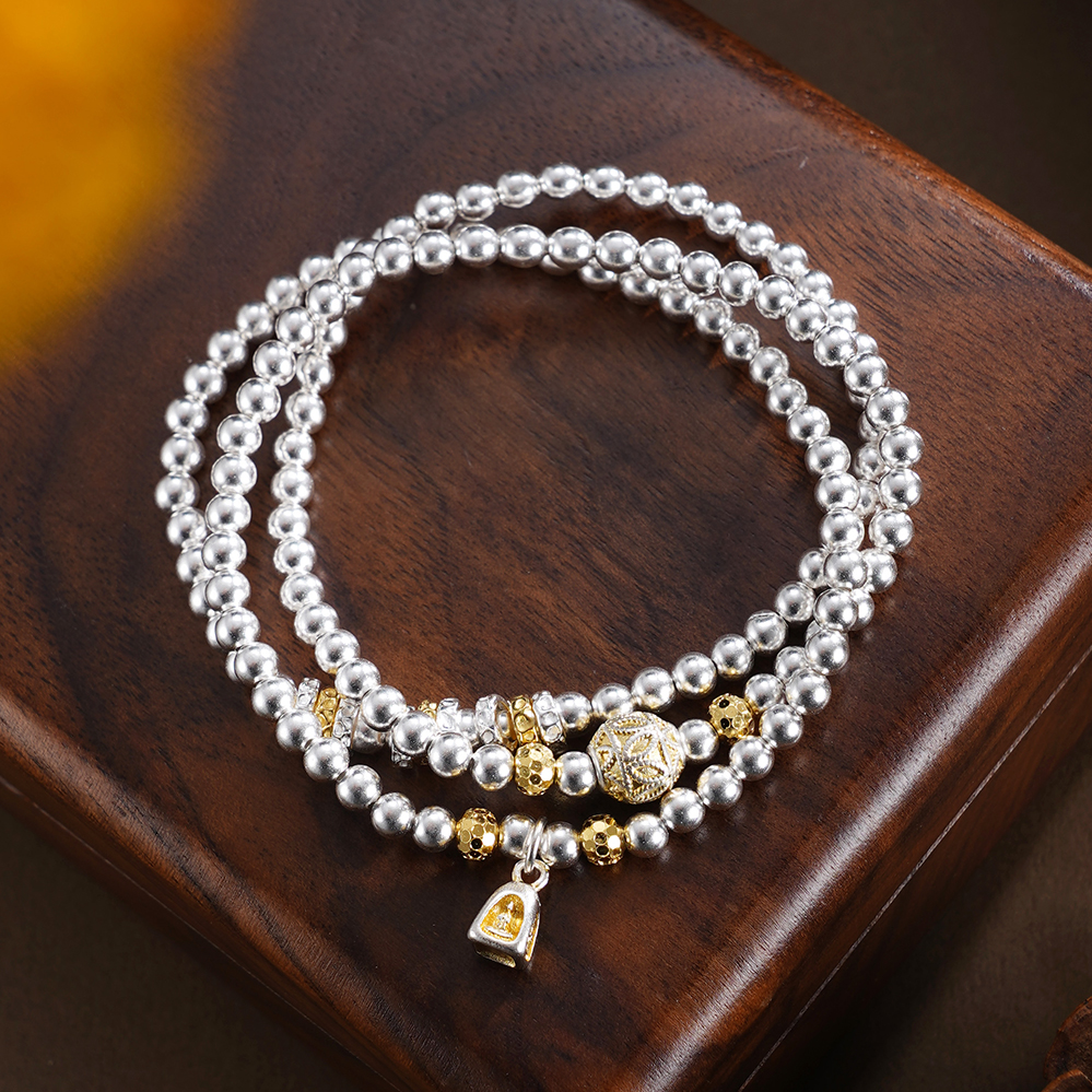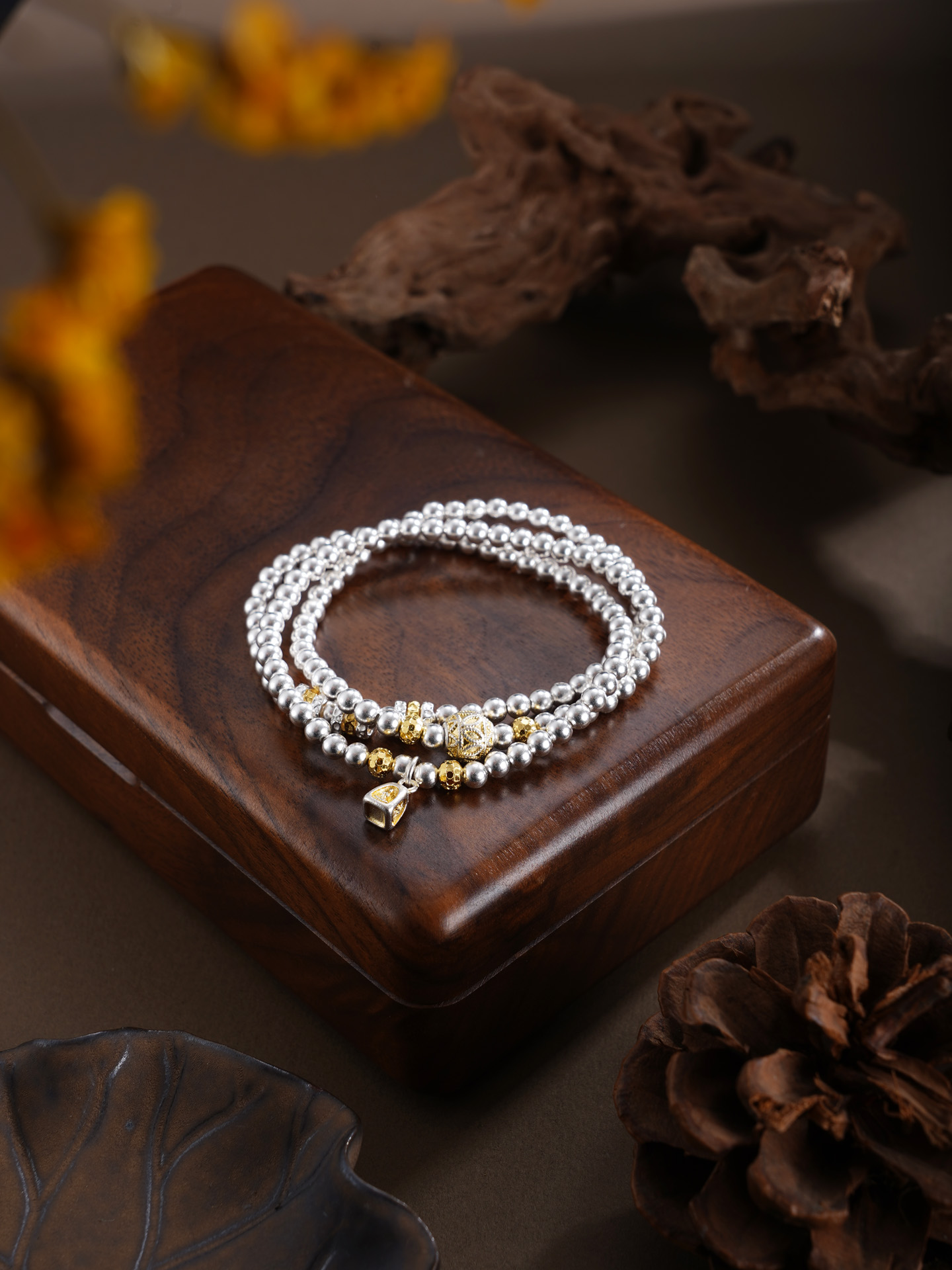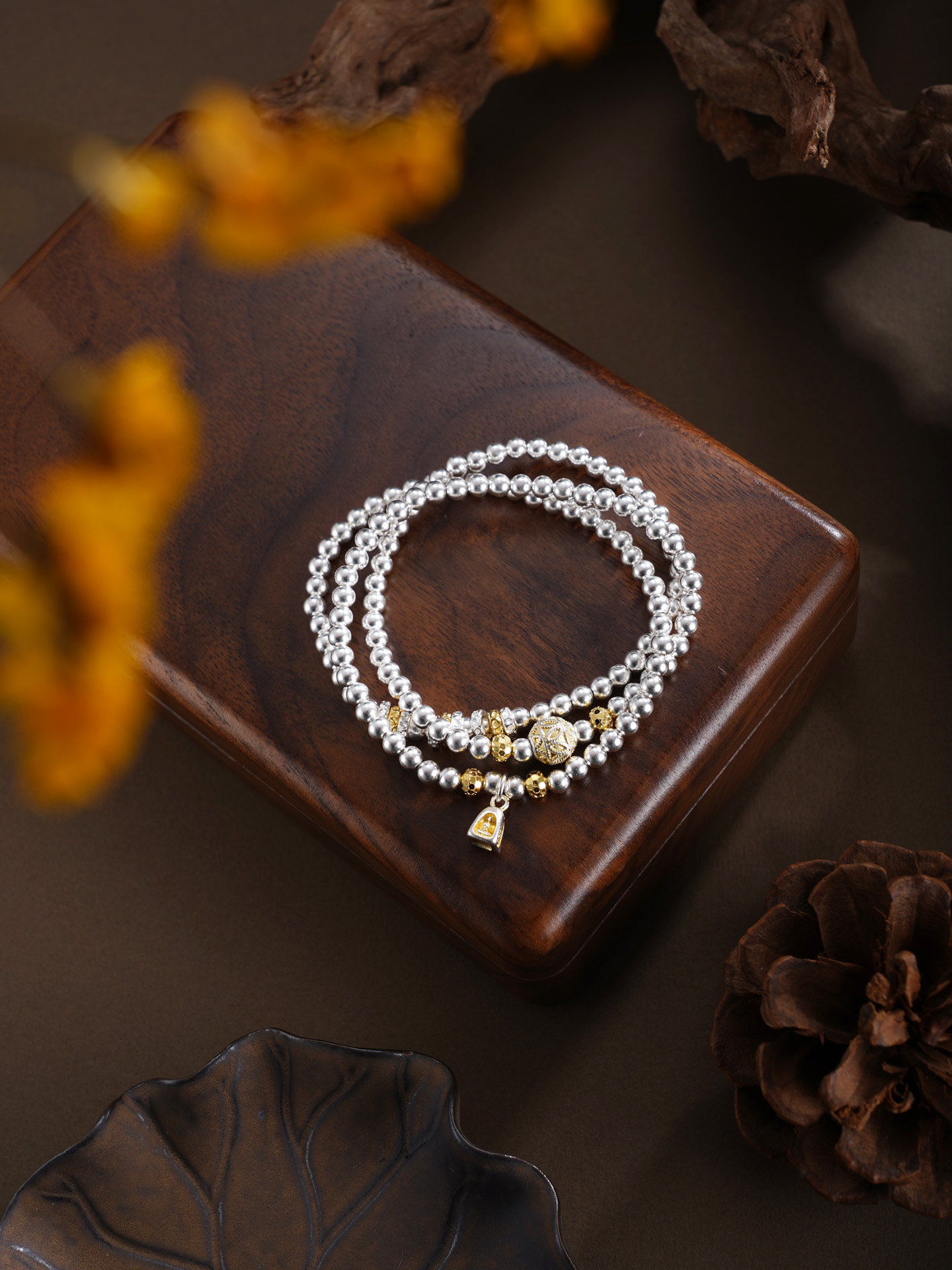 【寓意】:多圈纯银手串,缀以镀金小串珠。多圈设计象征福缘层层相叠,生活丰盈;镀金串珠暗含财富与尊贵。整体寓意福盈满门,平安富足。