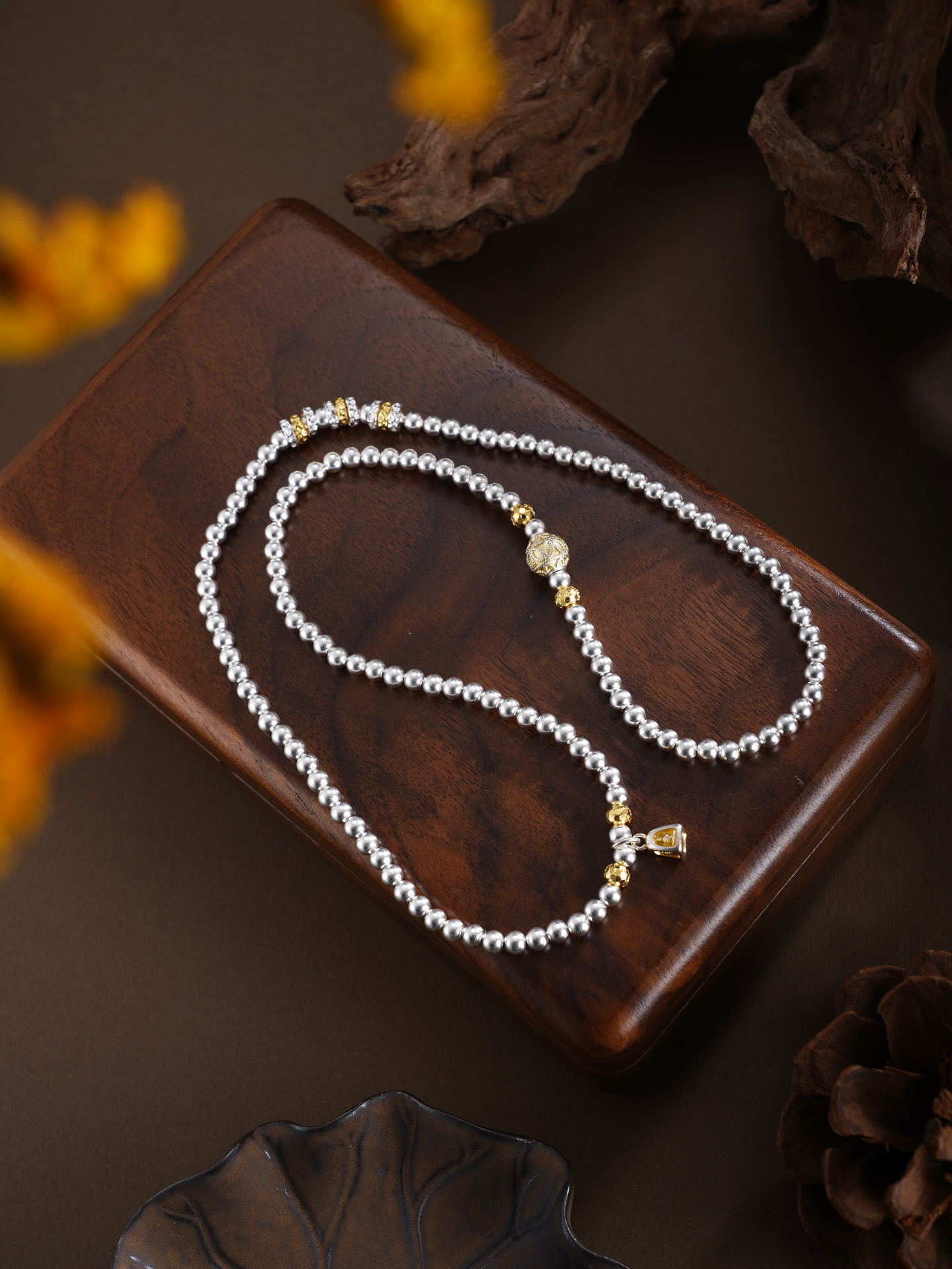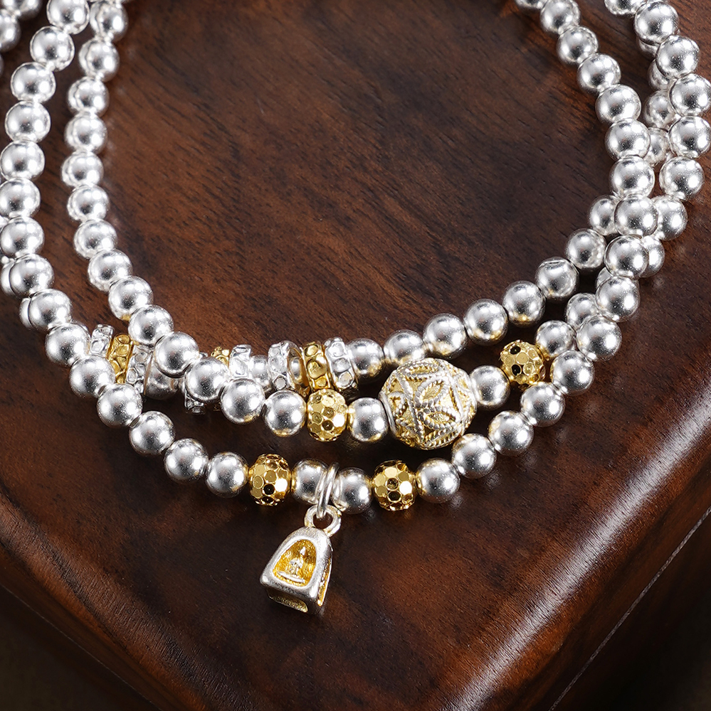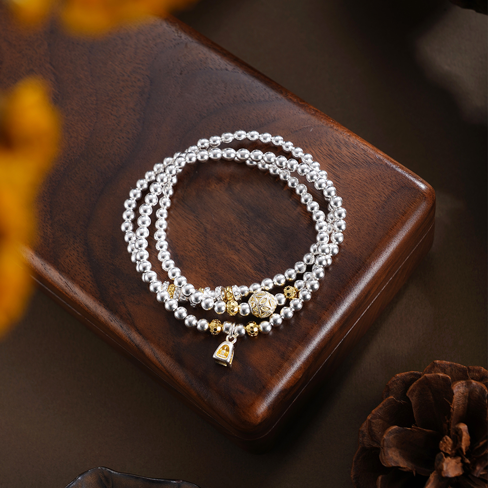 【寓意】:多圈纯银手串,缀以镀金小串珠。多圈设计象征福缘层层相叠,生活丰盈;镀金串珠暗含财富与尊贵。整体寓意福盈满门,平安富足。