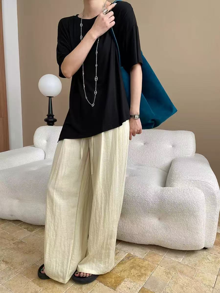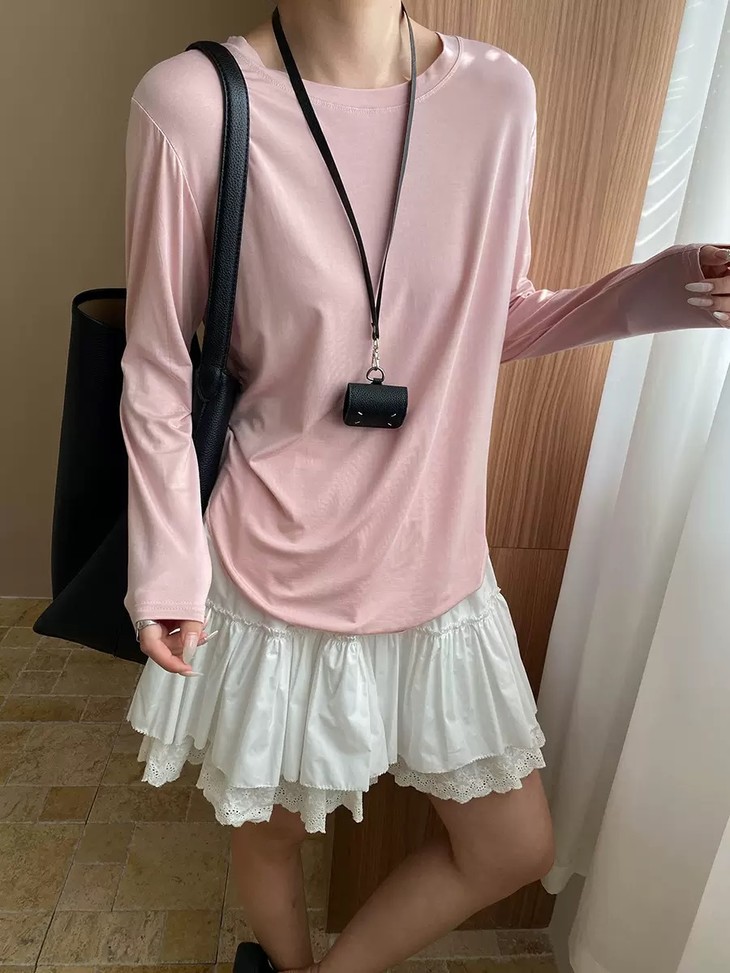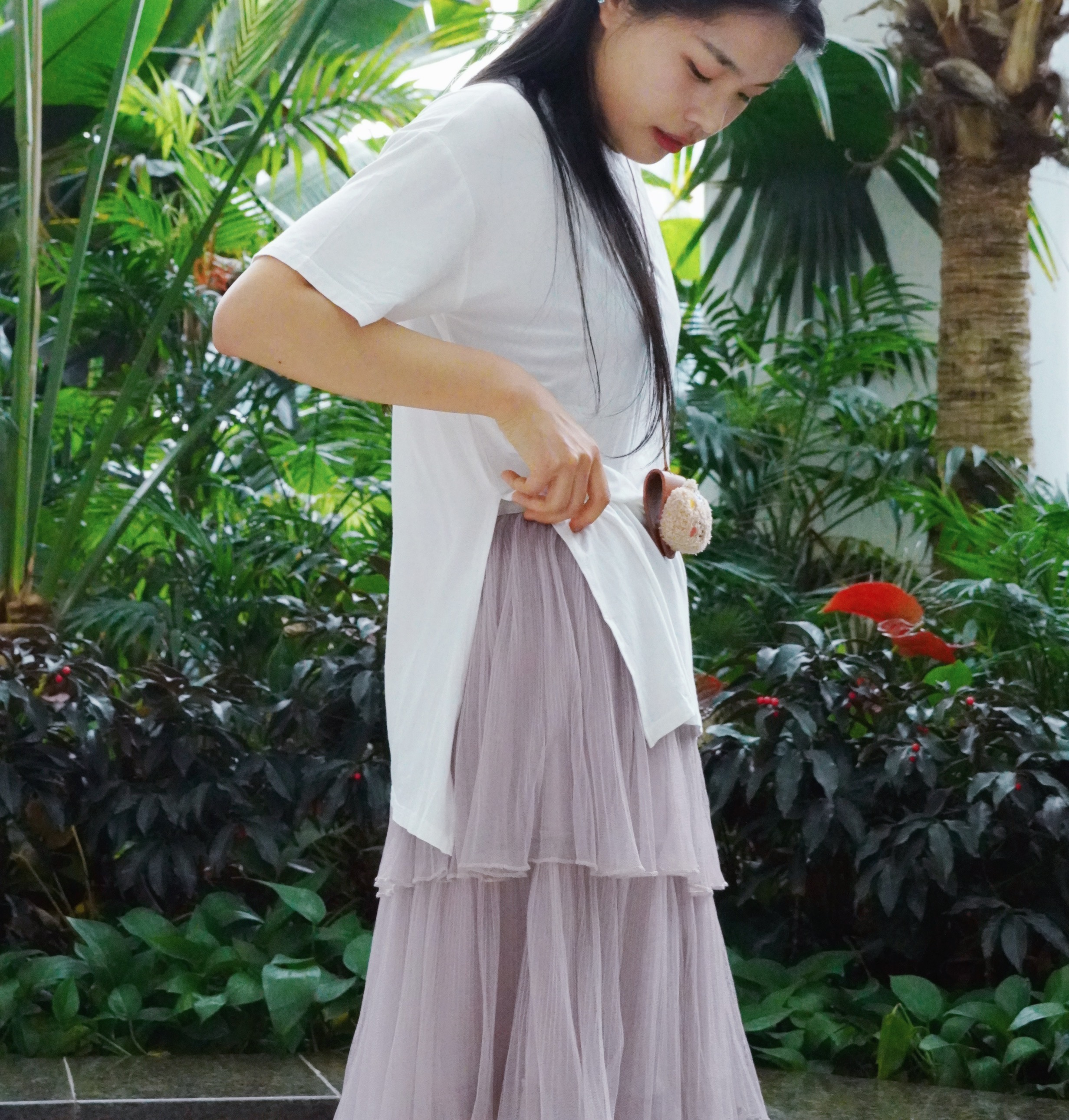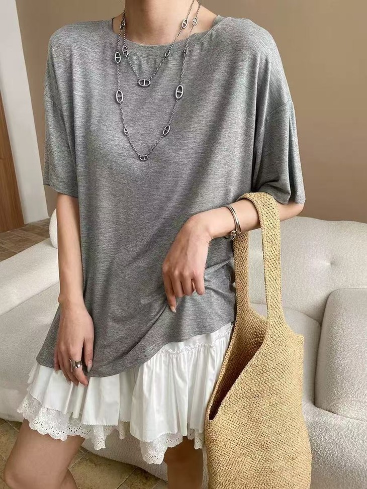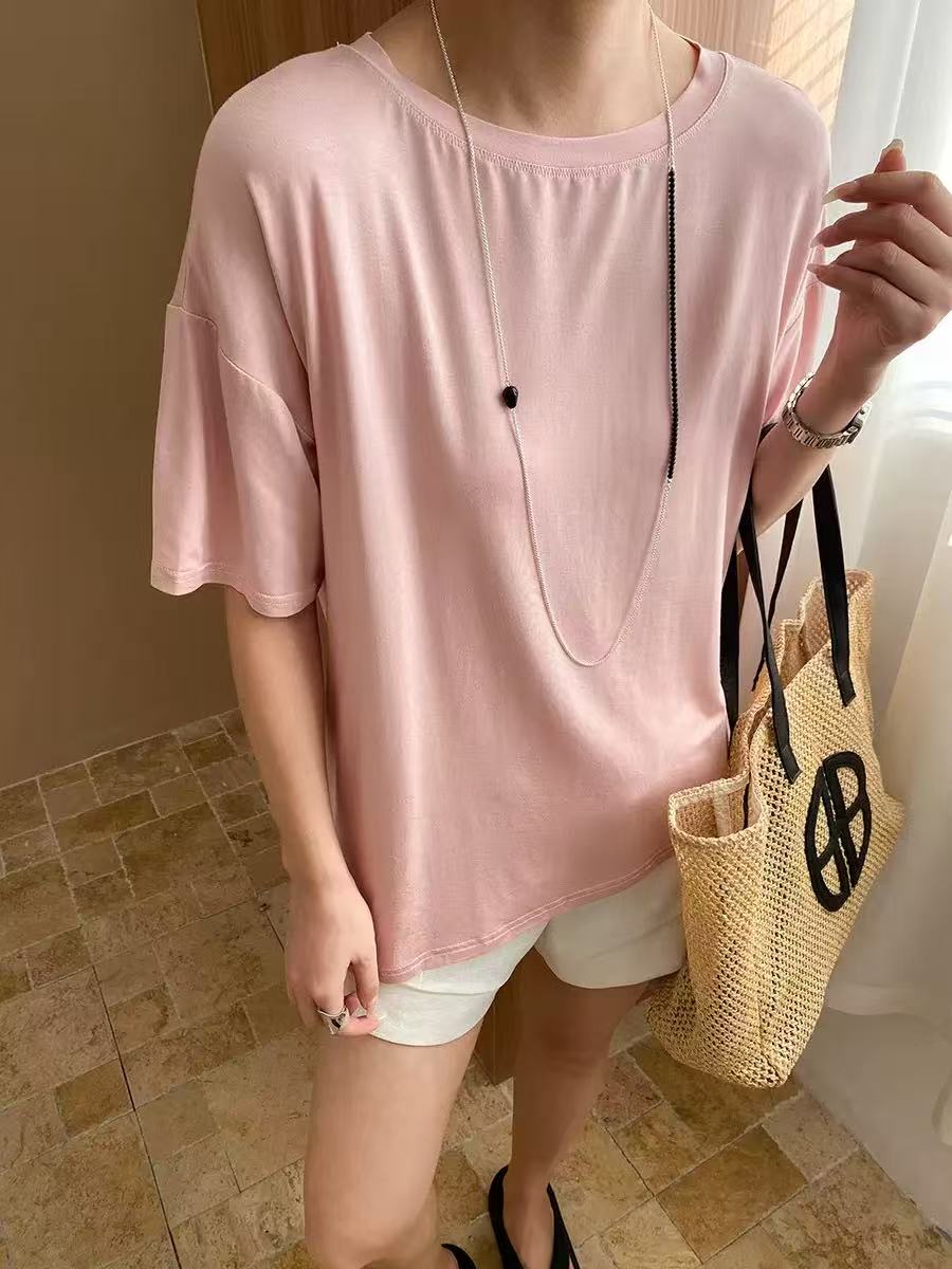 其中,不规则开叉中长款短袖和宽松防晒罩衫属于同一系列,由96%粘胶纤维和4%氨纶混纺而成,横向、纵向弹性都很不错。两者版型相同,都是均码,包容性特别强,整体偏慵懒风。颜色也是一样的,有黑色、灰色、白色、粉色和天蓝色5个颜色,不易透色。
