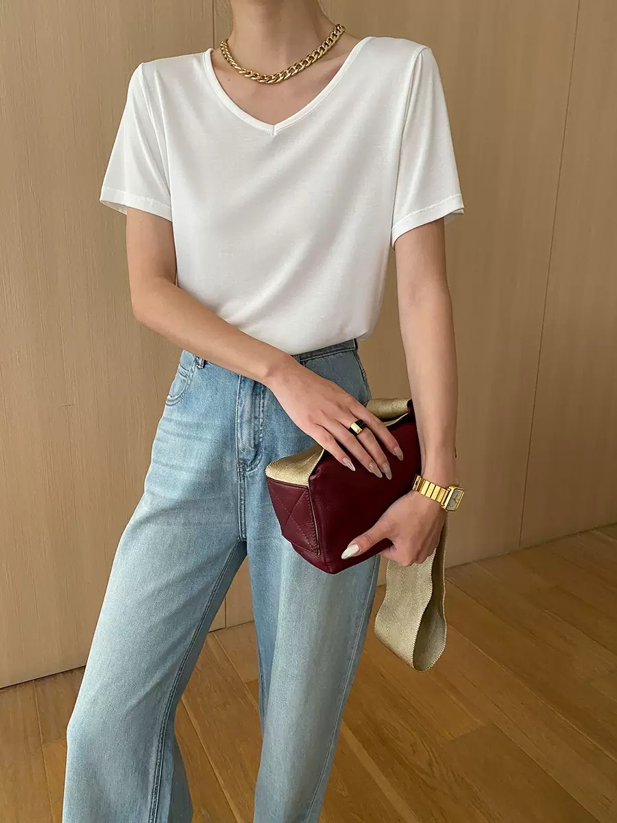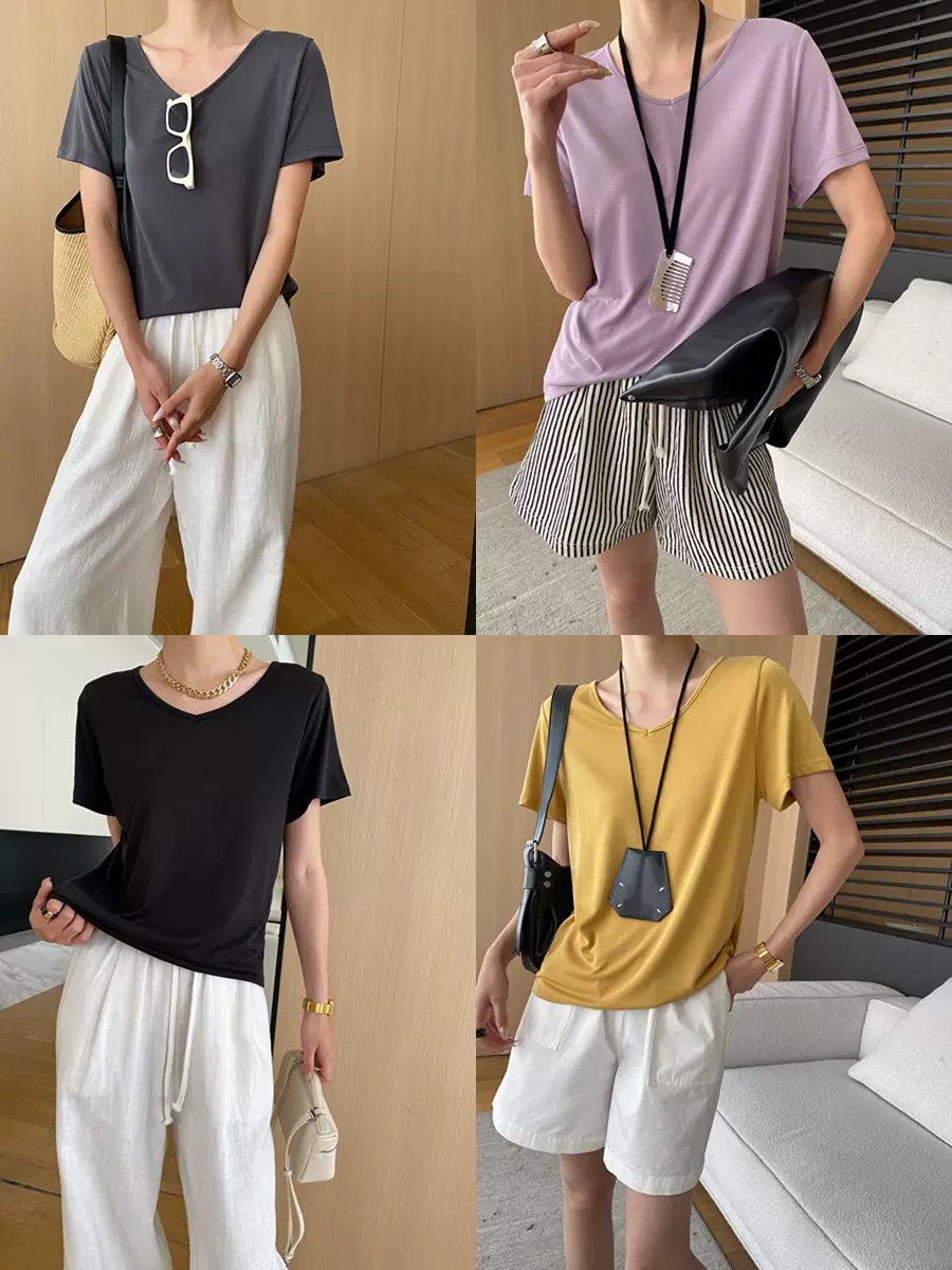 V领短袖的颜色饱和度更高、靓丽一些,除了黑白灰,还有紫色和黄色可选。