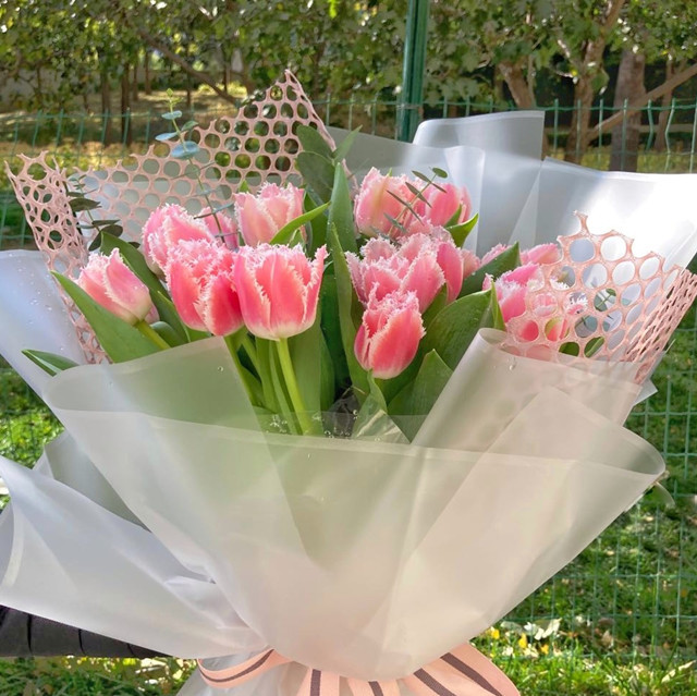 精选花材:19支昆士兰(粉色毛边)郁金香,尤加利叶搭配