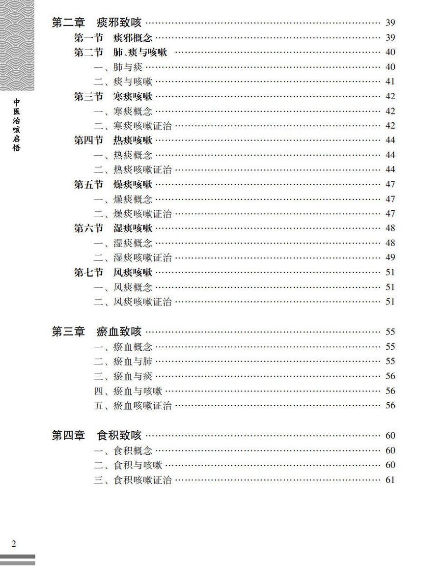 本书遵《黄帝内经·素问·咳论》之要旨,将病因致咳内容分为六淫致咳(风邪致咳、寒邪致咳、暑邪致咳、湿邪致咳、燥邪致咳、热邪致咳)、痰邪致咳、瘀血致咳、食积致咳、情志致咳五个章节,并逐章论述;将脏腑咳嗽内容独立成章,分为肺咳证治、脾咳证治、心咳证治、肝咳证治、肾咳证治、胃咳证治、大肠咳证治七个小节,并逐节论述。书中还介绍了顽咳、儿童慢性咳嗽的诊断与辨治思路,以及咳嗽常用方剂及其运用。书中关于六腑咳的内容仅介绍了胃咳、大肠咳,而未对胆咳、膀胱咳、小肠咳、三焦咳进行专门介绍,其辨证可参见相应的五脏咳内容。