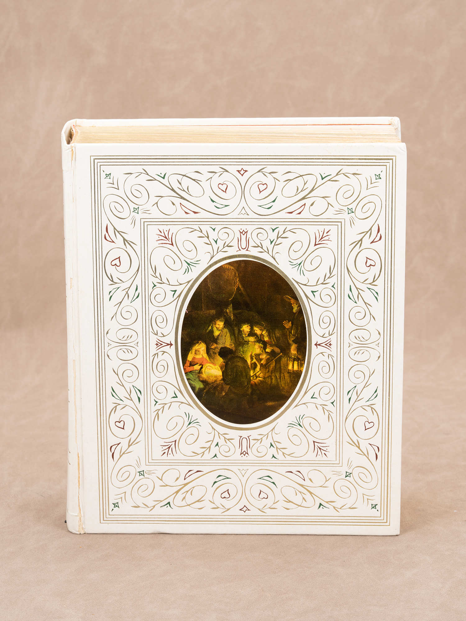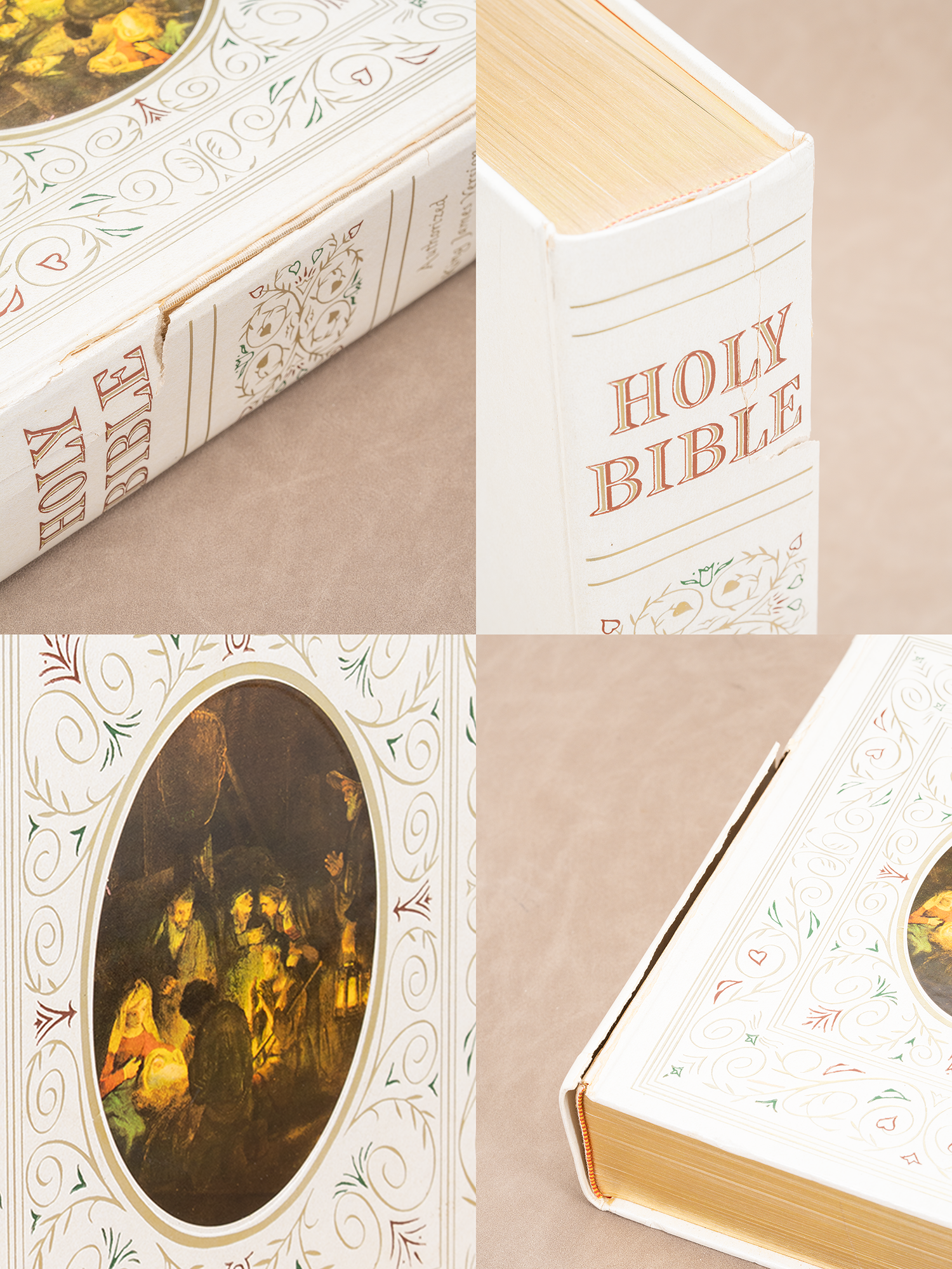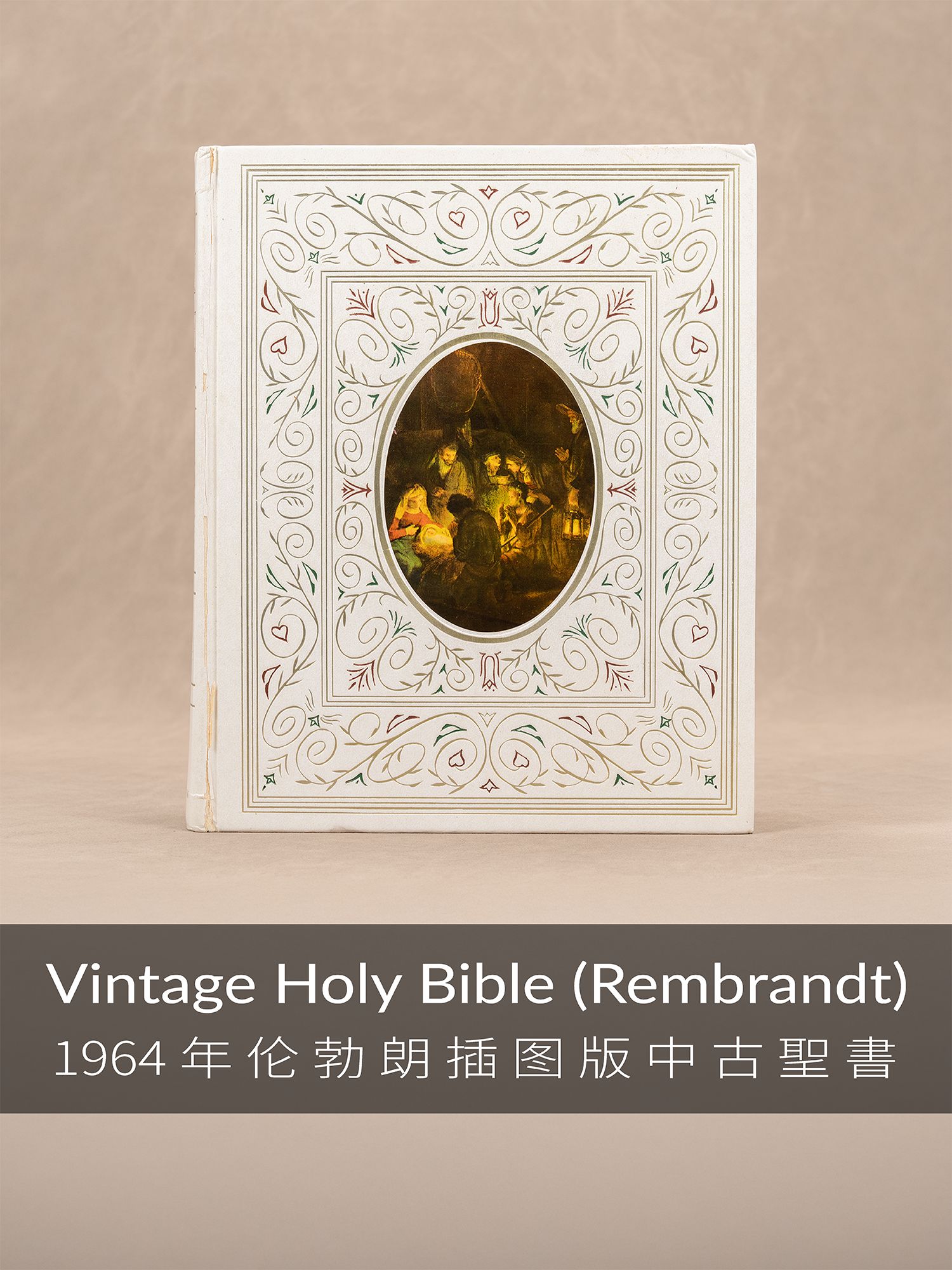 这本伦勃朗插图版中古聖書,印制于1964年,至今已61年历史。采用的版本是经典的 KJV,内页无任何笔迹,仅封面书脊处有开裂情况,整本书成色和品相良好。封面中心椭圆形画面描述的是 CHRIST 降生在马槽的场景,椭圆外围有两圈做了烫金工艺的复古花卉凹印。三边书页处都做了刷金工艺,精致复古。