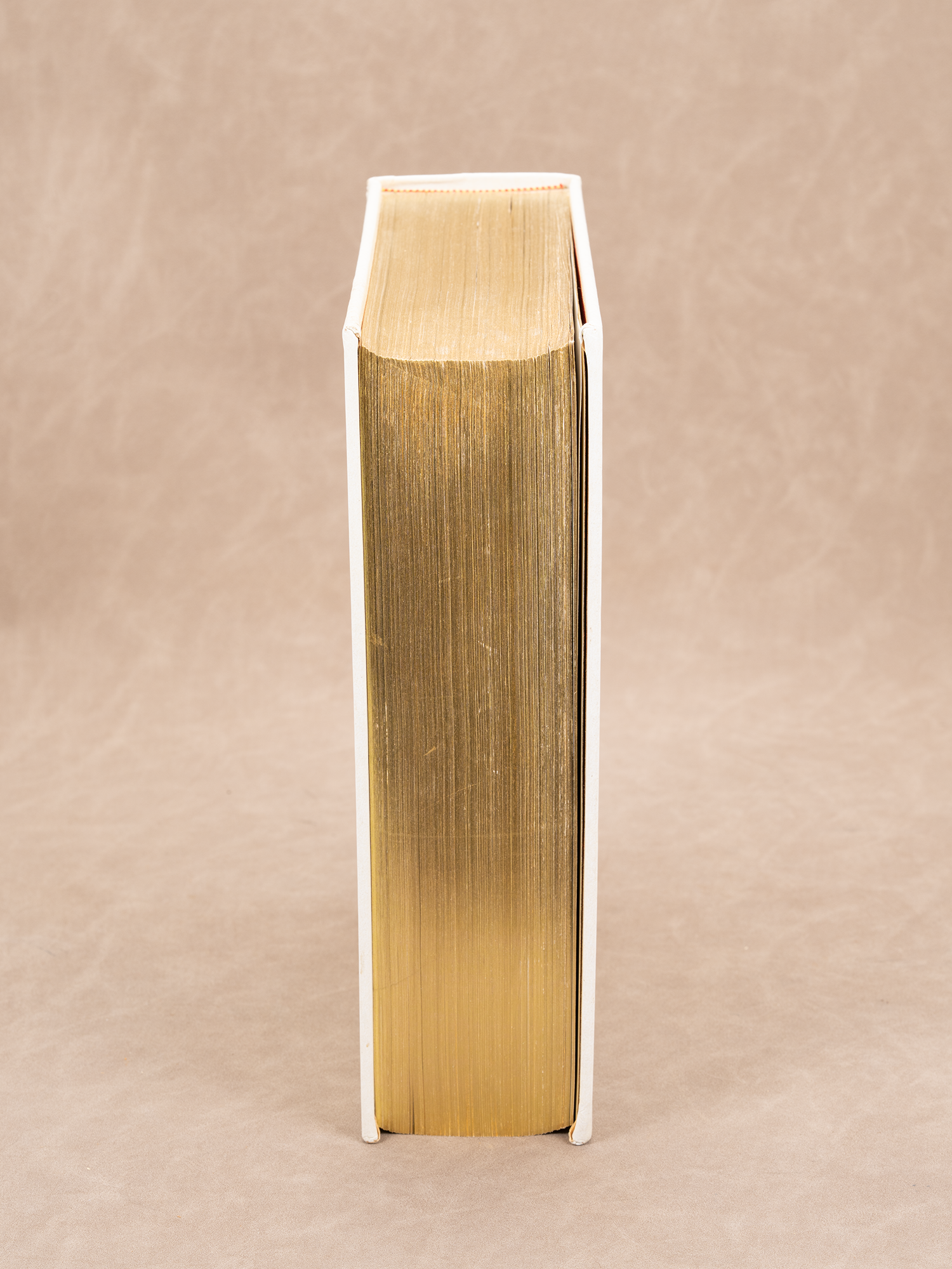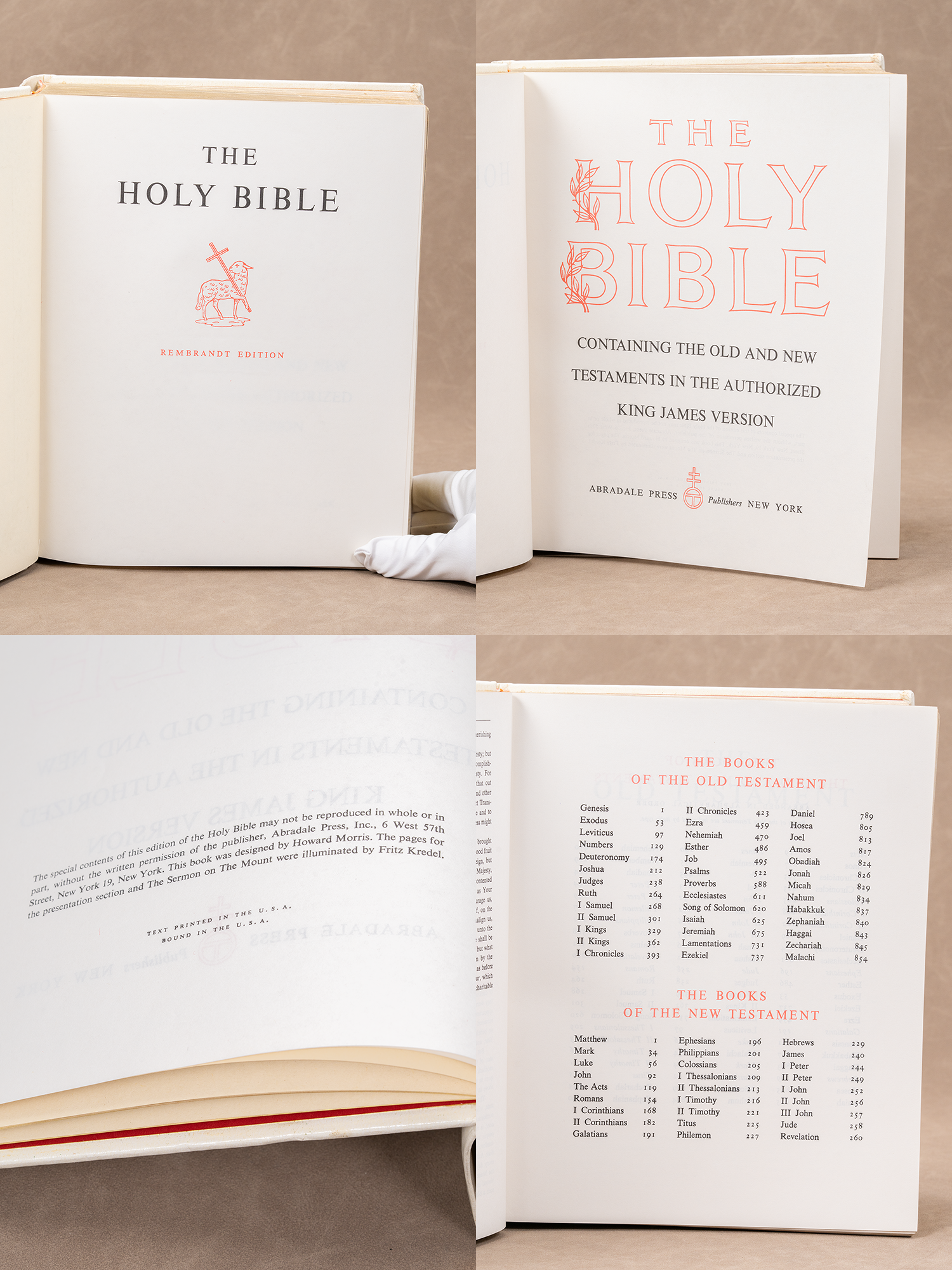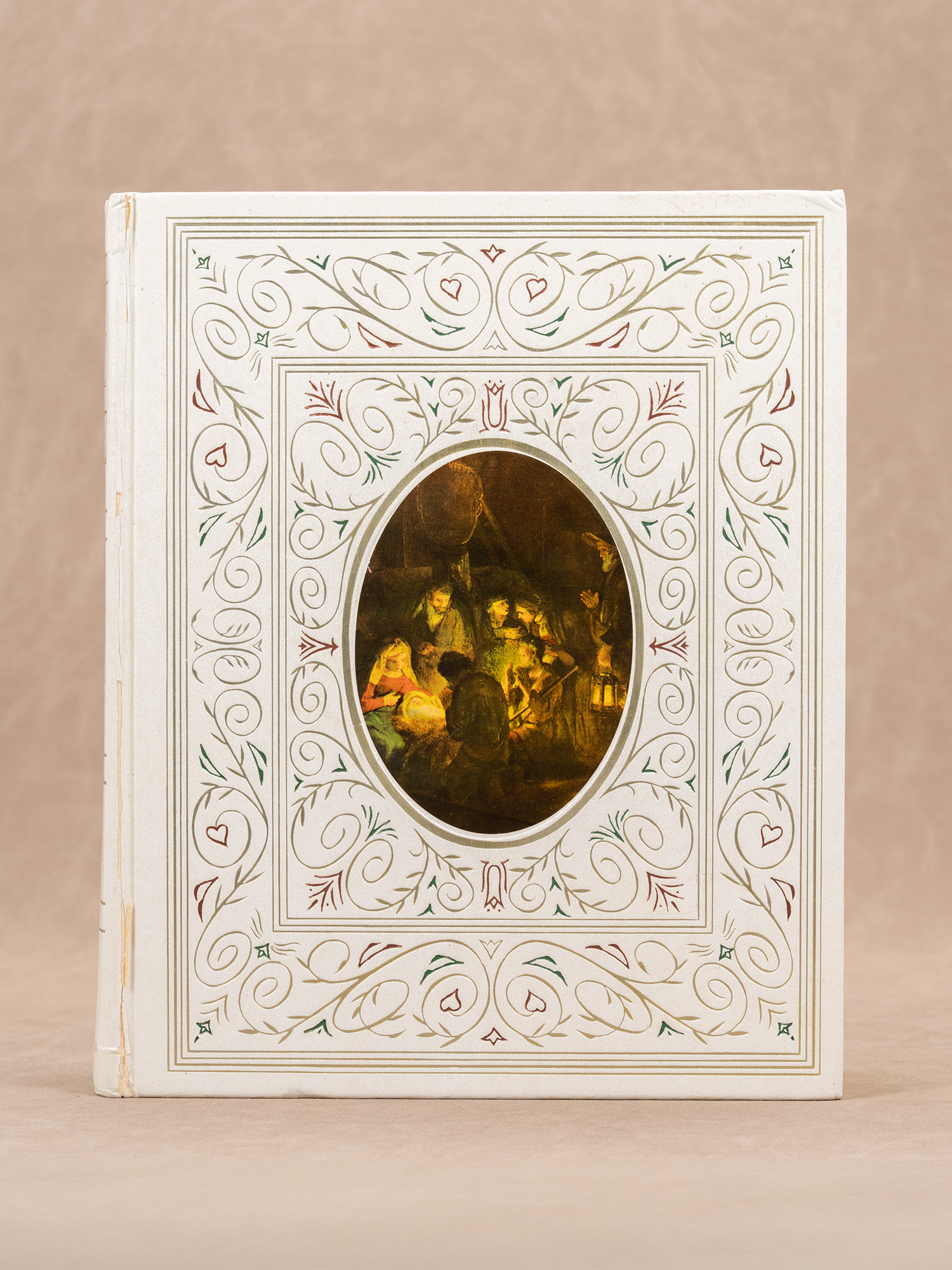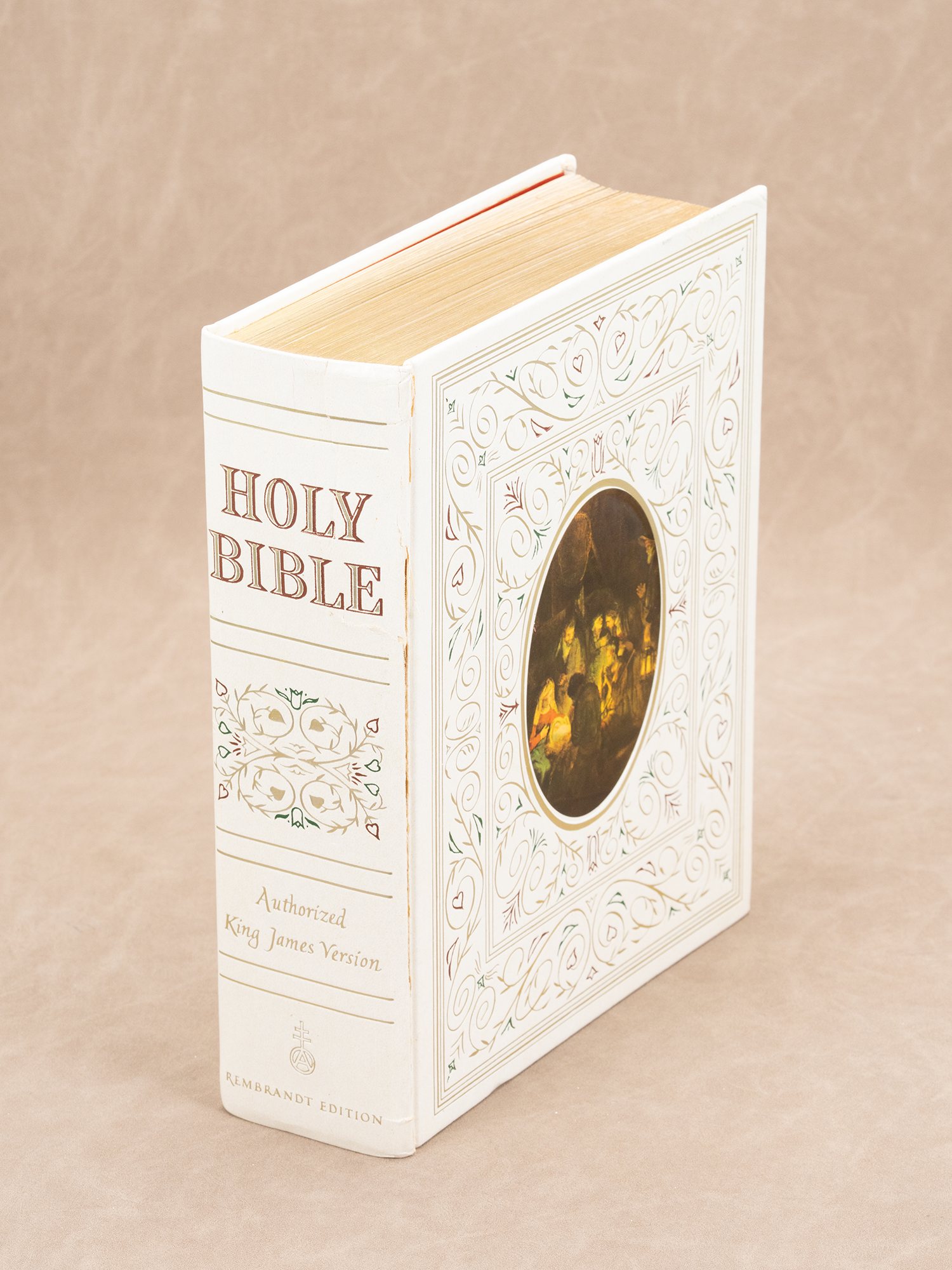 这本伦勃朗插图版中古聖書,印制于1964年,至今已61年历史。采用的版本是经典的 KJV,内页无任何笔迹,仅封面书脊处有开裂情况,整本书成色和品相良好。封面中心椭圆形画面描述的是 CHRIST 降生在马槽的场景,椭圆外围有两圈做了烫金工艺的复古花卉凹印。三边书页处都做了刷金工艺,精致复古。