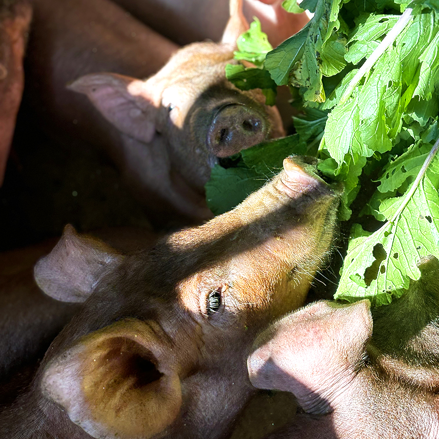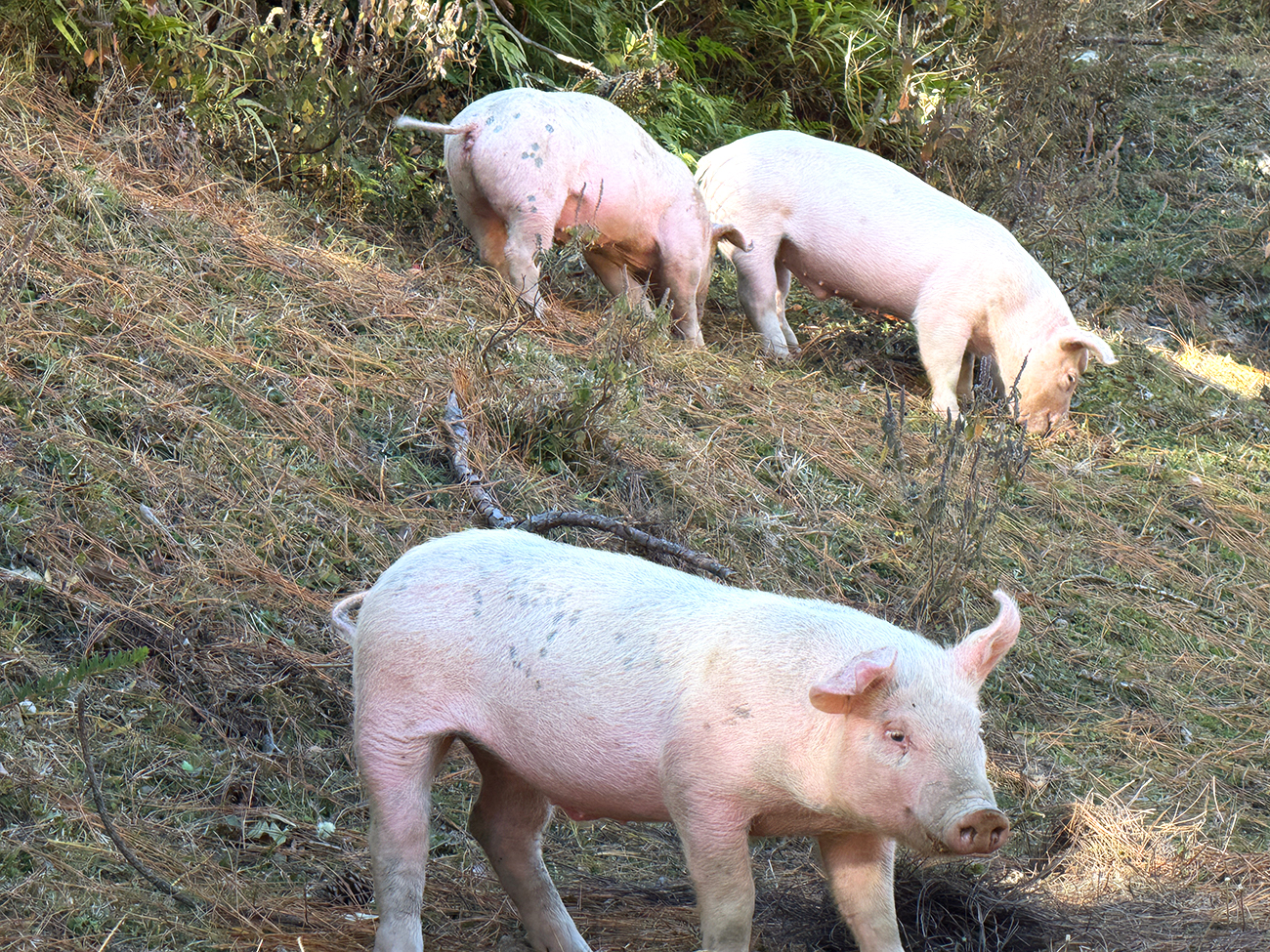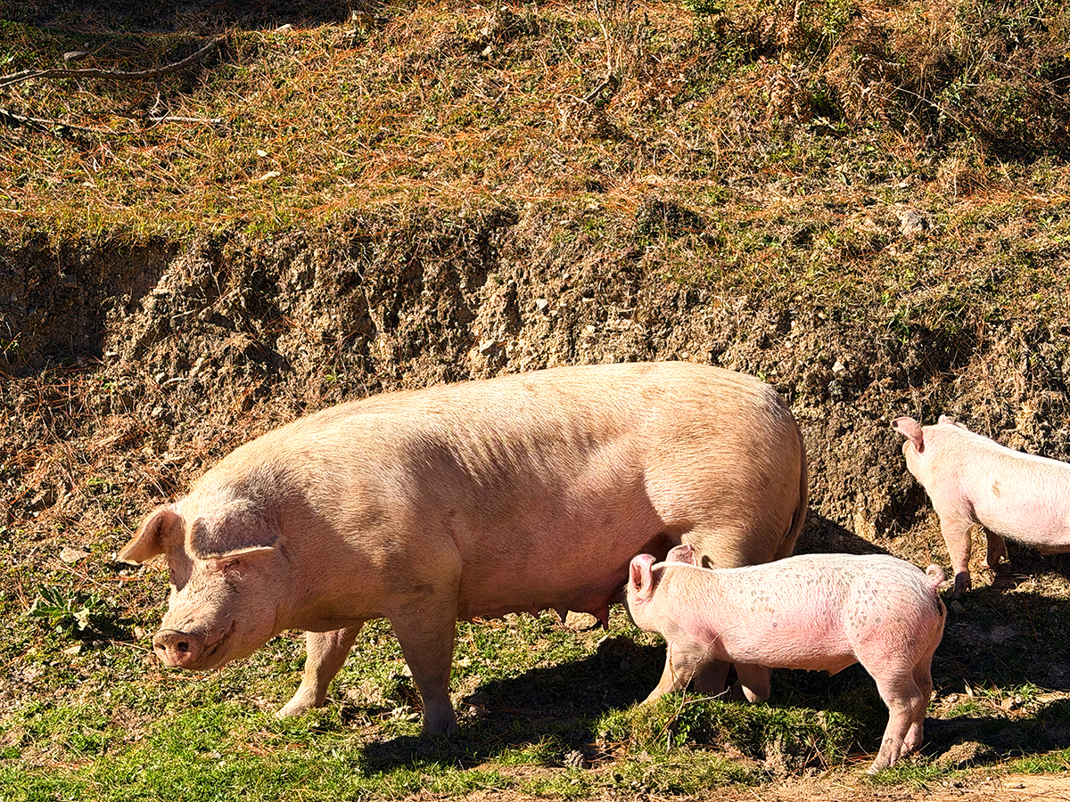 这里的跑山猪不像大规模养殖场圈养的肉猪——没有接触过合成饲料、抗生素、添加剂,每天饲喂的是菜叶和米糠,大山里还有各种野菜、虫子等小东西让它们自由觅食。