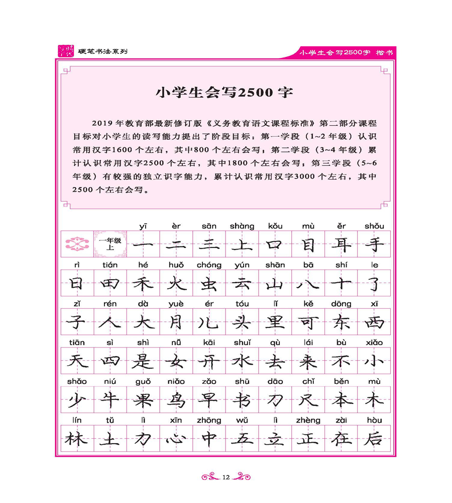 本字帖针对小学生读者,以部编版语文教材中的写生字为依据,挑选小学生需要掌握的2500个生字为书写内容,使用庞中华楷书字体,附带蒙纸,让学生进行书写练习。在练习写字的同时,可以对生字加深记忆。除了对这2500个汉字进行书写练习,在字帖前面还配有写字的笔顺规则表以及写字的正确姿势,引导小学生进行正确的书写练习,从八种基本笔画:点、横、竖、撇、捺、提、折、钩开始,循序渐进,让小学生慢慢掌握书写技巧,达到练字的目的。