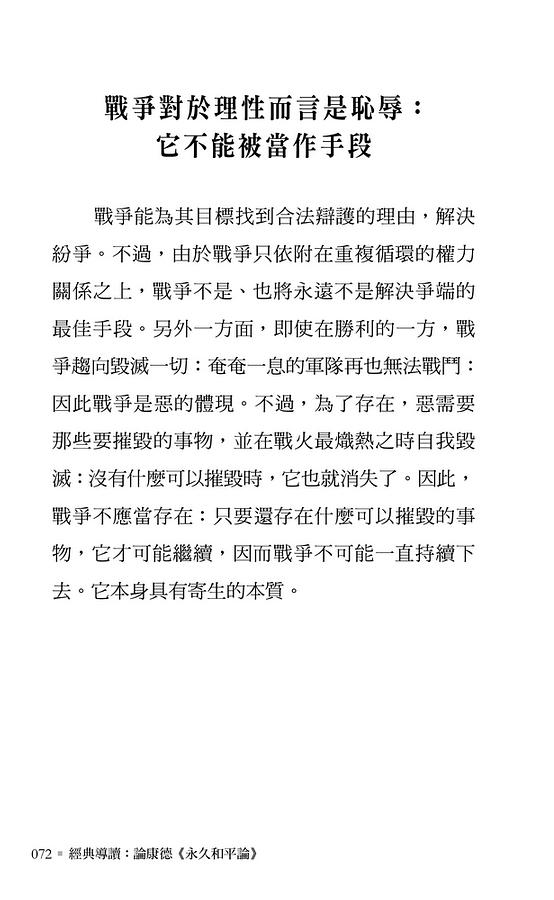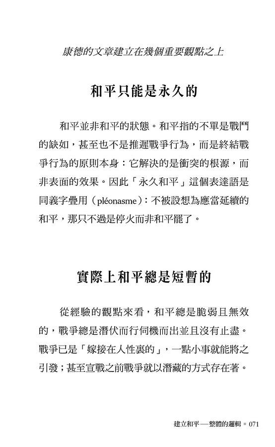 本書分為兩個部分,首先對照幾篇具有和平主義傳統的重要文本揭開序幕,包含盧梭、胡果‧格老秀斯、皮耶‧尼可等等,並透過作者洛皮教授縝密的邏輯整理做全盤的分析與討論。第二部分則是帶回康德的永久和平論文本。希望藉由此方式,讓我們更清楚地鑑別出這位偉大哲學家的創見。