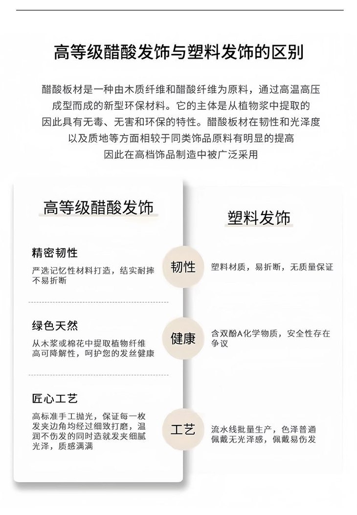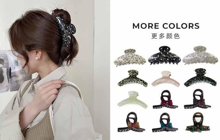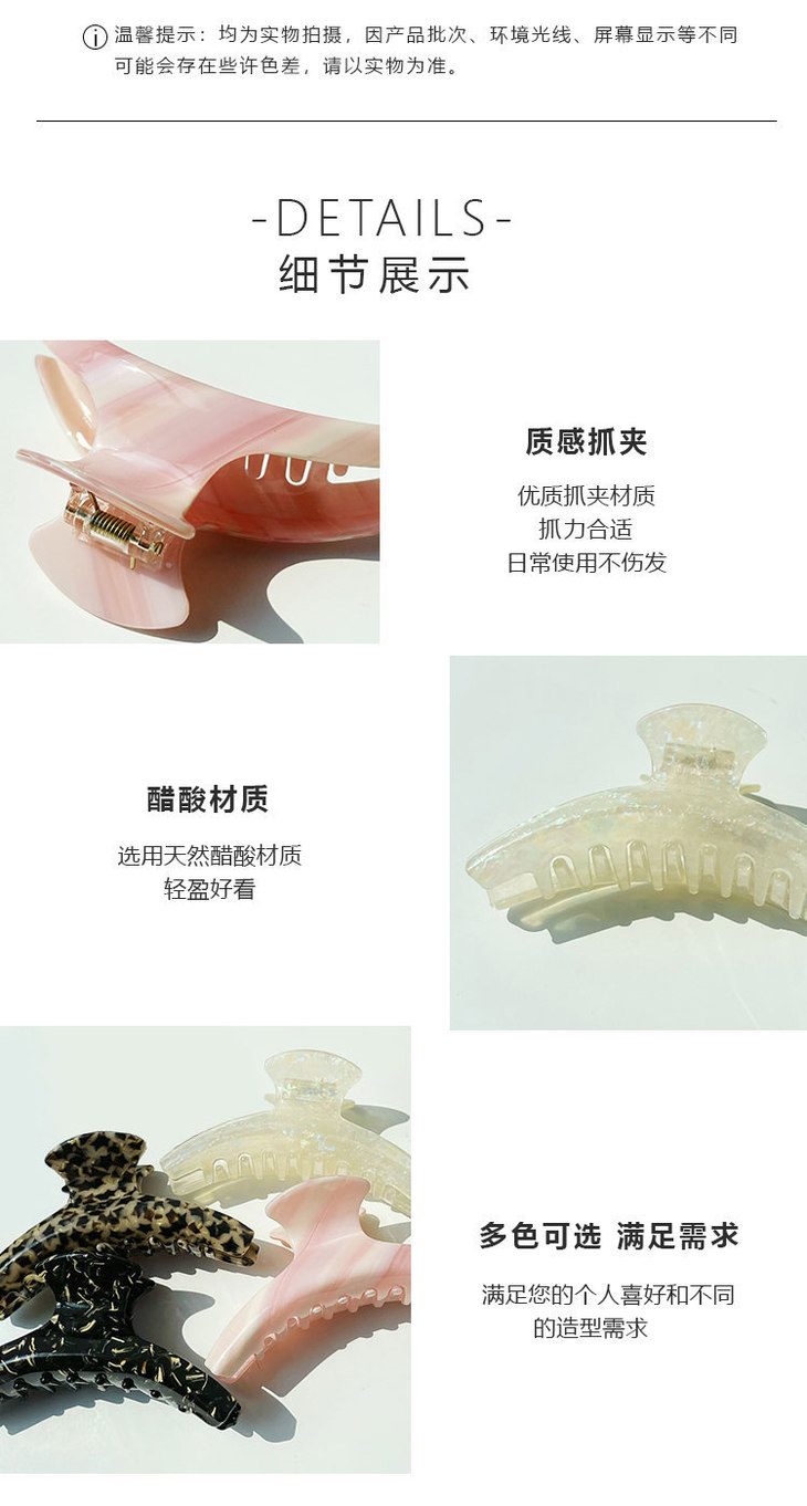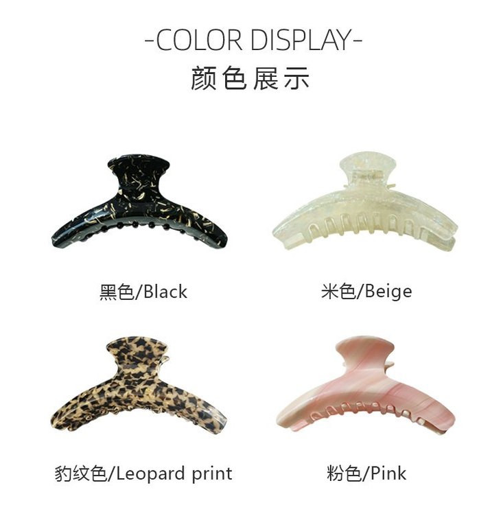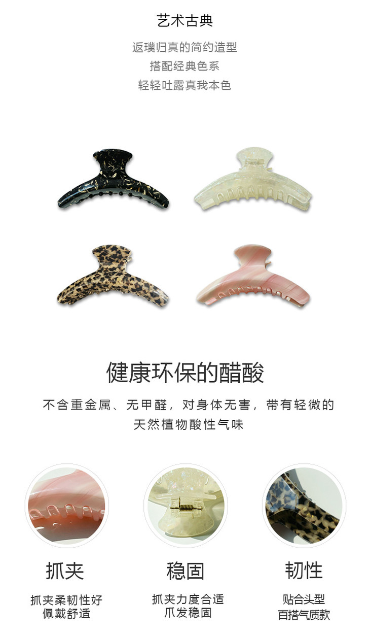 2.醋酸法式肌理抓夹 颜色:黑色、米色、豹纹、粉色 100%优质醋酸纤维:光泽柔和温润,硬度高、耐磨耐刮, 不易变形或发黄,比普通塑料抓夹更显档次。 合金金属配件:防锈抗氧化, 开合顺滑不卡顿,耐用性强,长期使用依旧精致。 独特纹理表面:不同于普通光滑醋酸, 肌理感设计增添复古优雅气质,触感更高级。
