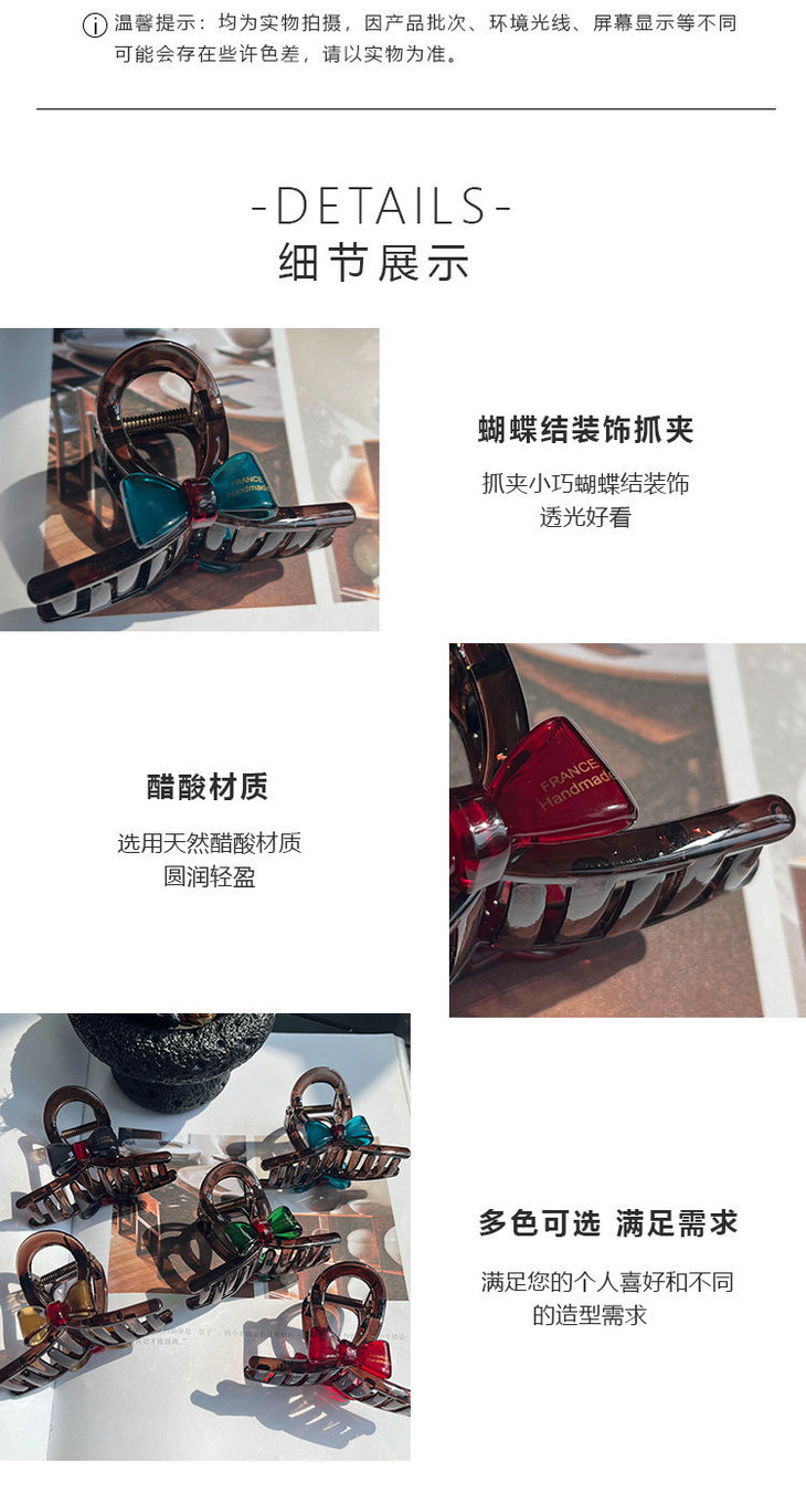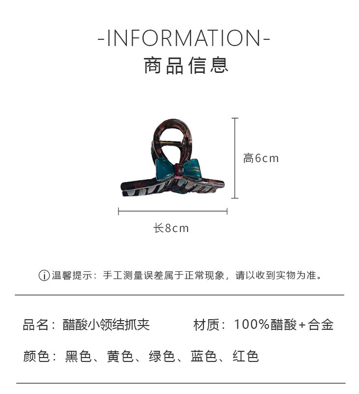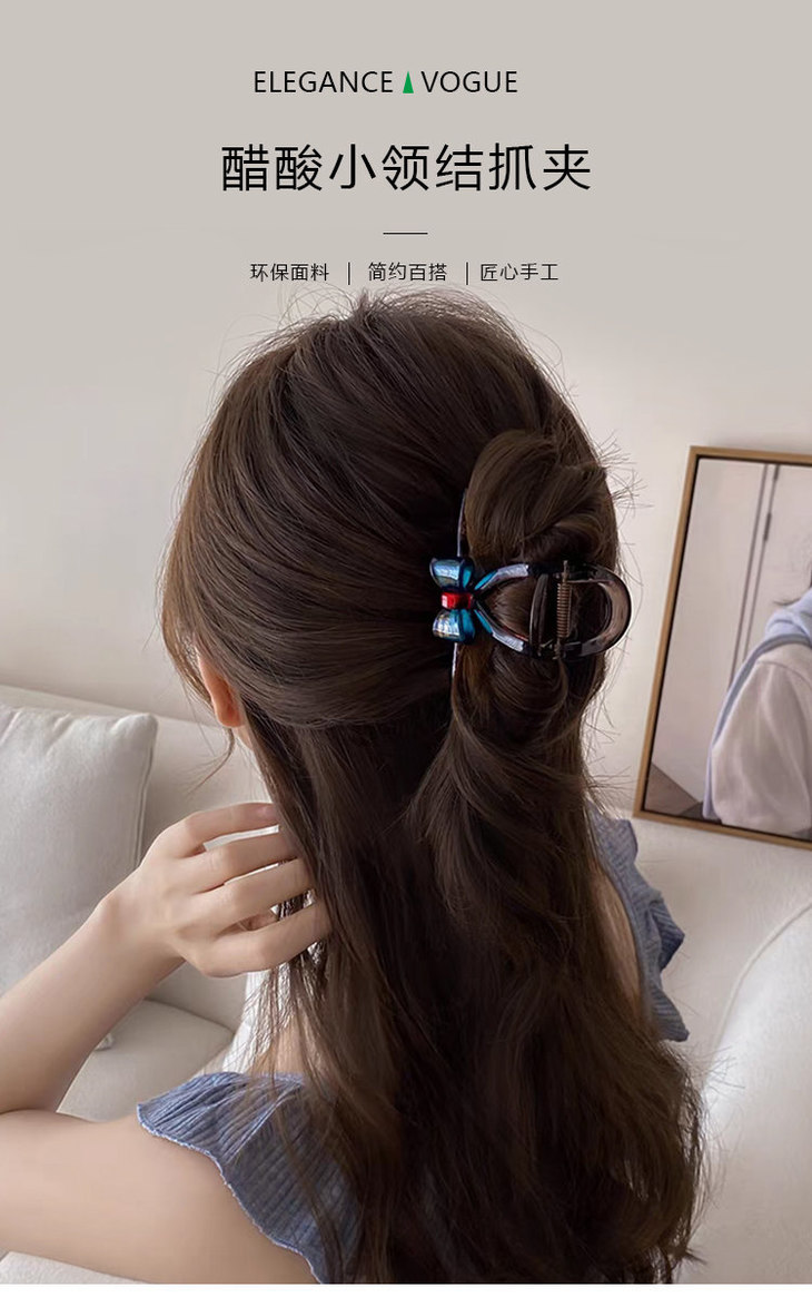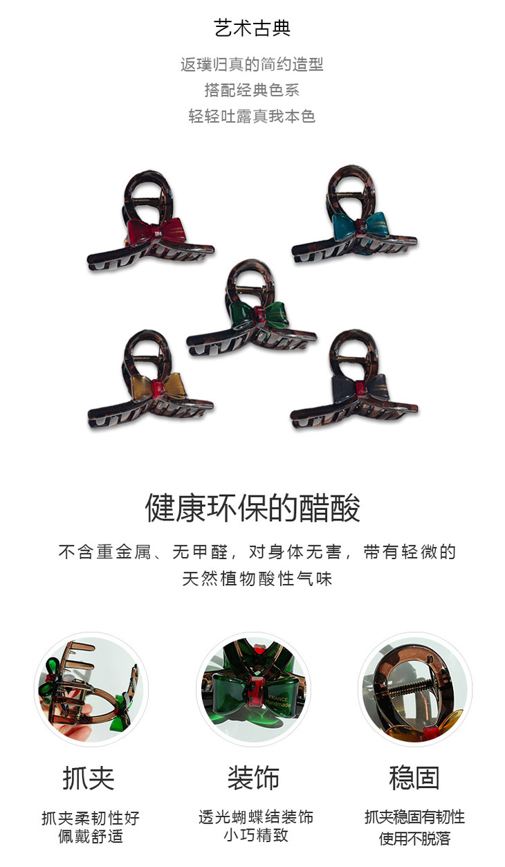 3.醋酸小领结抓夹 颜色:黑色、黄色、绿色、蓝色、红色 100%优质醋酸纤维:光泽自然温润,耐磨抗刮,不易变形或发黄,比普通塑料更显档次。 合金金属扣件:防锈耐用,开合顺滑,长期使用依然精致如新。 俏皮小领结设计,减龄又精致 立体领结造型:打破传统抓夹的单调,增添甜美、学院风或轻复古感,适合日常、约会、通勤等多种场合。 精致细节:领结线条流畅,边缘无毛刺,佩戴舒适不刮头发。