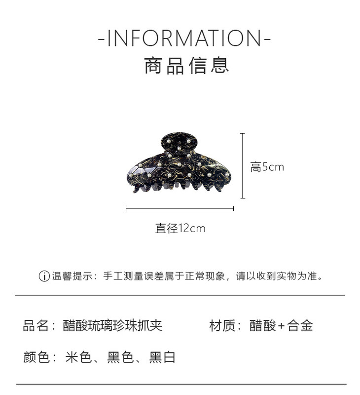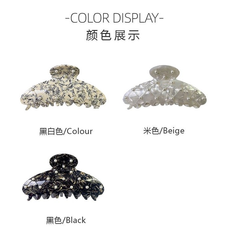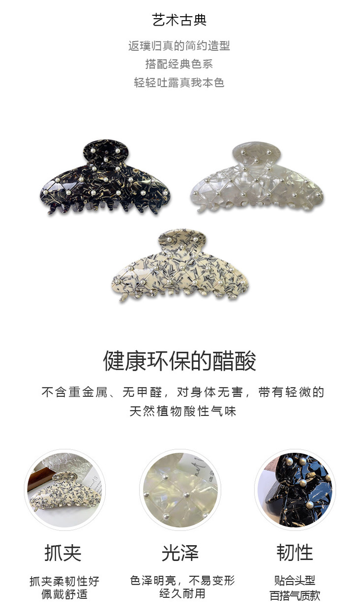 1..醋酸琉璃珍珠抓夹 颜色:黑色、黑白色、米色 醋酸纤维:光泽温润如玉,硬度高不易变形,比普通塑料更耐磨,久用不发黄。 合金+琉璃珍珠:金属部分采用防锈合金,珍珠为人工琉璃材质,通透感强,阳光下折射柔光,提升整体精致度 宽齿抓夹:大号设计(适合中长发、发量多人群),咬合紧密不滑落,单手可操作。 珍珠防刮设计:珍珠镶嵌处光滑无毛刺,避免勾头发或刮伤皮肤。