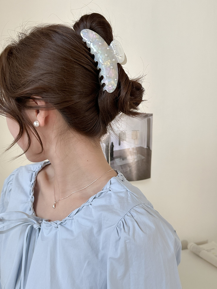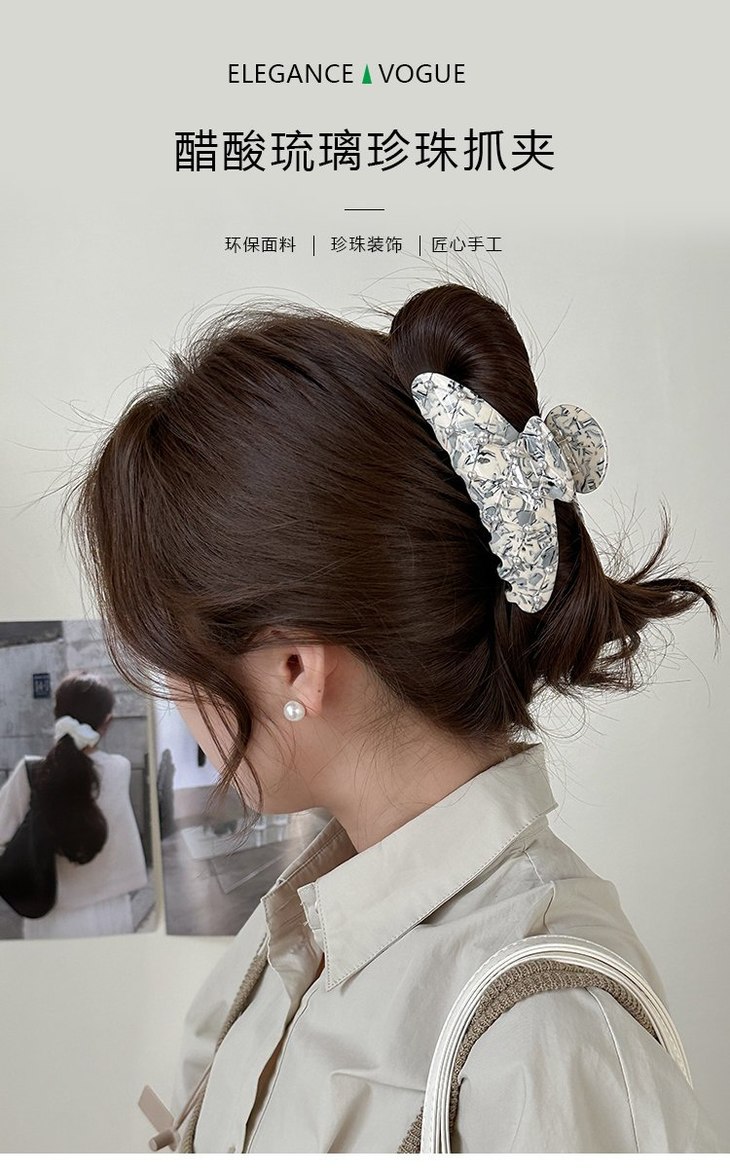 一夹多用:可固定高马尾、半扎发、低发髻,轻松打造法式慵懒或干练风格, 比普通发夹更显发量蓬松。 珍珠与醋酸材质碰撞,既有复古感又不失现代简约, 搭配真丝衬衫、小香风外套等显贵气。 上班快迟到?用它3秒搞定一个不塌的顶楼盘发; 约会时随意夹在耳侧,珍珠光泽衬得侧颜都温柔三分。”