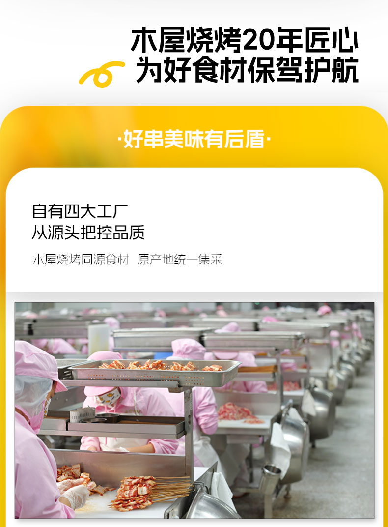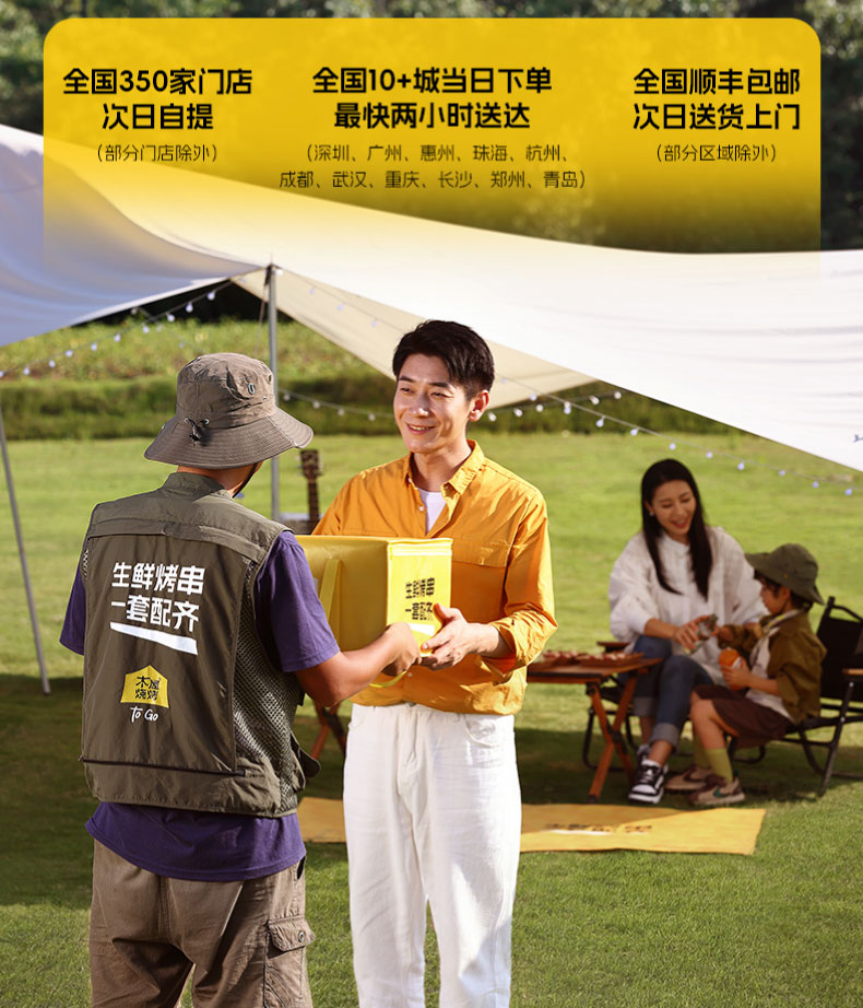 木屋烧烤半成品套装,一键下单,使命必达。 -全国300家门店支持次日到店自提 -全国顺丰包邮,当日下单,次日顺丰送货上门(部分区域除外,实际以顺丰时效为准)