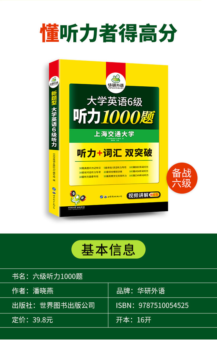 2.大开本大学英语六级听力训练书,方便书写及答题;