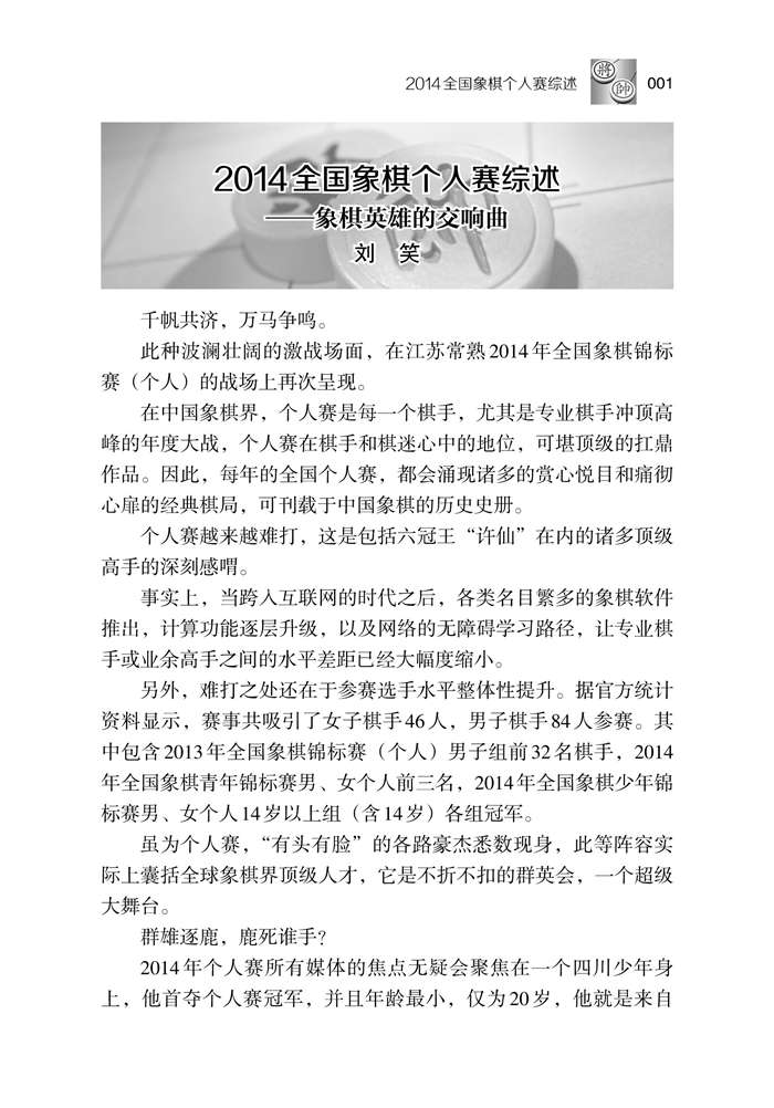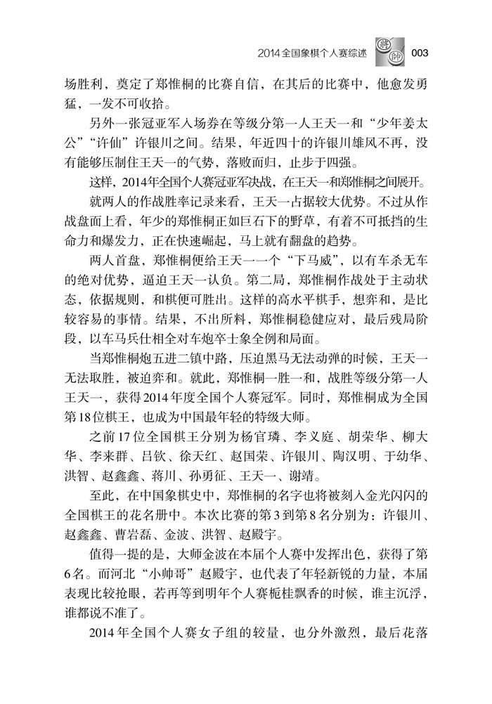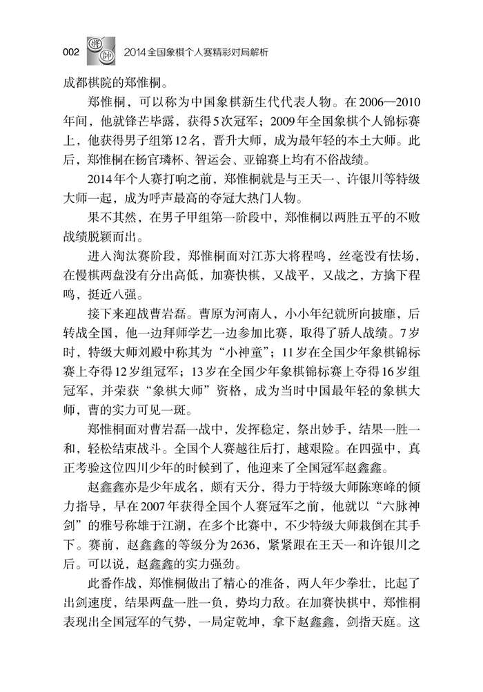目 录 年全国象棋个人赛综述… 章布局撷英… 第节冷门布局的复出… 第局谢业枧 先和 蔚强… 第局郑一泓 先胜 张兰天… 第局谢业枧 先负 杨辉… 第局杨辉 先胜 谢靖… 第局黄仕清 先负 庄玉庭… 第节以柔制柔的顺象局… 第局李晓晖 先负 林文汉… 第局王斌 先胜 李翰林… 第局崔革 先和 曹岩磊… 第局赵殿宇 先和 曹岩磊… 第节 马卒互制高下难分… 第局姚洪新 先负 蒋川… 第局赵金成 先胜 谢丹枫… 第局赵金成 先负 申鹏… 第局曹岩磊 先和 崔革… 第局曹岩磊 先负 郑惟桐… 第二章乙组对局精选… 第局黄光颖 先负 柳大华… 第局陶汉明 先胜 李成蹊… 第局肖革联 先负 李鸿嘉… 第局张强 先胜 陶汉明… 第局尚培峰 先胜 李进… 第局何文哲 先负 崔革… 第局赵殿宇 先胜 李成蹊… 第局李晓晖 先负 杨辉… 第局崔峻 先负 黄仕清… 第局李俊峰 先负 林文汉… 第局聂铁文 先胜 李炳贤… 第局赵玮 先胜 陶汉明… 第局徐崇峰 先负 赵殿宇… 第局谢丹枫 先胜 李鸿嘉… 第局陶汉明 先胜 孙博… 第局谢岿 先胜 高海军… 第局姚洪新 先胜 宿少峰… 第局李晓晖 先负 林文汉… 第局孙浩宇 先负 赵子雨… 第局张欣 先胜 柳大华… 第三章甲组预选赛精选… 第轮(年月日)… 第局王天一 先胜 于幼华… 第局许银川 先胜 张彬… 第局郑惟桐 先胜 刘奕达… 第局尚培峰 先负 陶汉明… 第局朱晓虎 先负 申鹏… 第局王斌 先胜 李翰林… 第局景学义 先胜 庄玉庭… 第局才溢 先负 党斐… 第局卜凤波 先胜 张欣… 第局赵玮 先胜 黄仕清… 第轮(年月日)… 第局赵鑫鑫 先胜 李鸿嘉… 第局赵殿宇 先胜 金波… 第局张欣 先负 武俊强… 第局姚洪新 先负 蒋川… 第局谢业枧 先负 王天一… 第局谢丹枫 先负 曹岩磊… 第局陶汉明 先胜 卜凤波… 第局景学义 先负 郑惟桐… 第局张申宏 先胜 尚培峰… 第局申鹏 先和 赵玮… 第轮(年月日)… 第局 王天一 先胜 蒋川… 第局谢靖 先负 刘明… 第局曹岩磊 先胜 邱东… 第局郑一泓 先胜 张兰天… 第局程鸣 先胜 姚洪新… 第局武俊强 先胜 张申宏… 第局陈泓盛 先胜 薛文强… 第局孙逸阳 先负 崔革… 第局赵金成 先胜 谢丹枫… 第局郑惟桐 先和 陶汉明… 第轮(年月日)… 第局张申宏 先负 谢靖… 第局陶汉明 先胜 曹岩磊… 第局钟少鸿 先胜 谢业枧… 第局李翰林 先负 孙逸阳… 第局薛文强 先负 庄玉庭… 第局尚培峰 先胜 景学义… 第轮(年月日)… 第局才溢 先负 谢丹枫… 第局谢业枧 先负 杨辉… 第局赵金成 先负 申鹏… 第局赵玮 先胜 许国义… 第局程吉俊 先负 刘奕达… 第轮(年月日)… 第局杨辉 先胜 谢靖… 第局黄仕清 先负 庄玉庭… 第局崔革 先胜 曹岩磊… 第局秦荣 先负 张强… 第局张申宏 先负 张欣… 第局蒋川 先胜 李少庚… 第轮(年月日)… 第局许银川 先胜 聂铁文… 第局金波 先胜 赵玮… 第四章男子甲组决赛全貌… 第轮(年月日下午—月日上午)… 第局孟辰 先负 王天一… 第局王天一 先和 孟辰… 第局蒋川 先和 洪智… 第局洪智 先胜 蒋川… 第局许银川 先和 陶汉明… 第局陶汉明 先和 许银川… 第局许银川 先胜 陶汉明… 第局陈栋 先负 金波… 第局金波 先和 陈栋… 第局曹岩磊 先和 崔革… 第局崔革 先和 曹岩磊… 第局曹岩磊 先胜 崔革… 第局郑惟桐 先和 程鸣… 第局程鸣 先和 郑惟桐… 第局郑惟桐 先和 程鸣… 第局程鸣 先负 郑惟桐… 第局张 先和 赵殿宇… 第局赵殿宇 先和 张… 第局张 先负 赵殿宇… 第局党斐 先和 赵鑫鑫… 第轮 八强战(年月日下午—月日上午)… 第局王天一 先和 洪智… 第局洪智 先和 王天一… 第局王天一 先和 洪智… 第局洪智 先负 王天一… 第局许银川 先胜 金波… 第局金波 先和 许银川… 第局曹岩磊 先负 郑惟桐… 第局郑惟桐 先和 曹岩磊… 第局赵鑫鑫 先胜 赵殿宇… 第局赵殿宇 先和 赵鑫鑫… 第轮 半决赛(年月日下午—月日上午)… 第局许银川 先和 王天一… 第局王天一 先胜 许银川… 第局赵鑫鑫 先胜 郑惟桐… 第局金波 先和 洪智… 第局洪智 先负 金波… 第局曹岩磊 先和 赵殿宇… 第局赵殿宇 先和 曹岩磊… 第轮决赛(年月日下午—月日上午)… 第局郑惟桐 先胜 王天一… 第局王天一 先和 郑惟桐… 第局许银川 先和 赵鑫鑫… 第局赵鑫鑫 先和 许银川… 第局许银川 先和 赵鑫鑫… 第局赵鑫鑫 先负 许银川… 第局曹岩磊 先和 金波… 第局金波 先负 曹岩磊… 第五章附录… 全国象棋个人赛男子乙组终成绩… 全国象棋个人赛男子甲组预赛成绩… 全国象棋个人赛男子决赛成绩… 全国象棋个人赛女子组成绩… |
