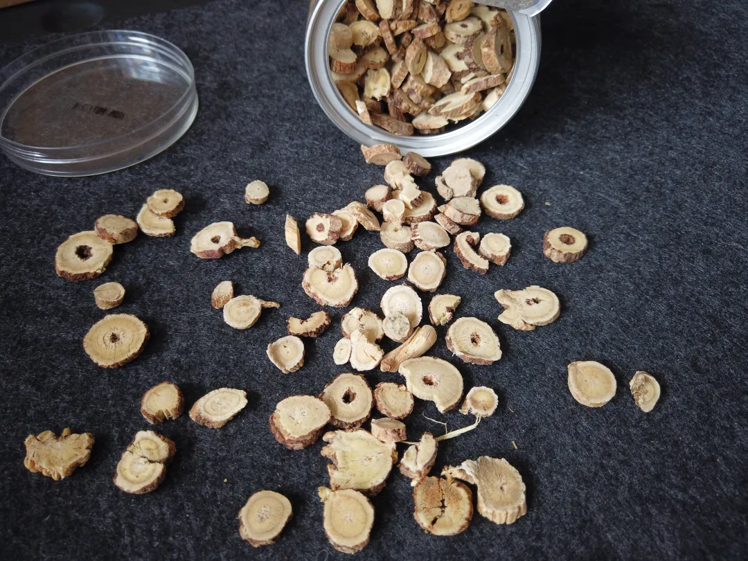 长白山黄芪,野生环境生长,其形态各异,根条弯曲,多分支,所以切片后形态大小不均匀,切面粗糙,有空隙,不光滑,但是纹理清晰。