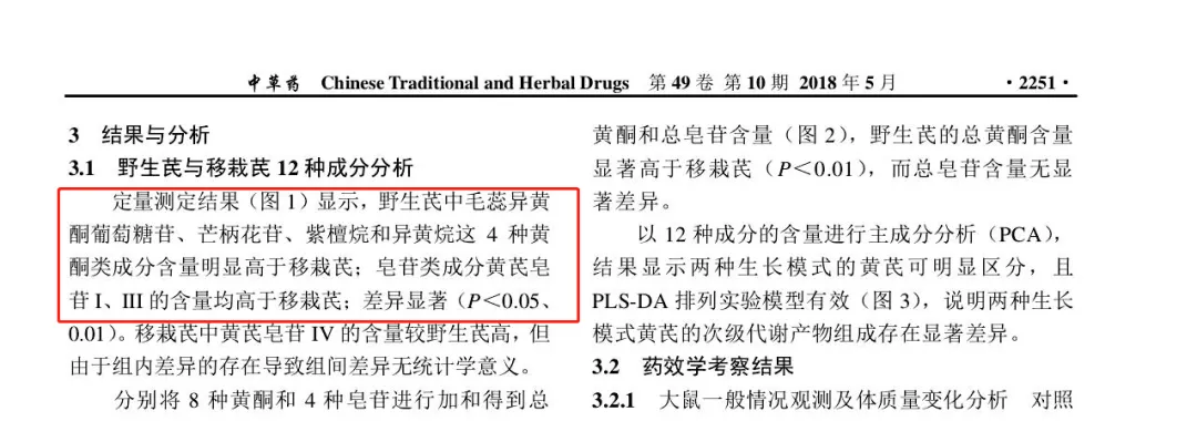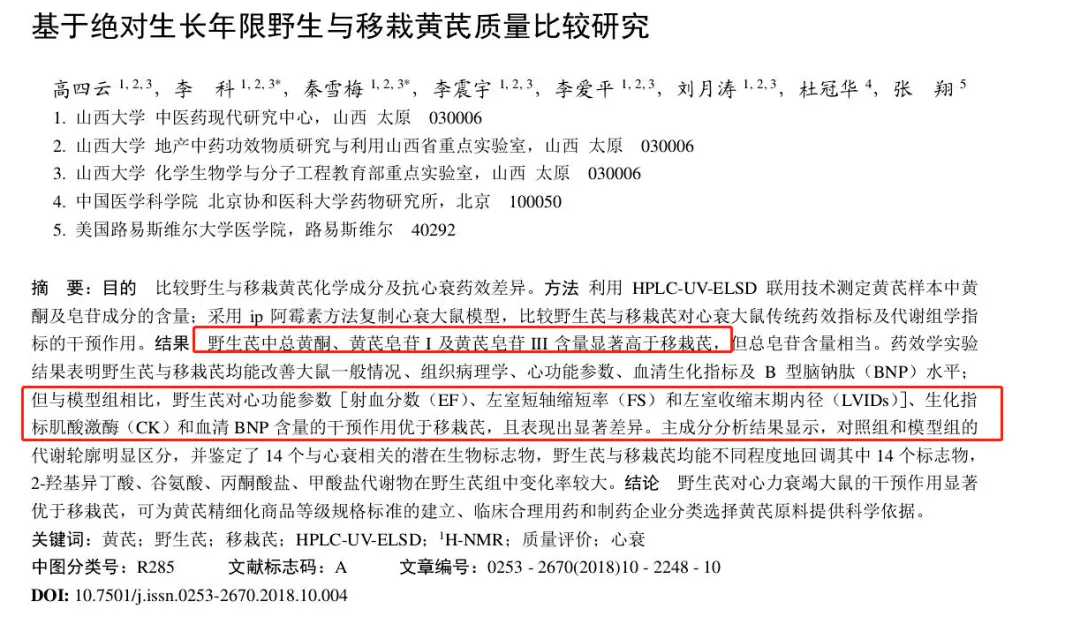 长白山黄芪,野生采集,其成分,纷繁复杂,已被揭秘的有黄酮和黄芪皂苷,还有一些有效物质正在被医学研究中,从下图的文章中,得出,野生黄芪中的有效成分能够更好作用试验对象,效果比种植的更优。
