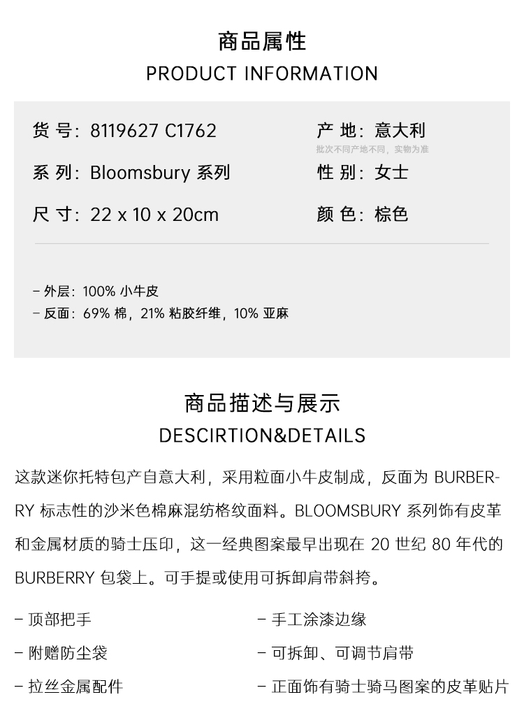 BURBERRY 巴宝莉 女士迷你双面 Bloomsbury 系列提挎包 棕色 8119627 C1762