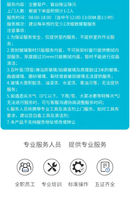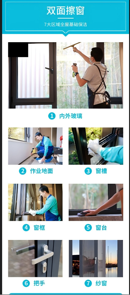 - 擦玻璃包含纱窗、窗槽、窗框、玻璃里外除尘,擦拭(顶高不超3米,超3米根据现场情况)
