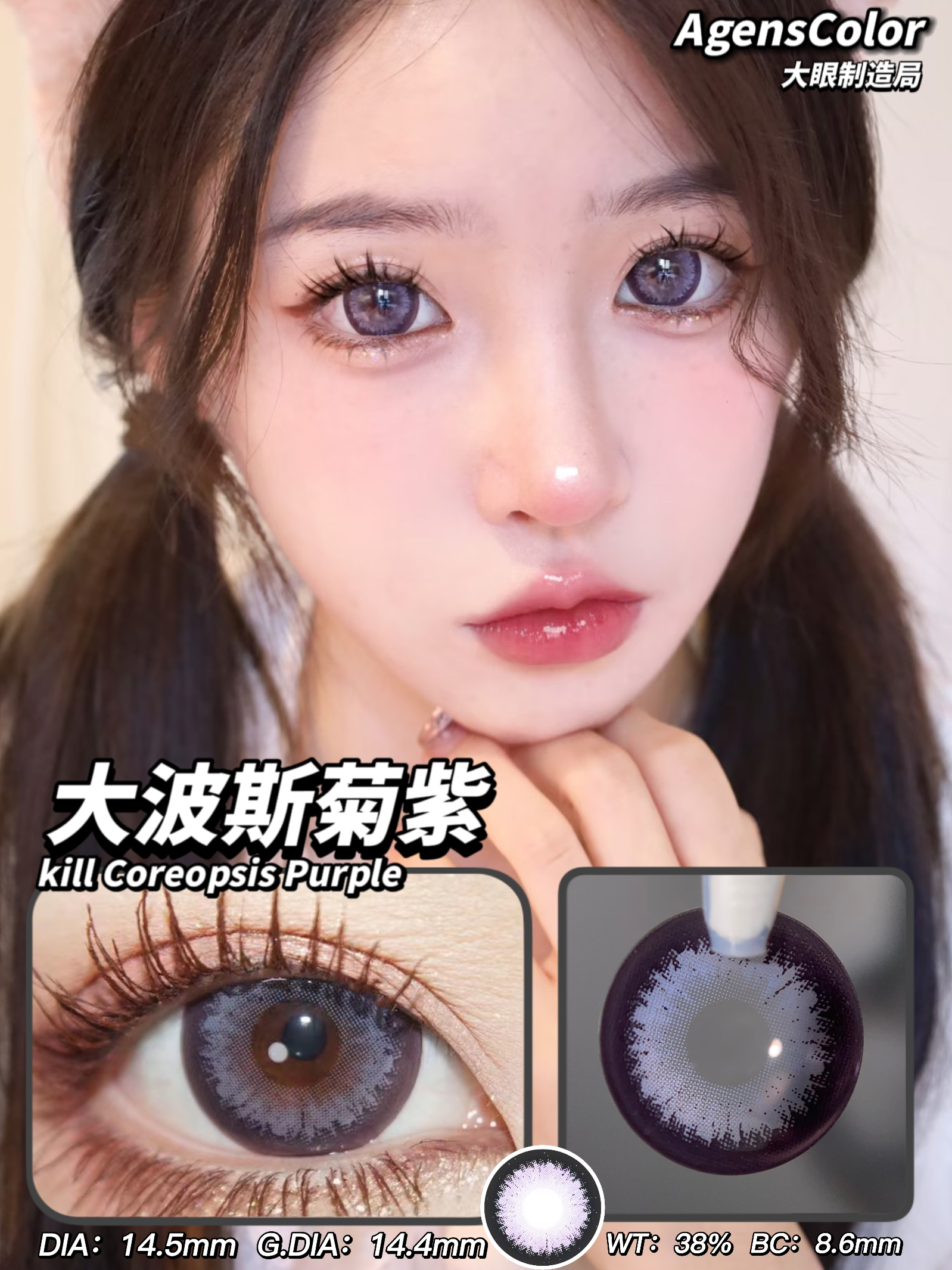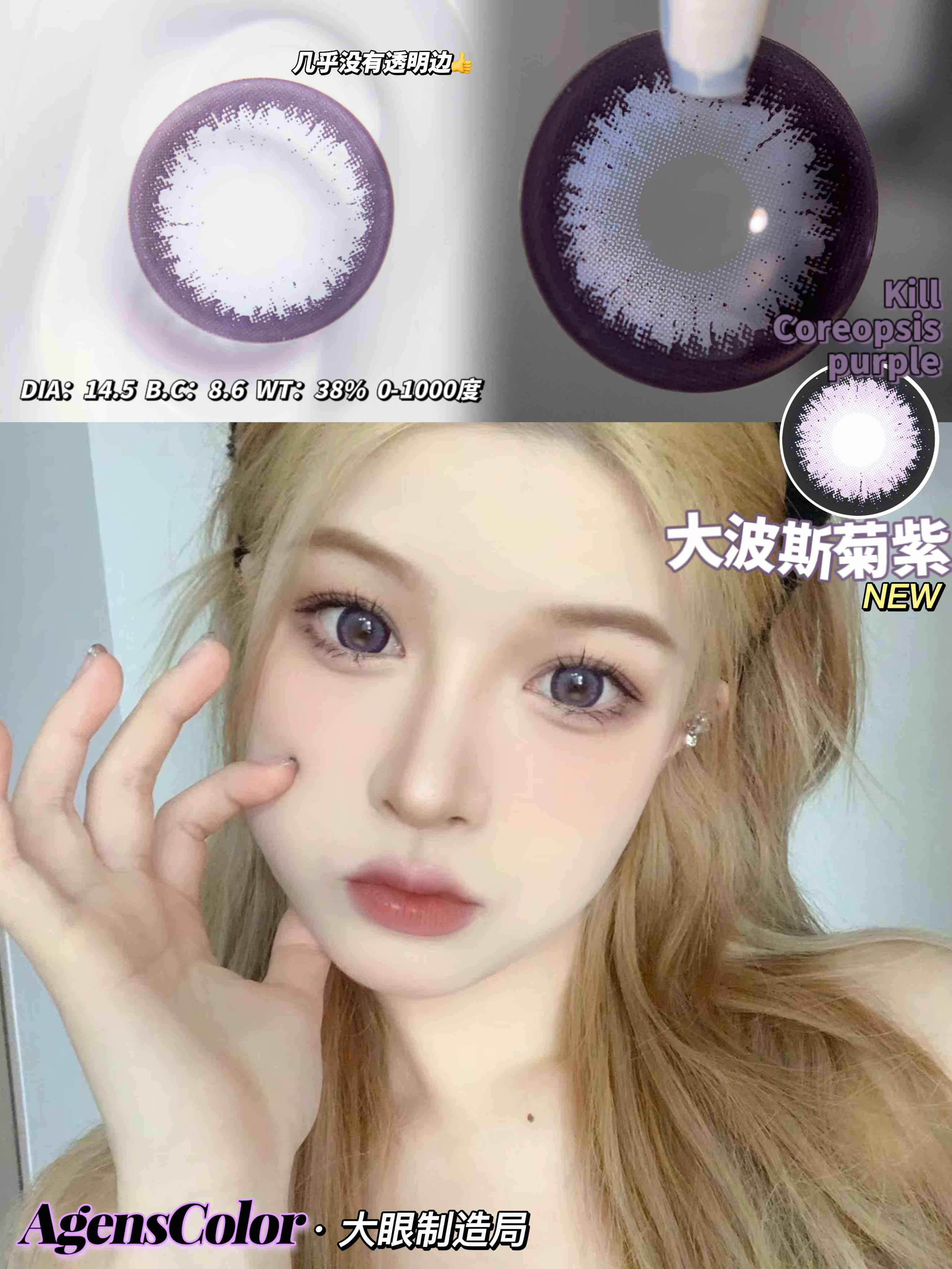 年抛 (编号827) 波斯菊紫 AgensColor / 大直径14.5 着色14.4 / (同品牌多副更划算 选款色板在详情页) 紫色美瞳