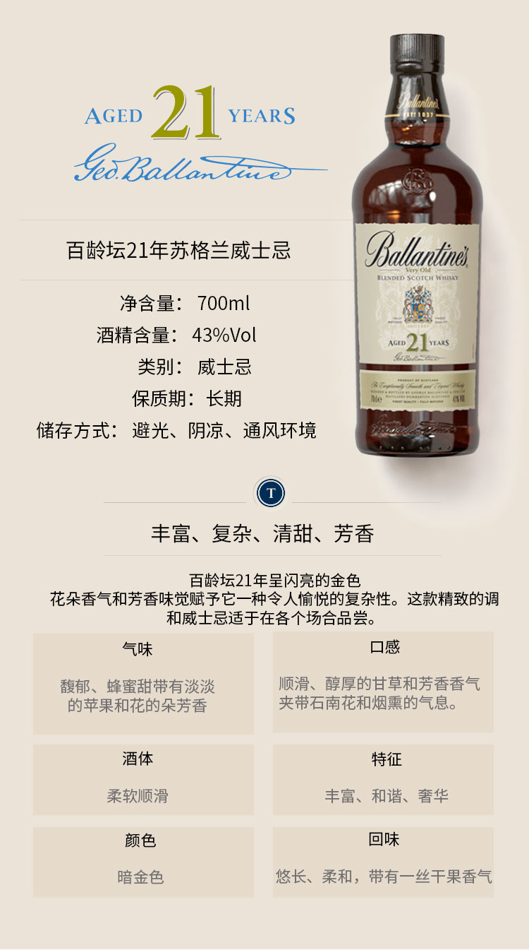 百龄坛21年 苏格兰调和型威士忌 700ml