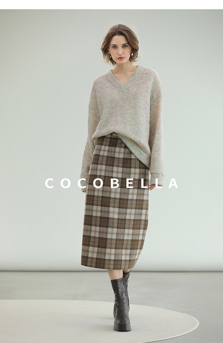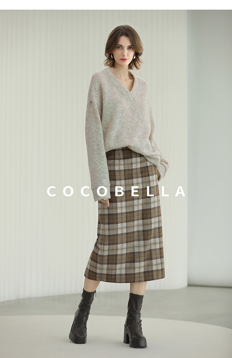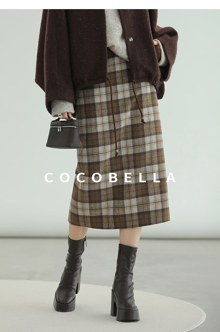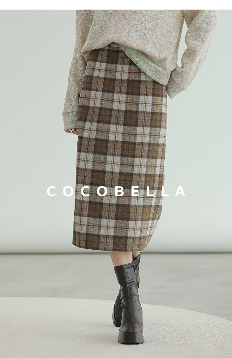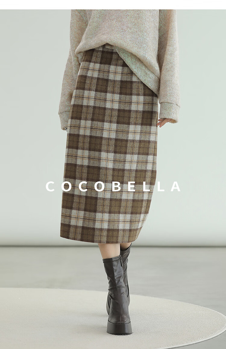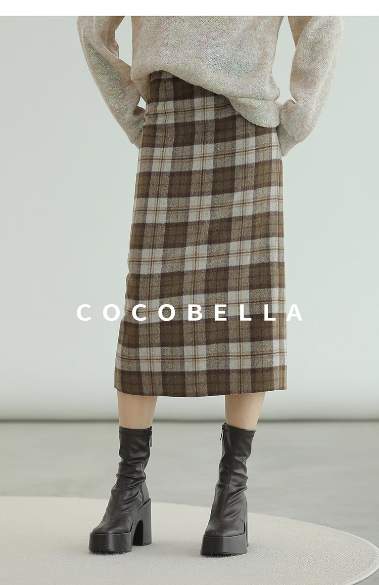 COCOBELLA老钱风复古格纹毛呢半身裙女秋冬气质直筒裙HS3148