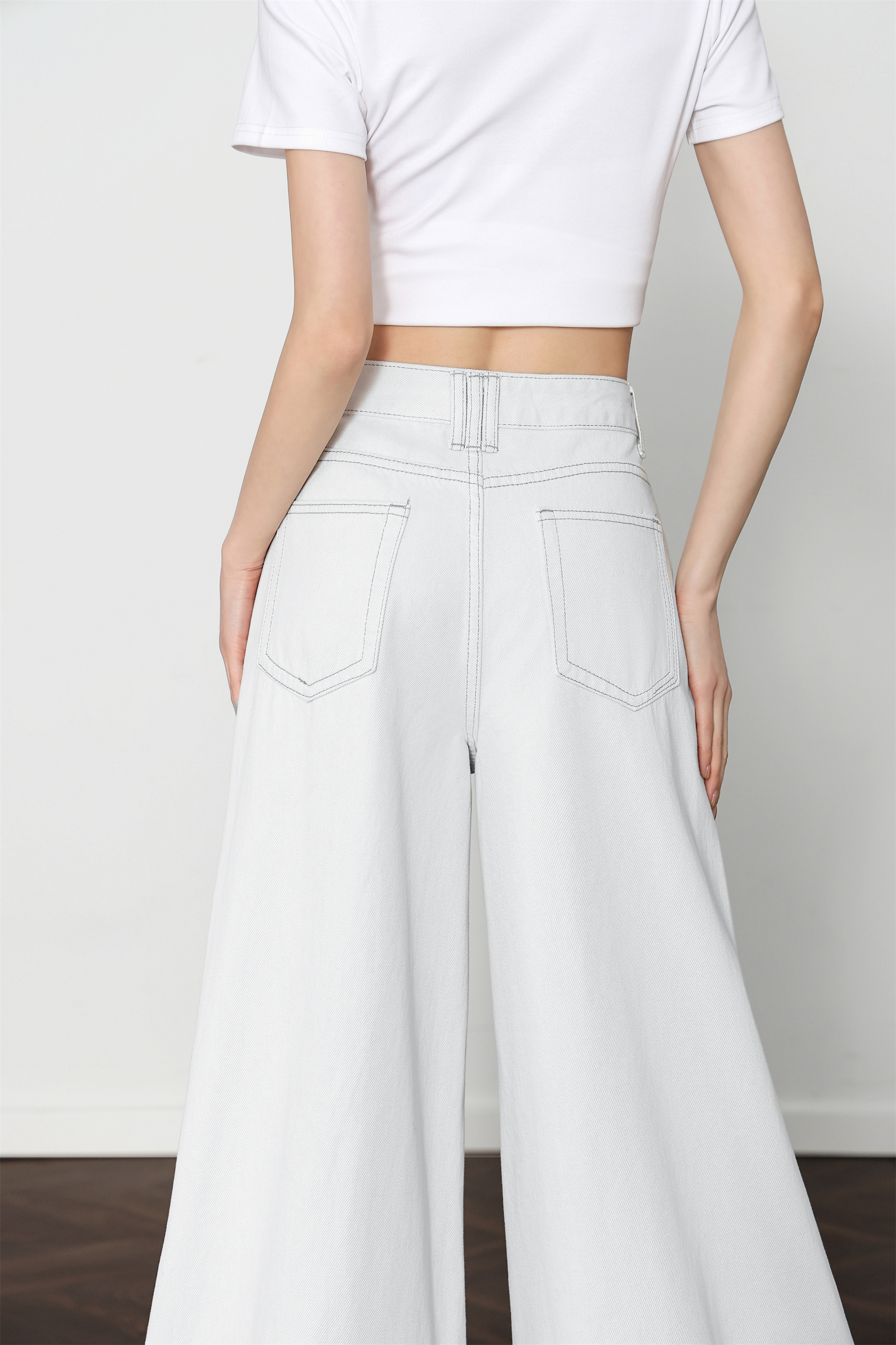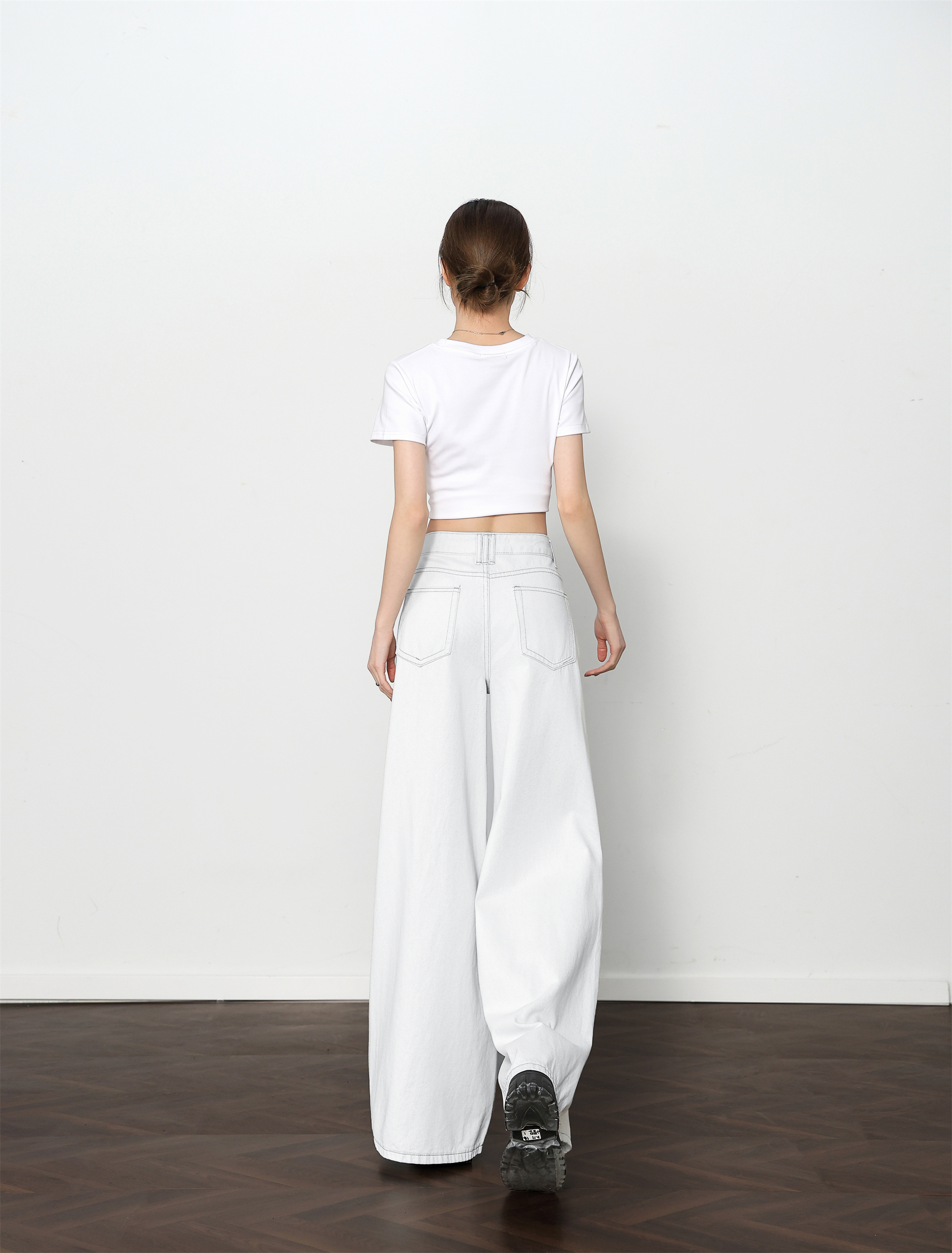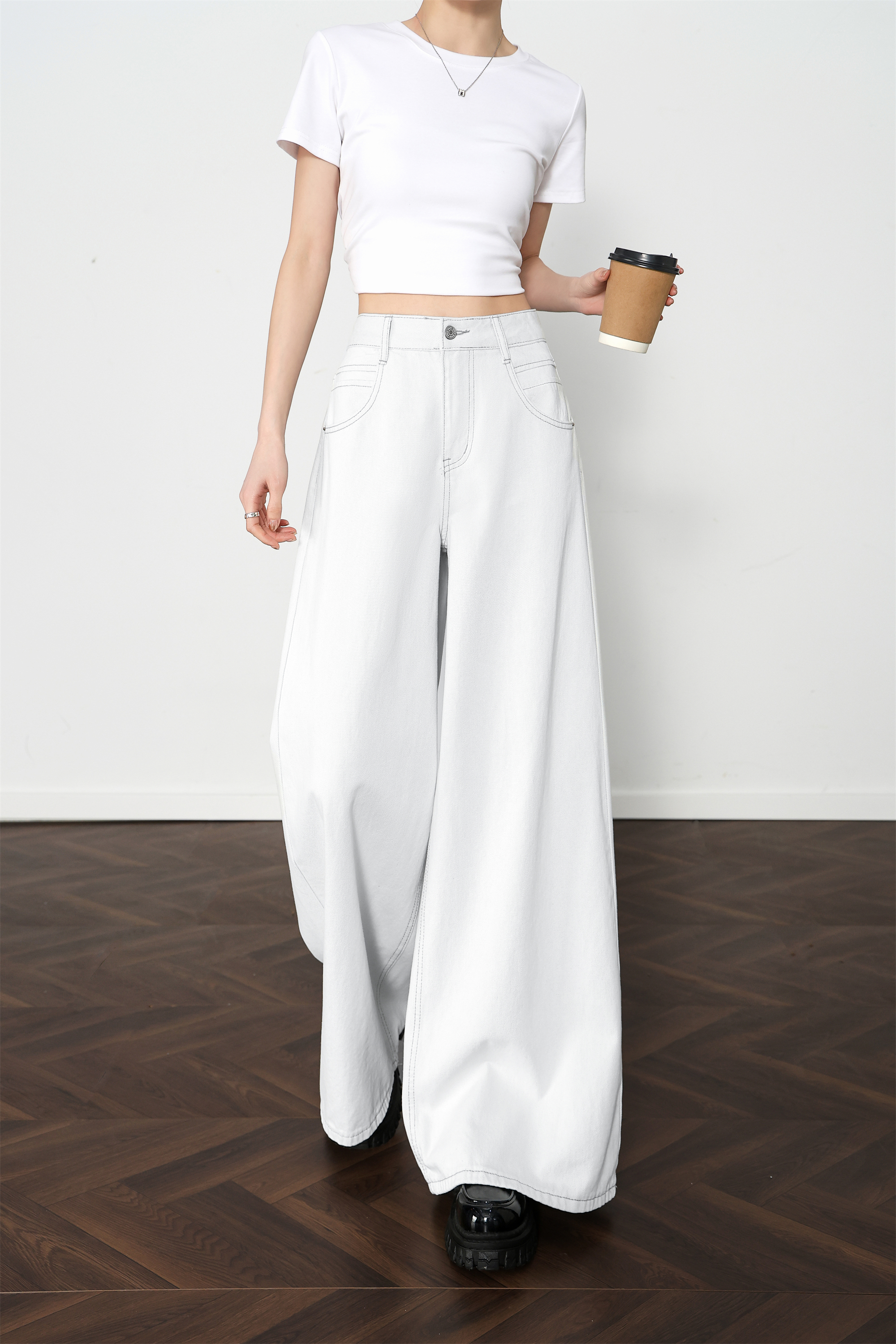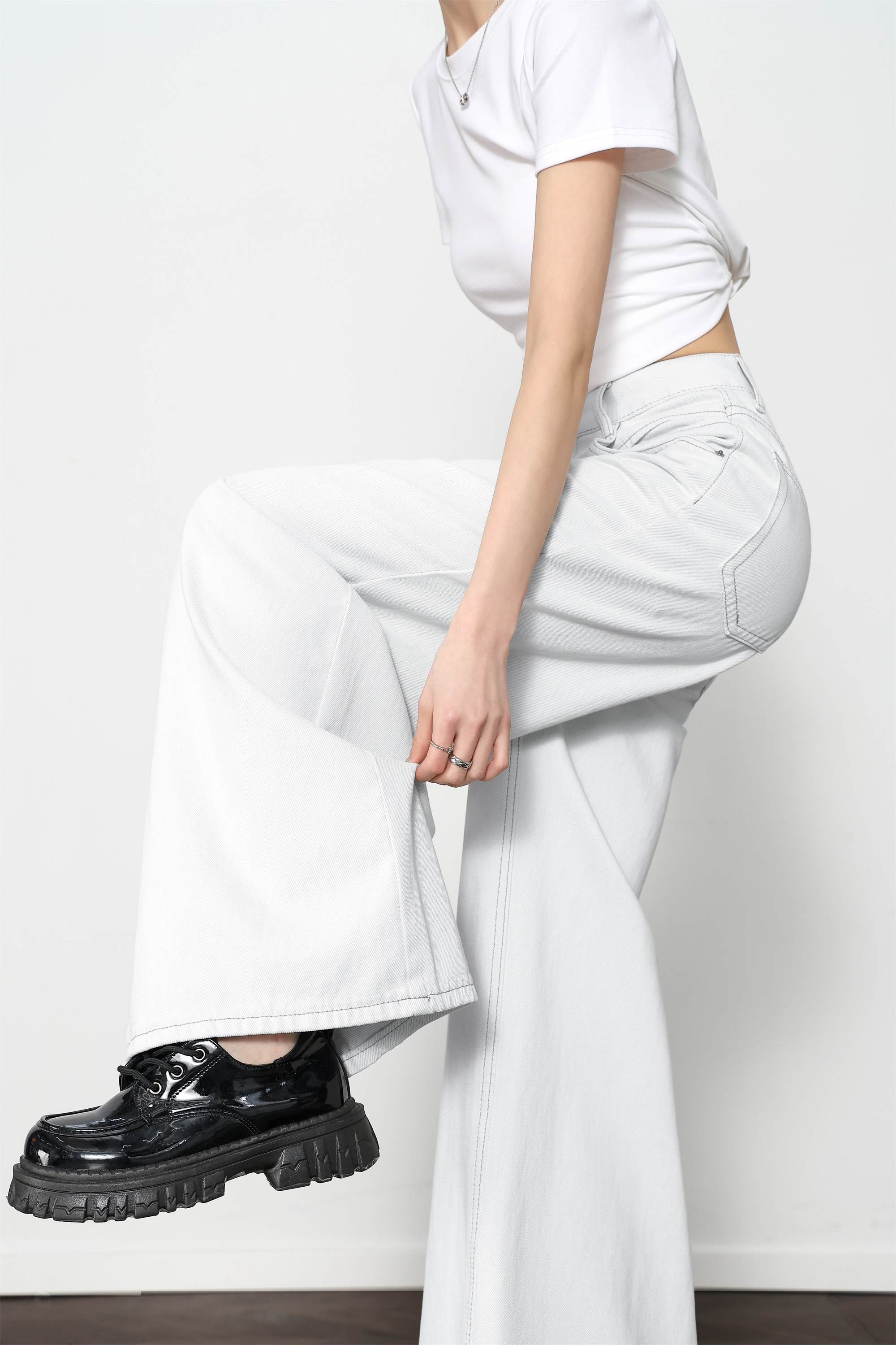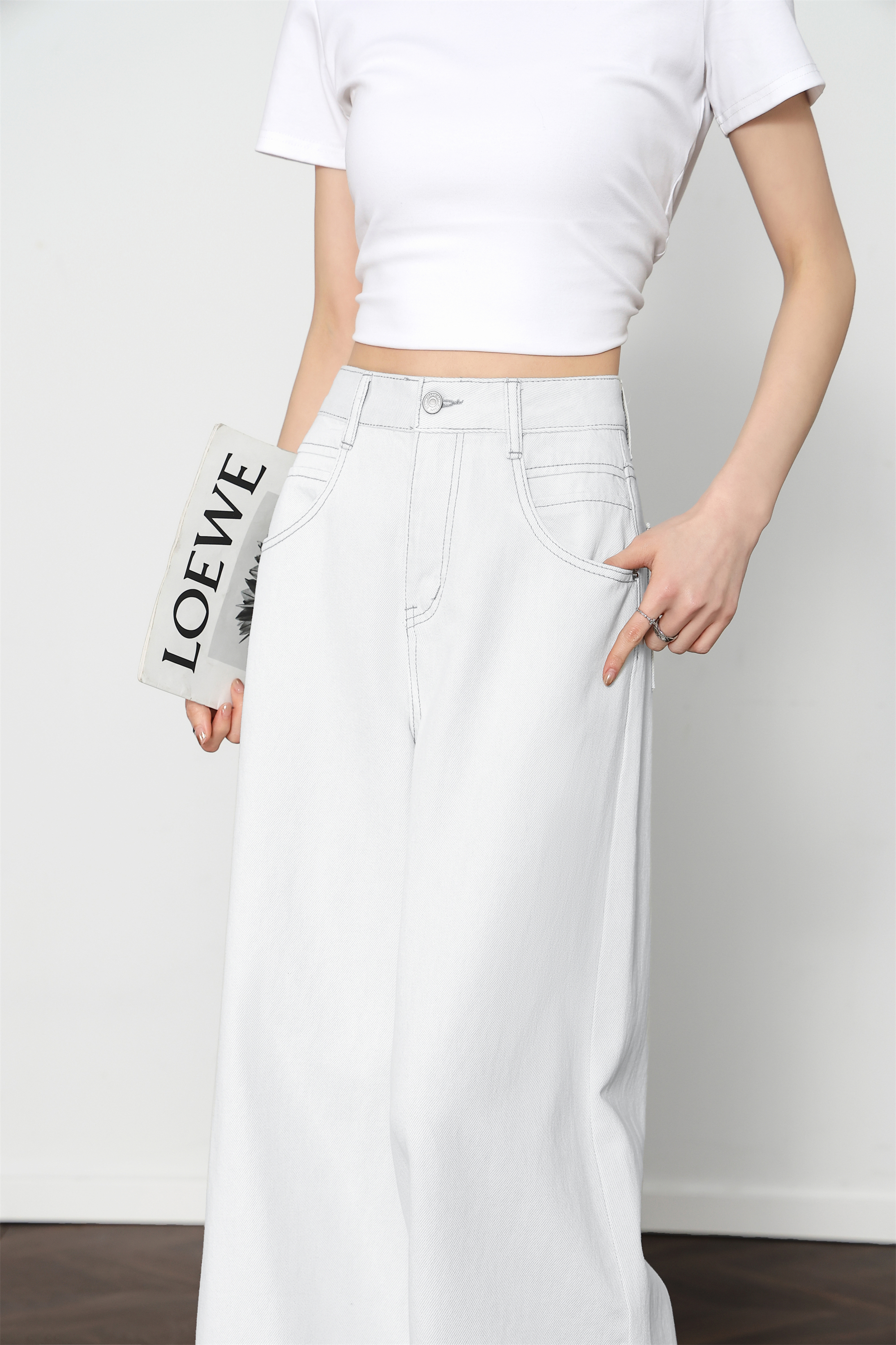 西遇宽松水洗牛仔裤女新款通勤高腰慵懒风白色阔腿裤D0050425