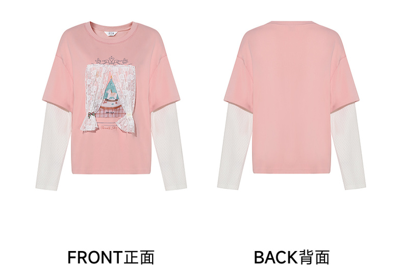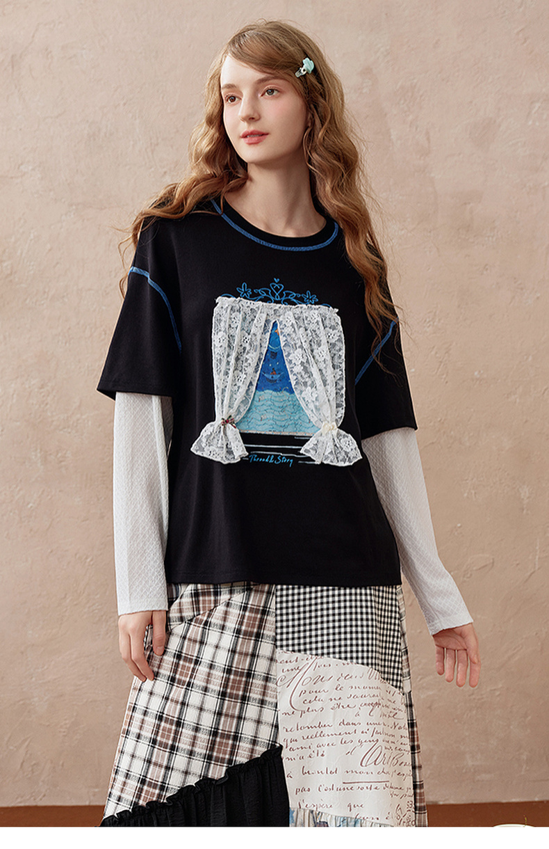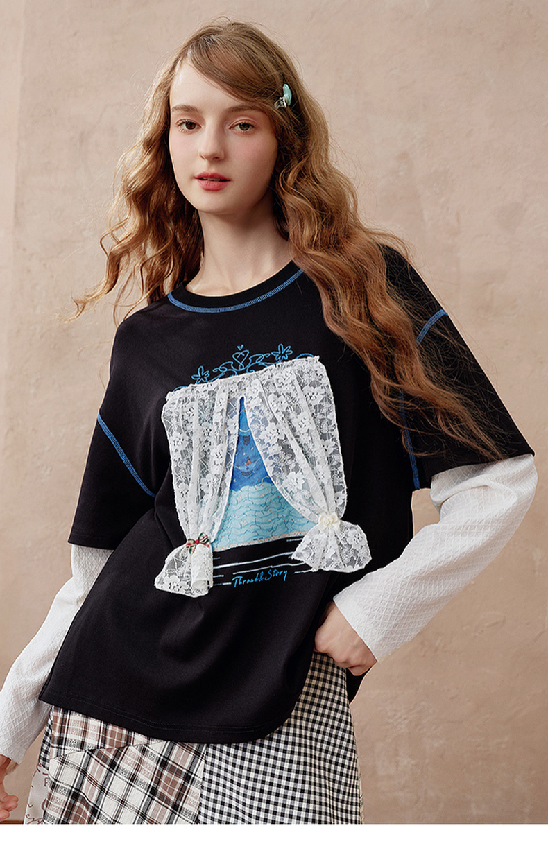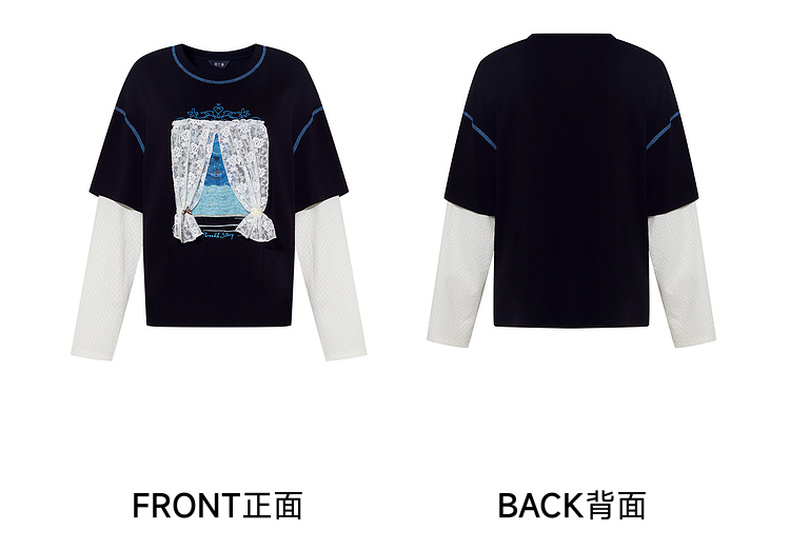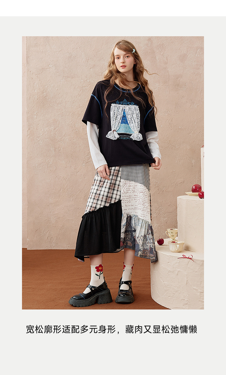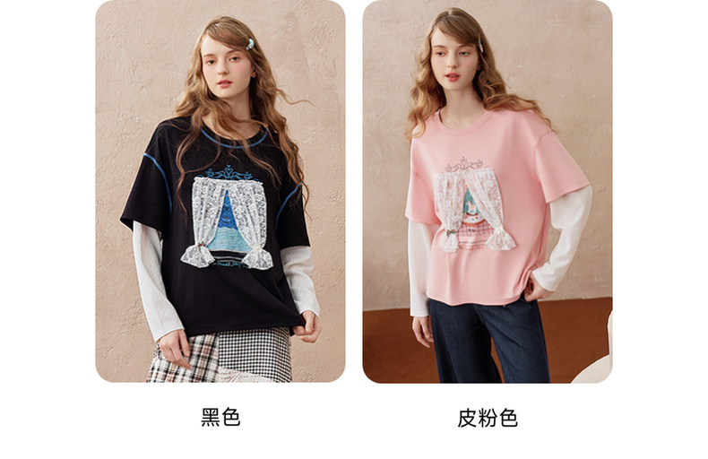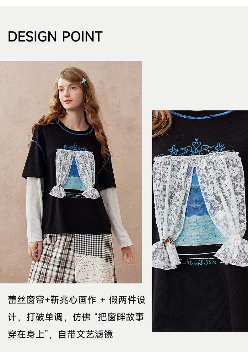 两三事绮窗旋梦2025秋季新款小清新拼接款印花假两件t恤女宽松