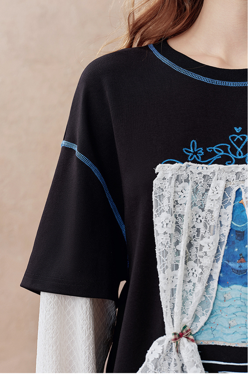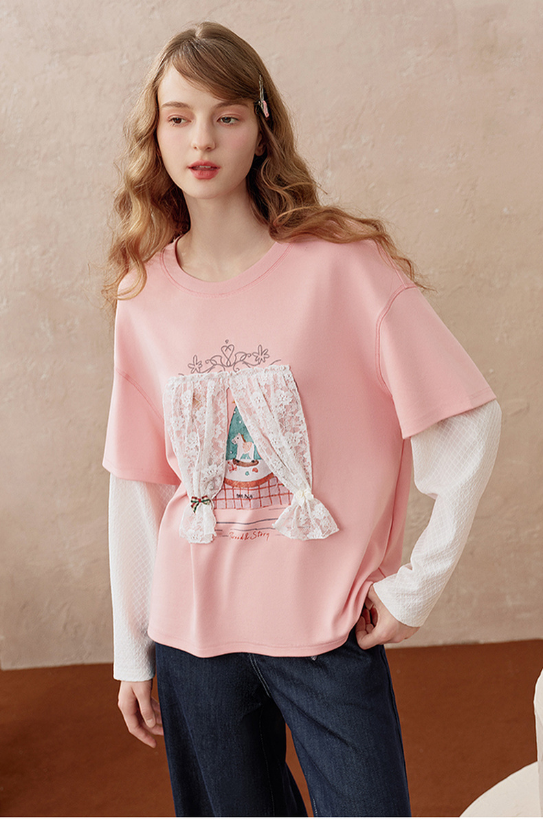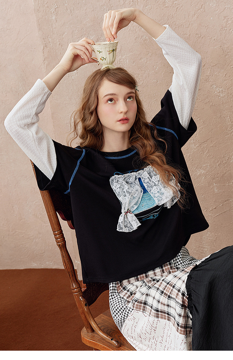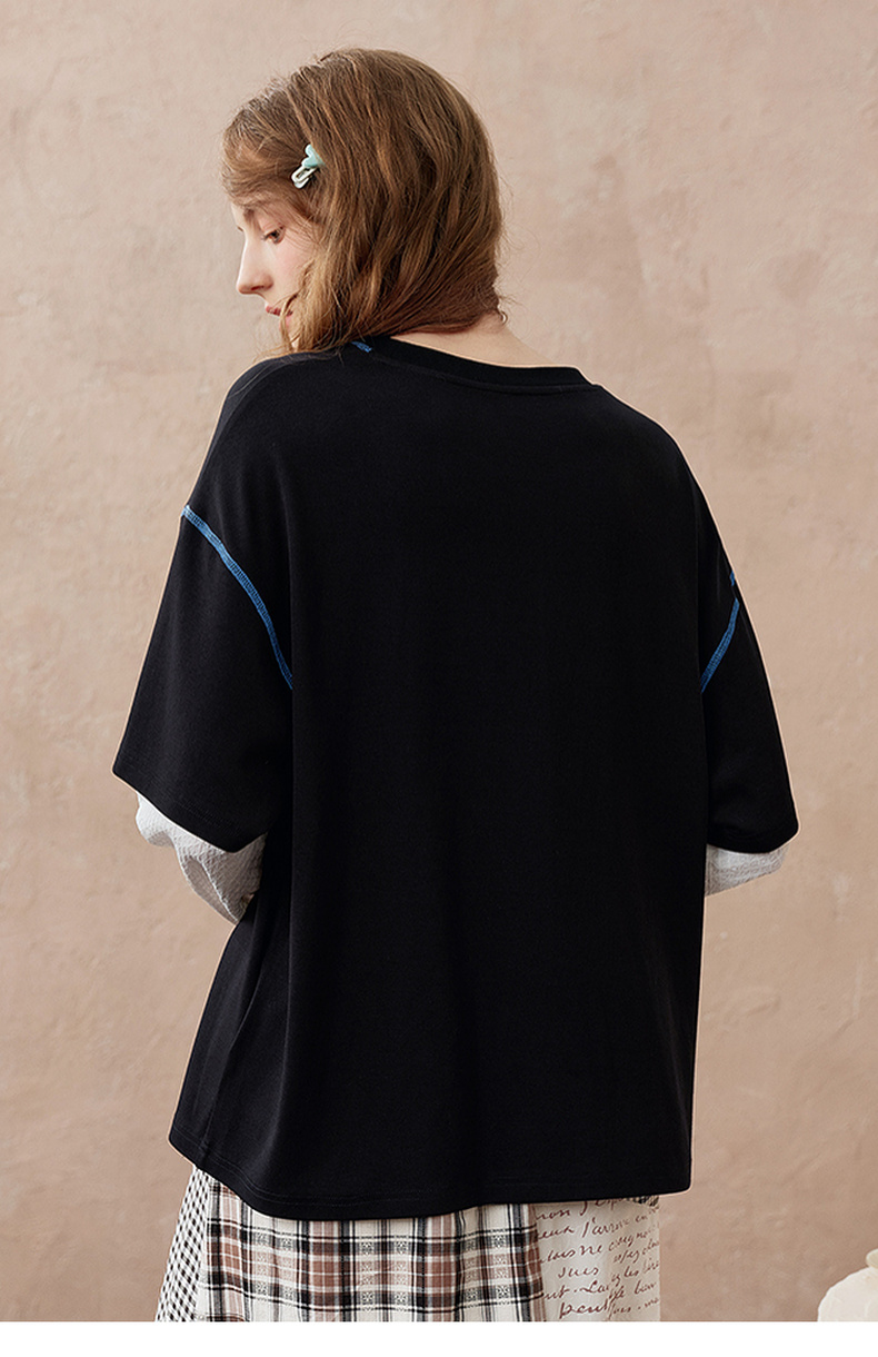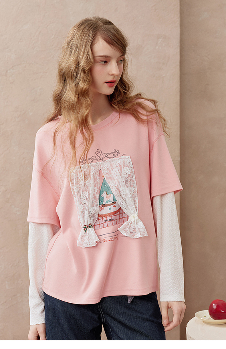 两三事绮窗旋梦2025秋季新款小清新拼接款印花假两件t恤女宽松