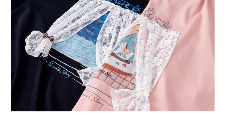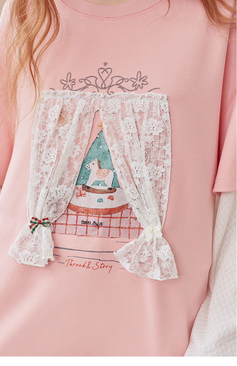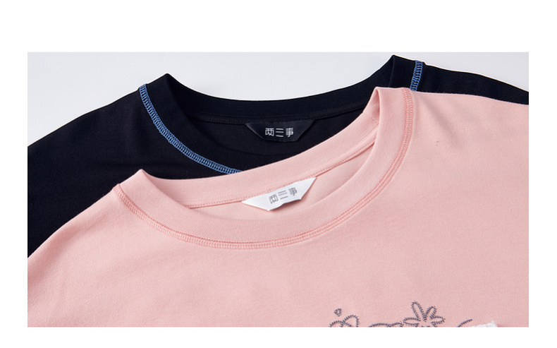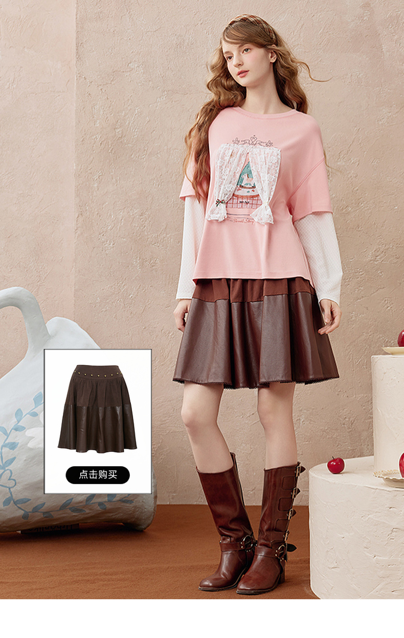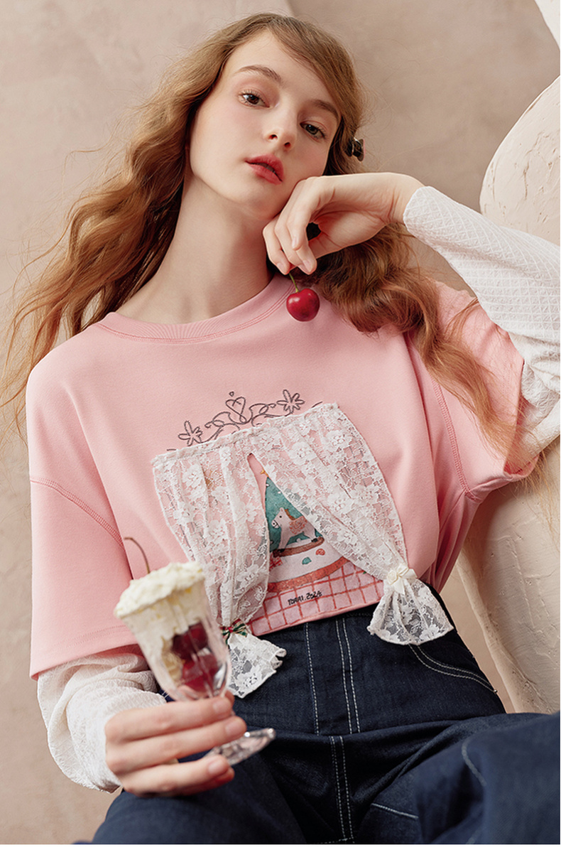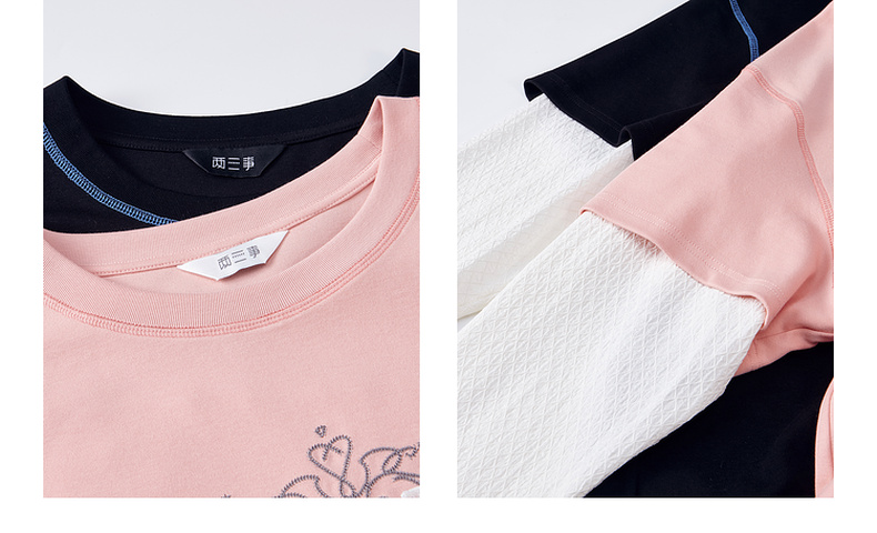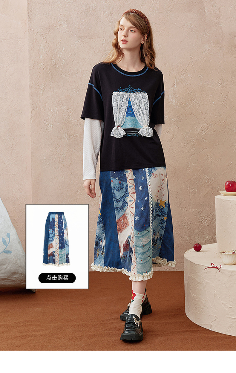 两三事绮窗旋梦2025秋季新款小清新拼接款印花假两件t恤女宽松