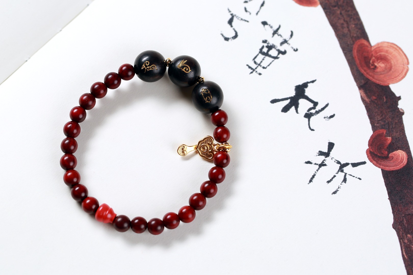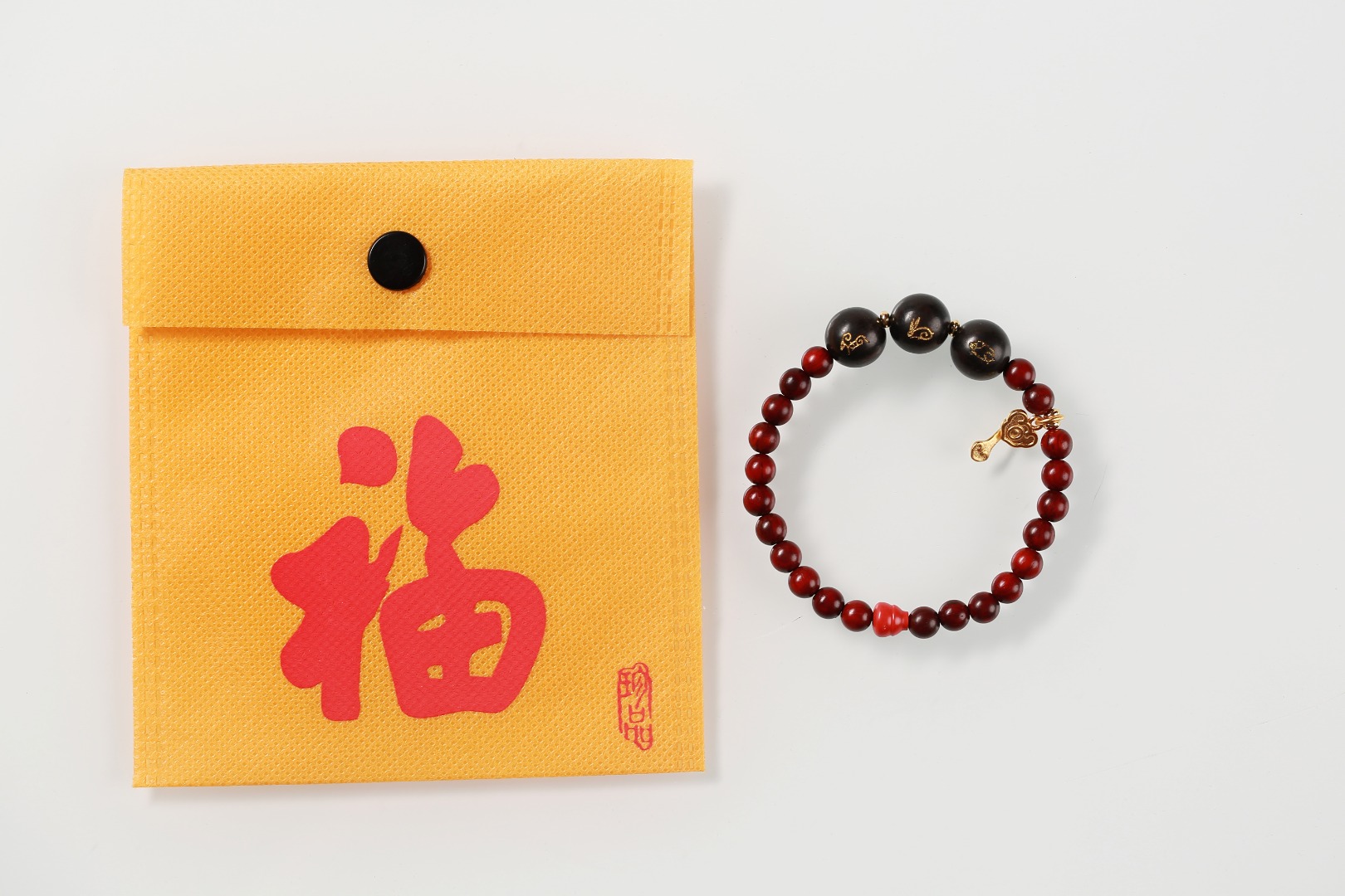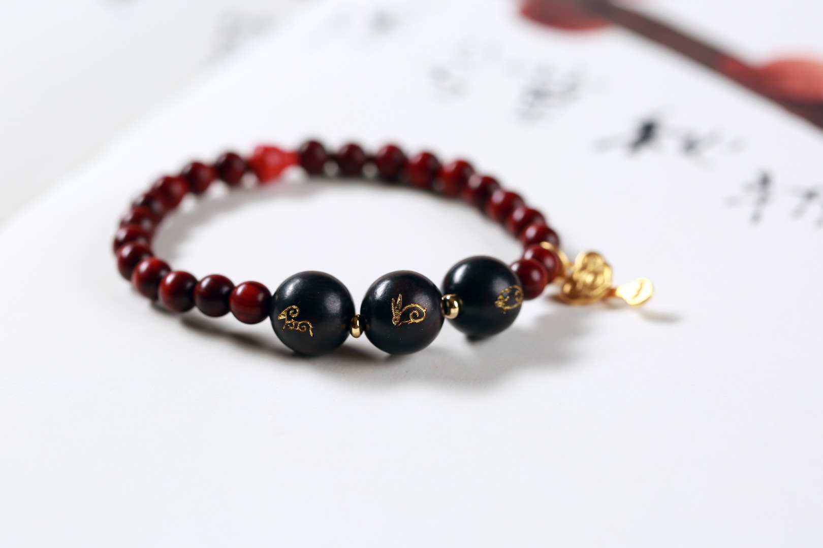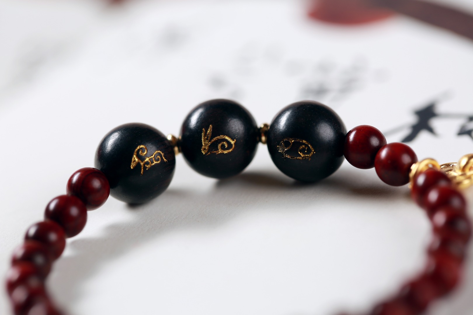 【设计理念】选取紫檀和紫光檀为材,运用传统工艺虔诚制作,融入金粉,通过三合生肖的方式化解太岁,三合即三种生肖的吉祥搭配,可助力运程,同时搭配高含量朱砂提升正能量,还有五行木金元素,道家葫芦/如意法器,以及吉祥红/富贵金,多位一体,更全面的应对和化解太岁,祈愿癸卯兔年万事顺意。