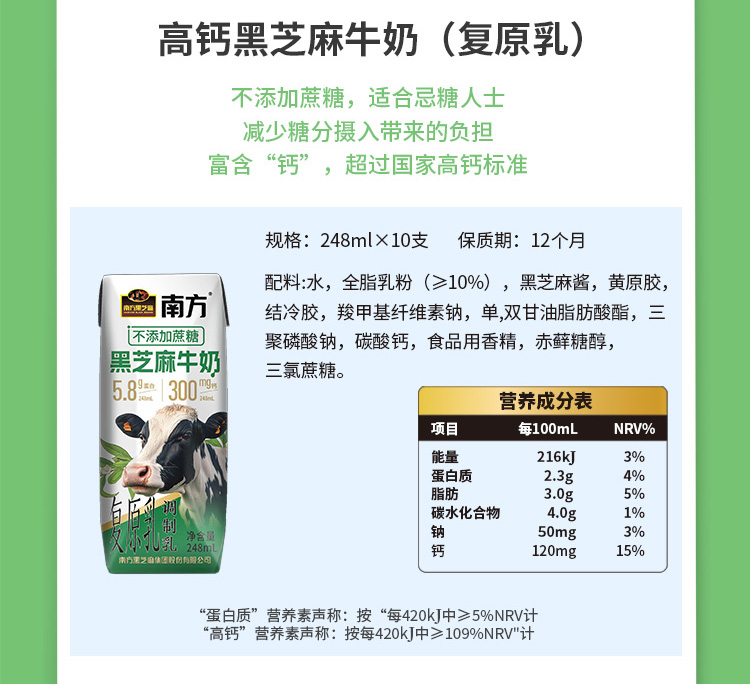 【品牌直营】南方高钙黑芝麻牛奶(复原乳) (不添加蔗糖)248mL*10支/提