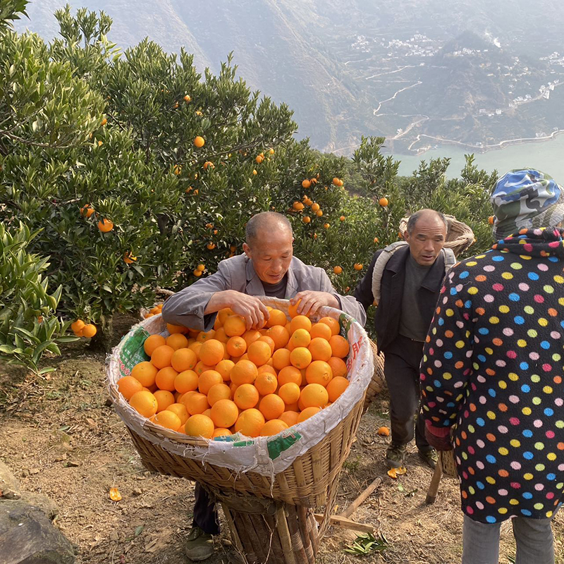 红橙的果园地势陡峭,道路狭窄,车子只能到山底下,果园到山底下的路都是靠人力运下去,参与搬运的农户们一般都是五六十岁,将一百斤的橙子扛起来,冬季里汗如雨注。