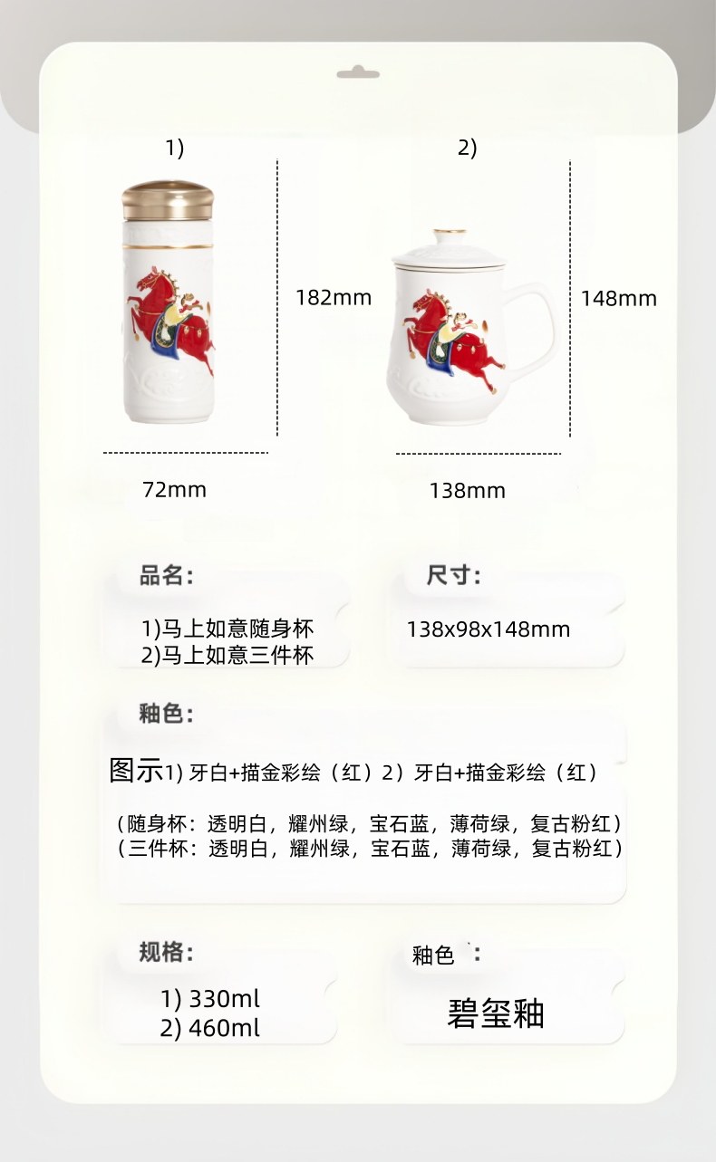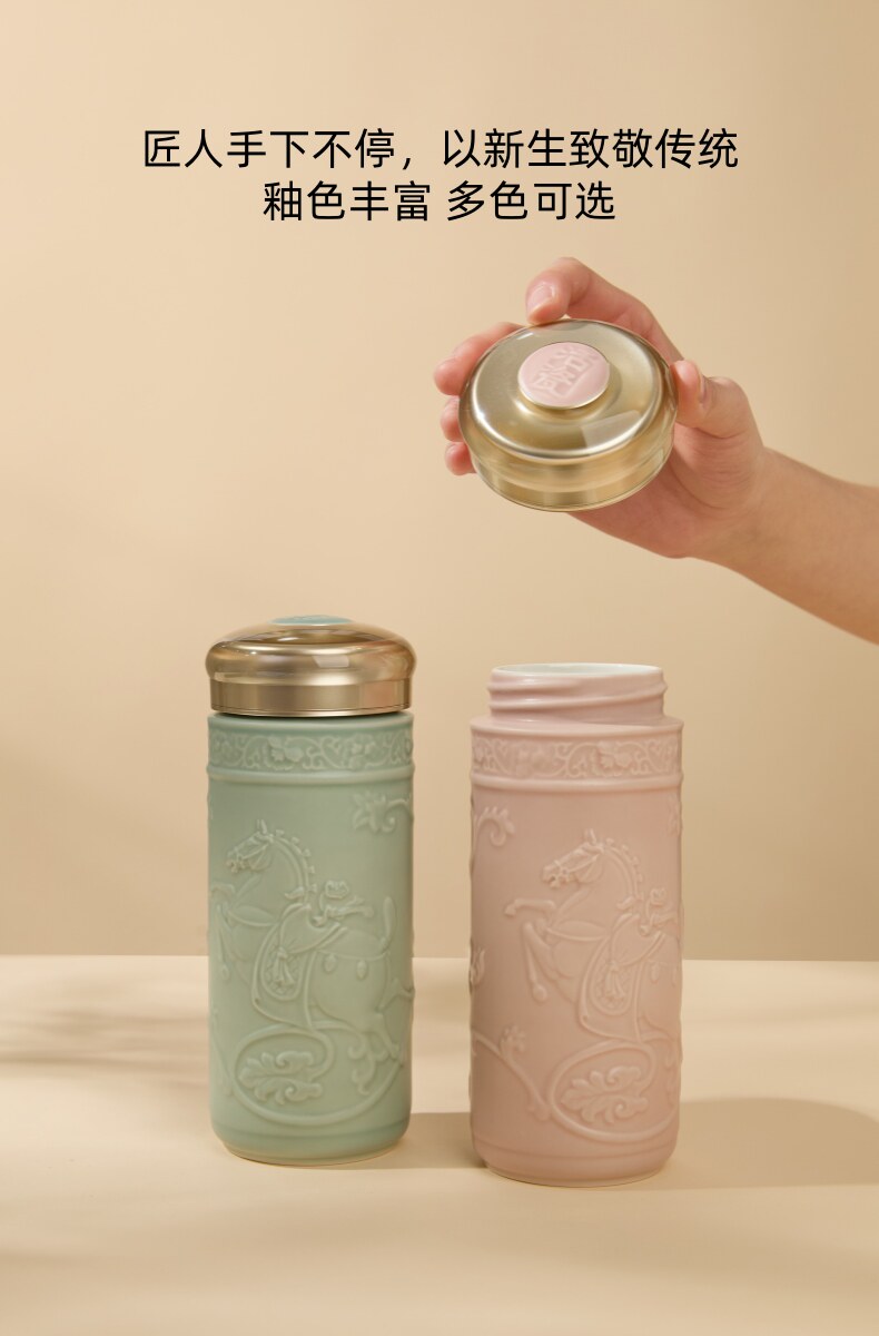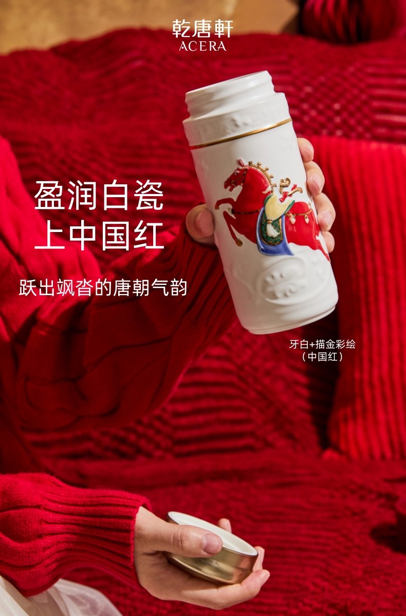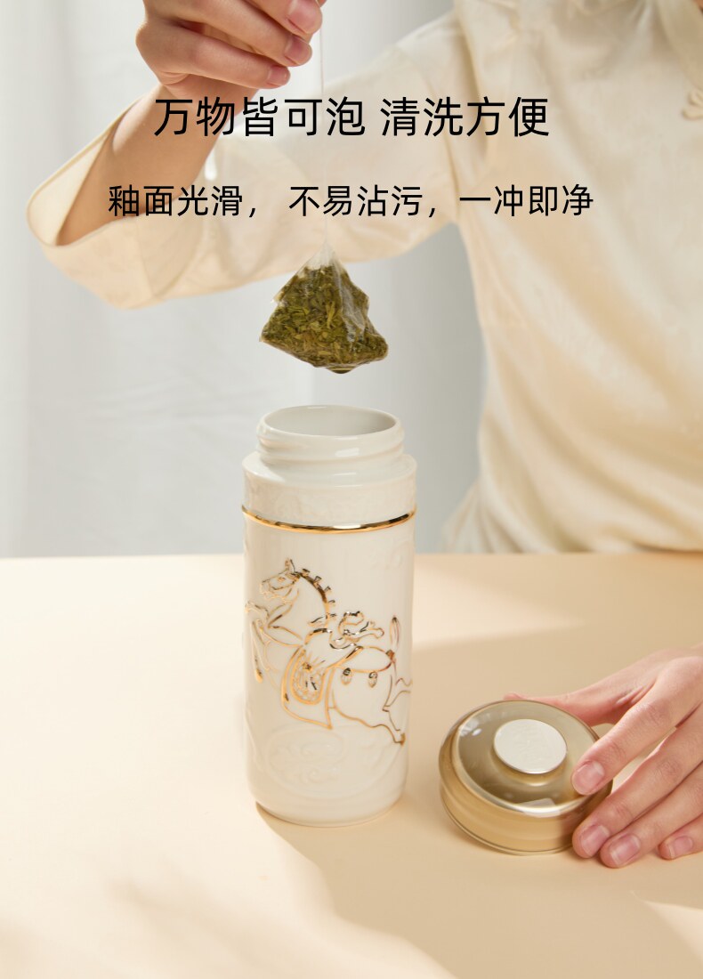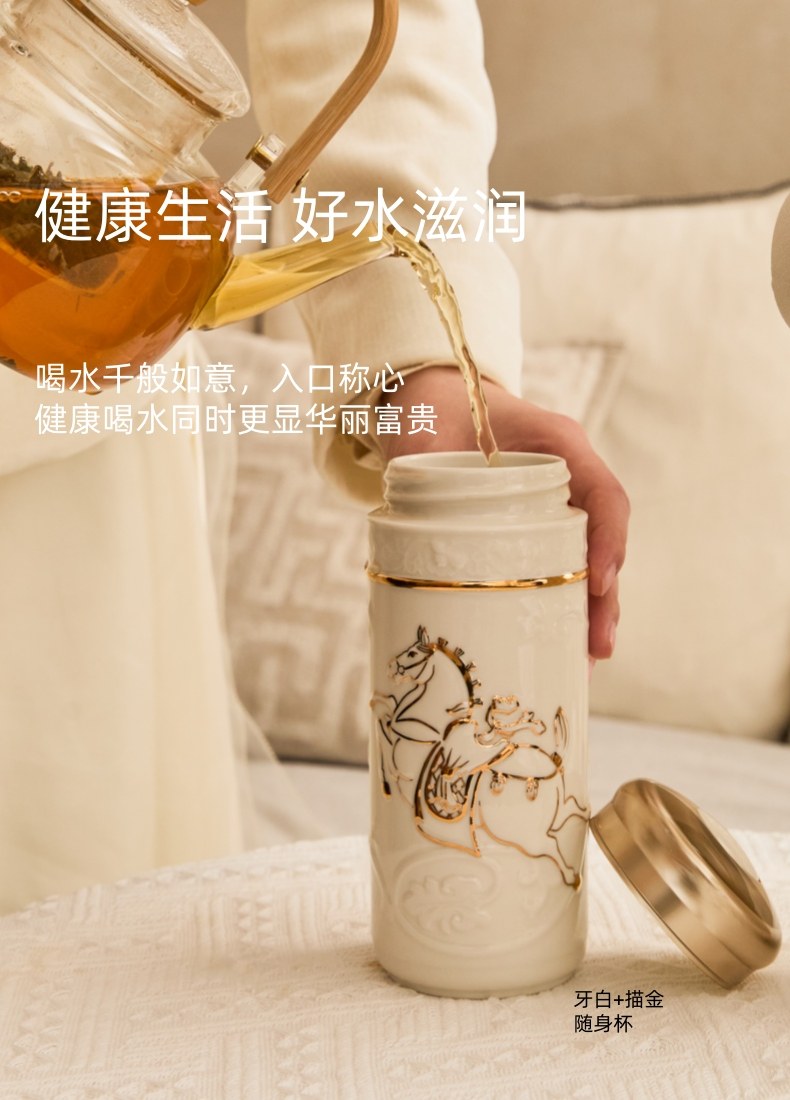 乾唐轩马上如意双层随身杯330ml(透明白+手工描金)