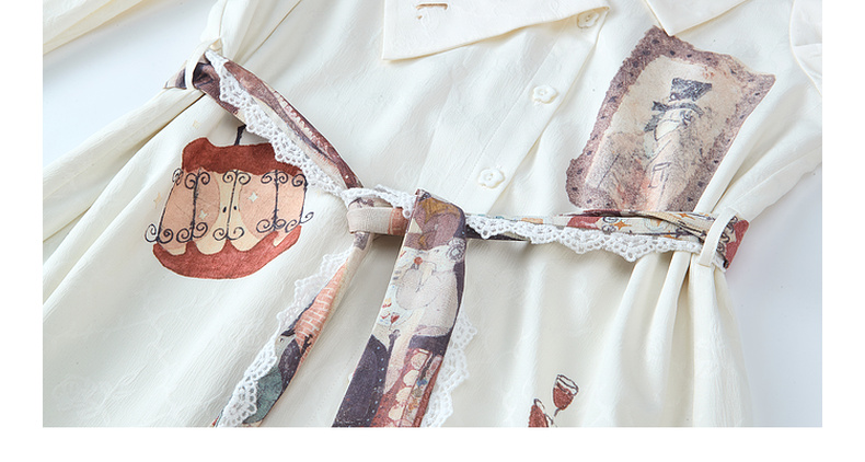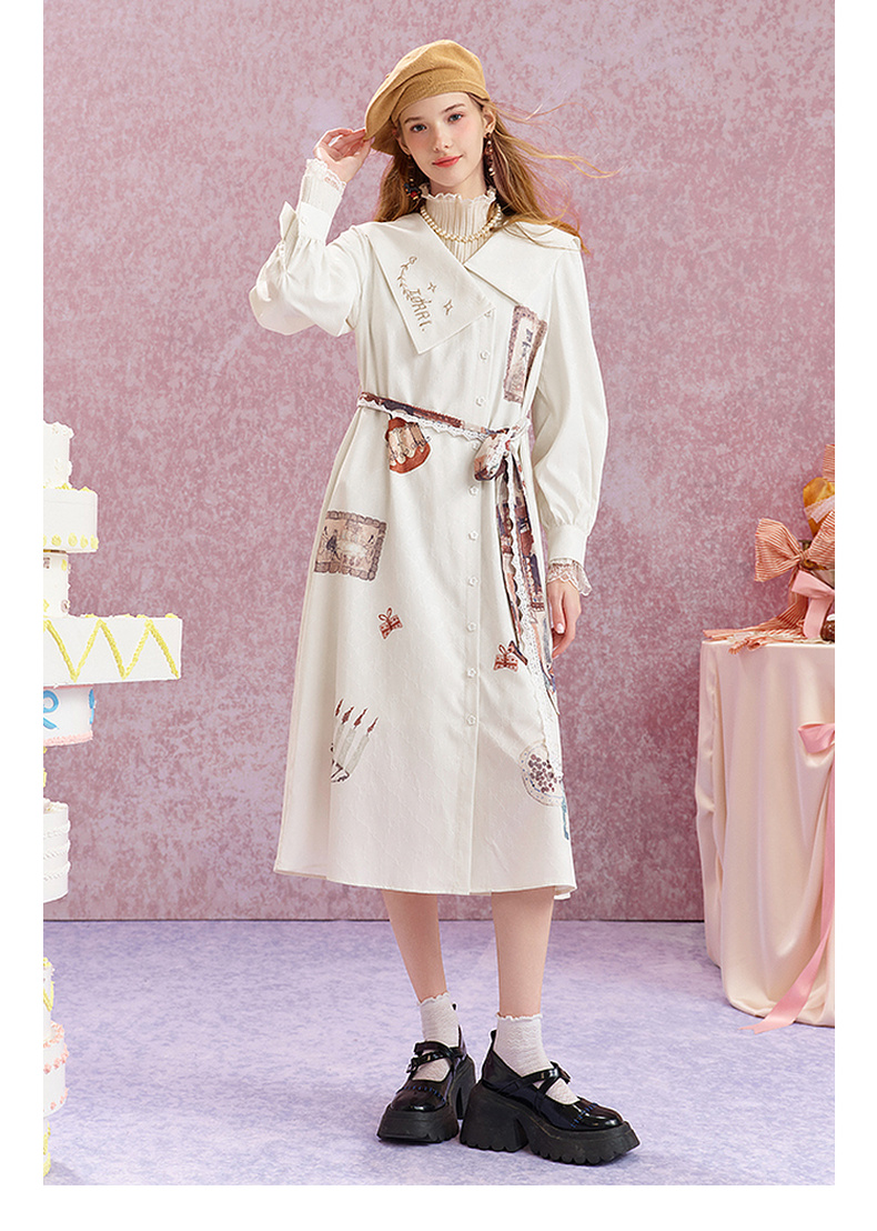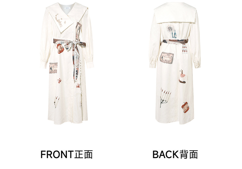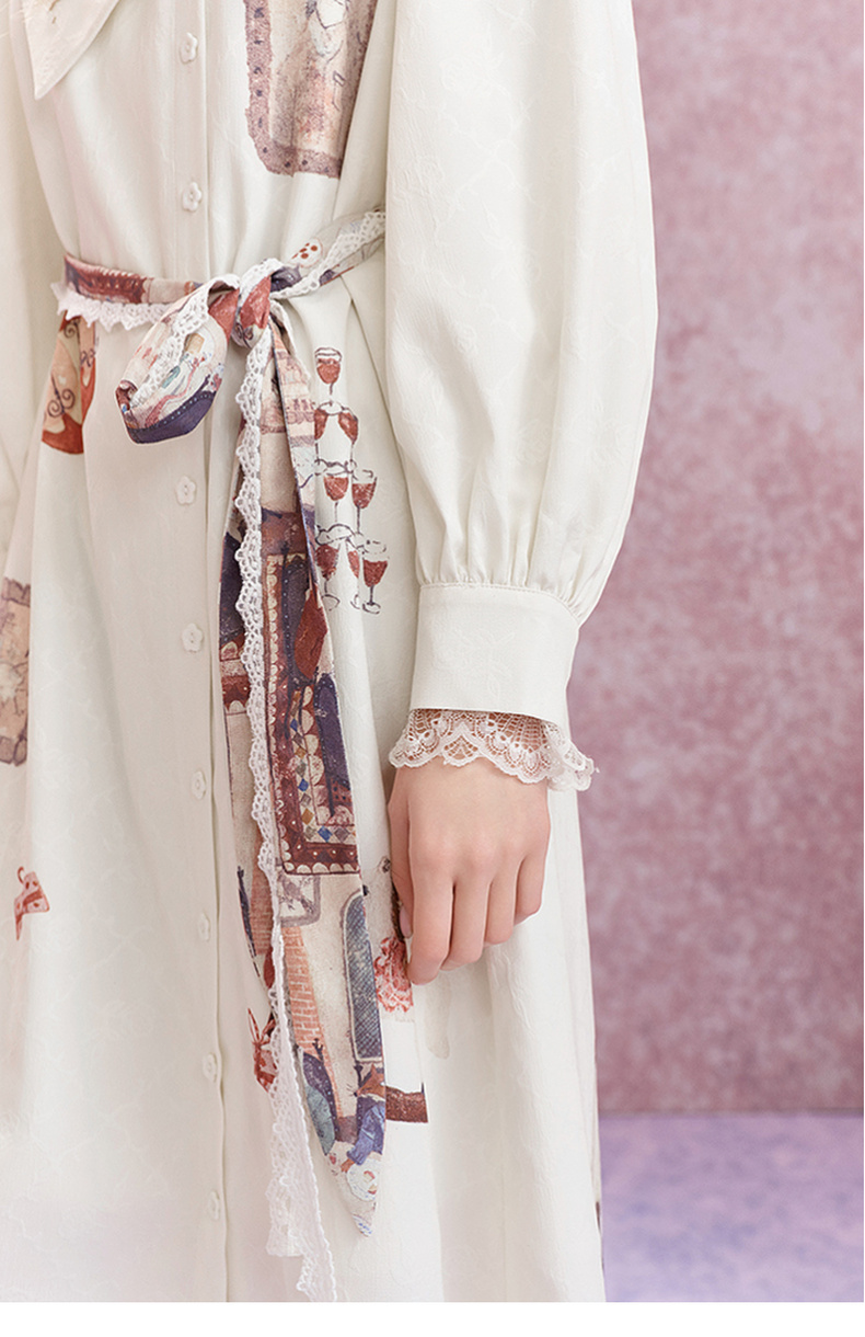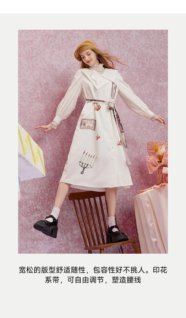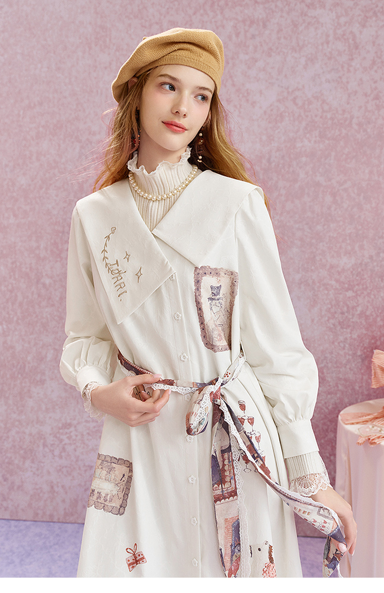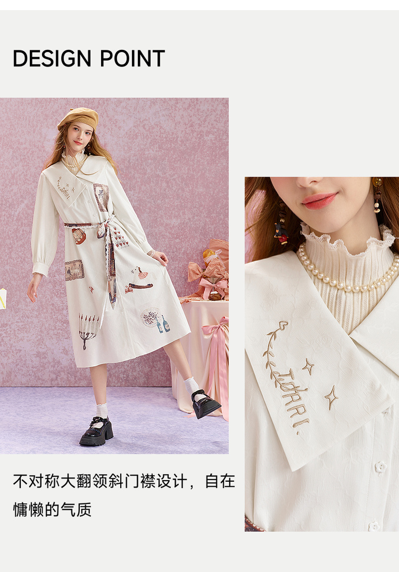两三事 旋转画廊 2025秋季新款甜美印花刺绣不对称翻领绑带连衣裙